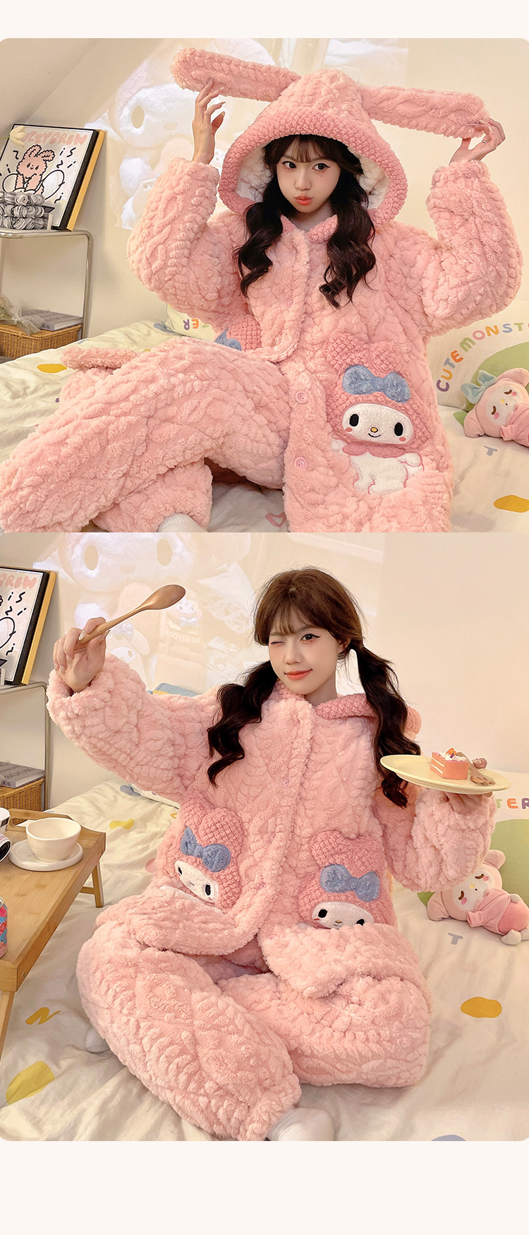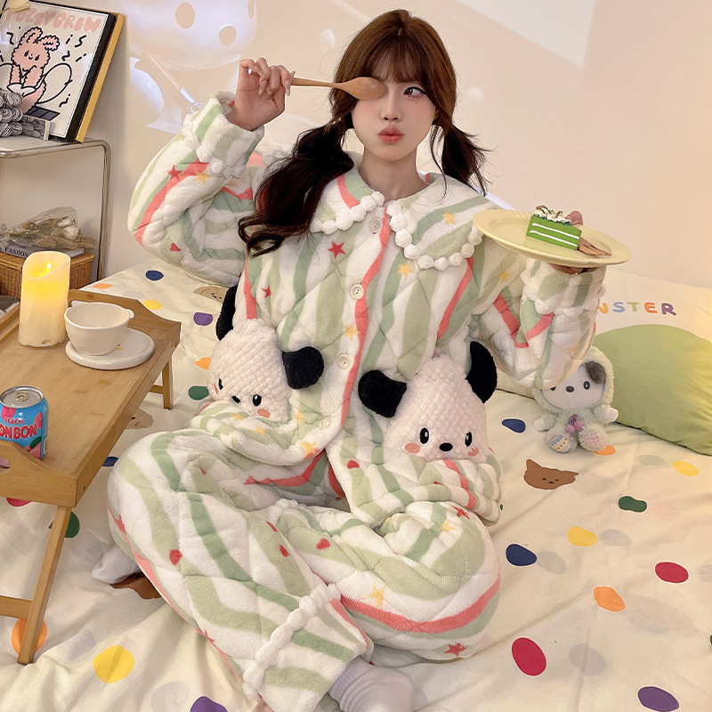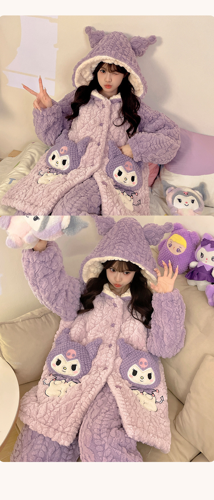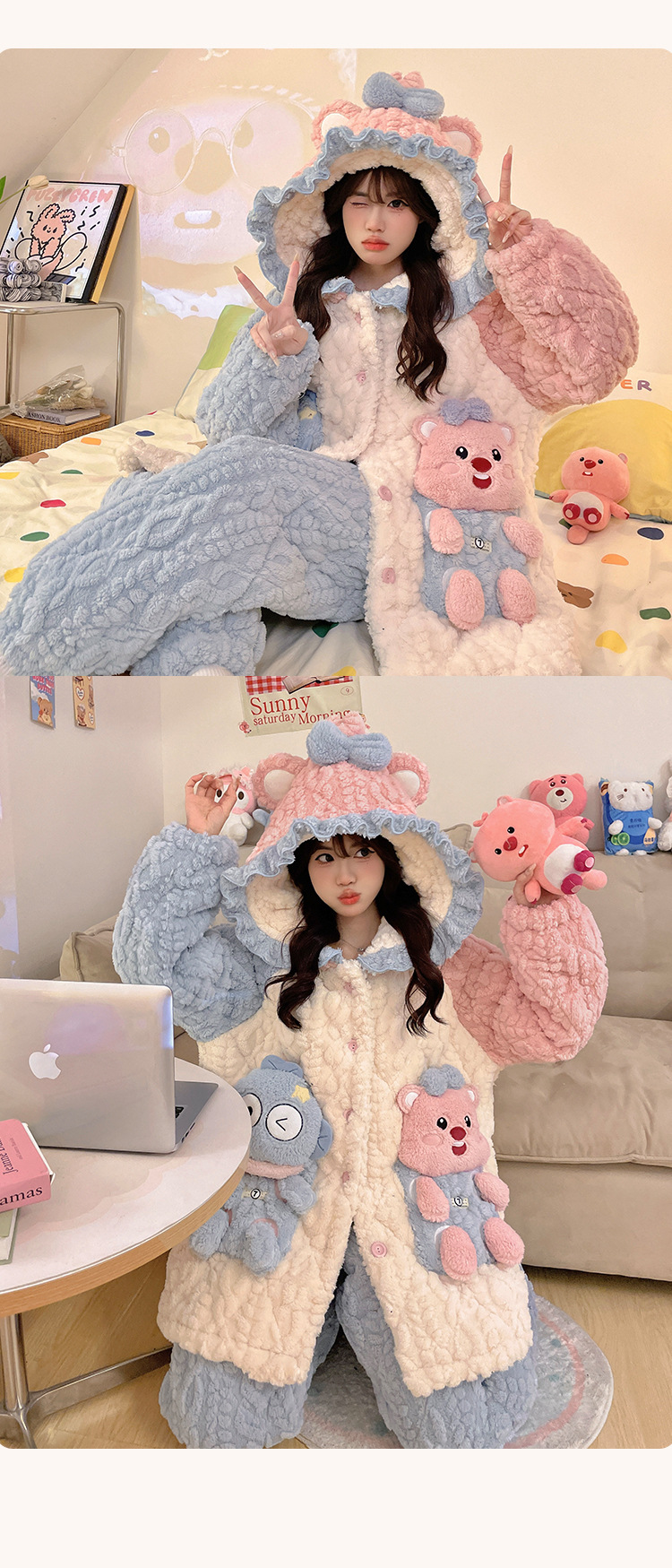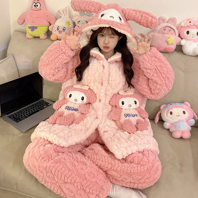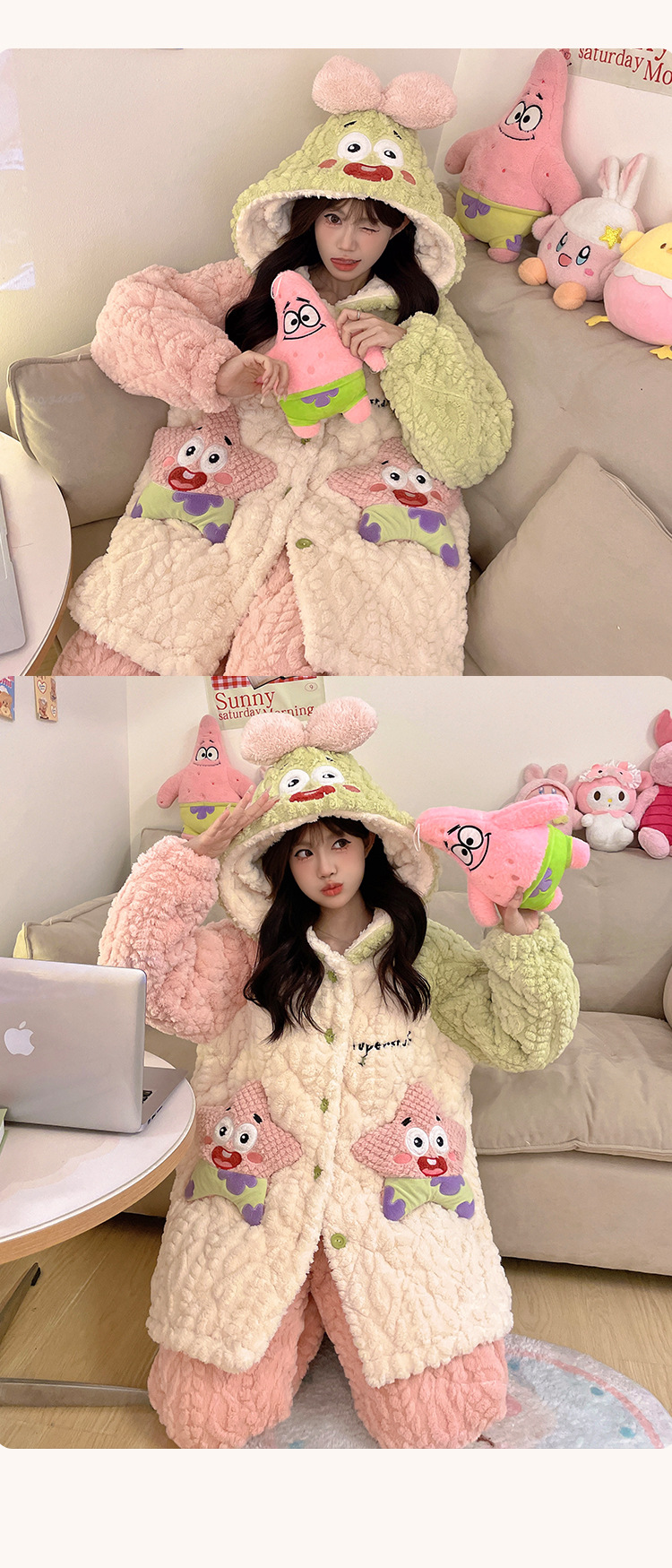 산호 양털 퀼트 3 층 두꺼운 잠옷 여자의 겨울 지퍼 후드 새로운 스타일 가정 옷 플란넬 기모 따뜻한