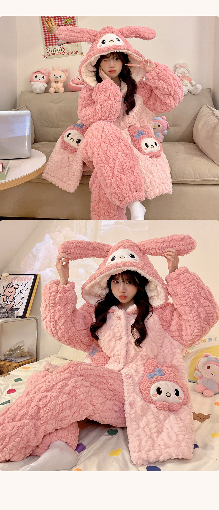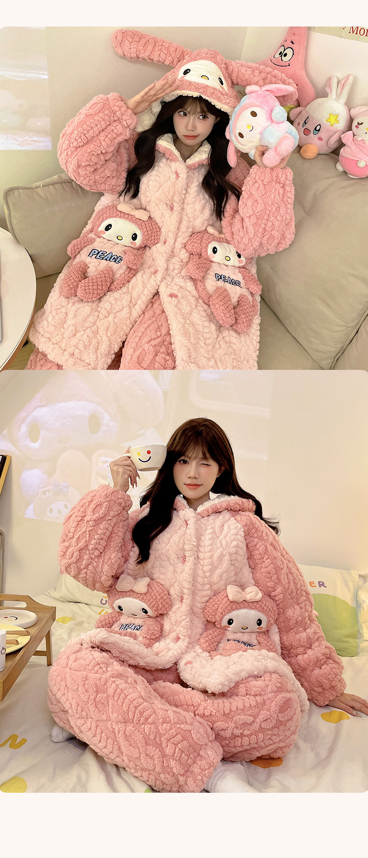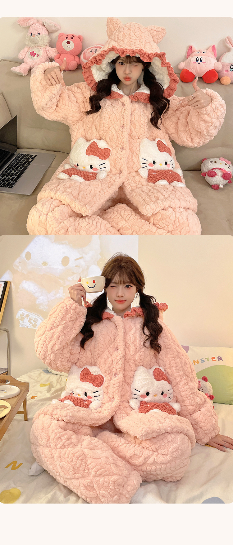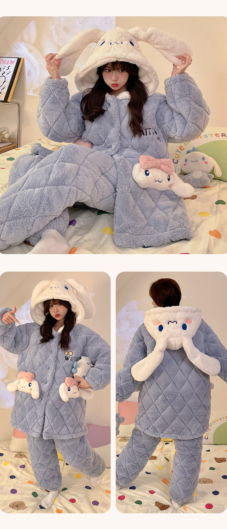 산호 양털 퀼트 3 층 두꺼운 잠옷 여자의 겨울 지퍼 후드 새로운 스타일 가정 옷 플란넬 기모 따뜻한