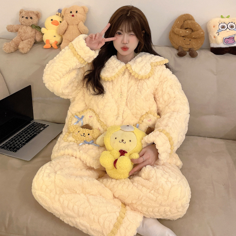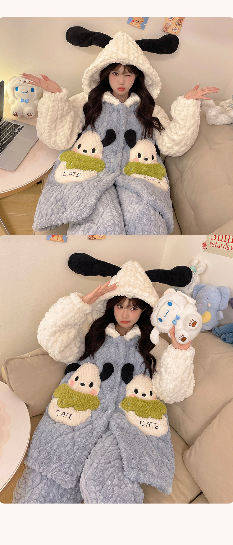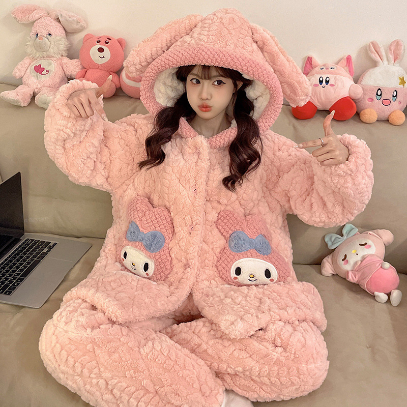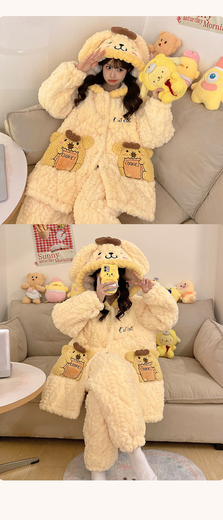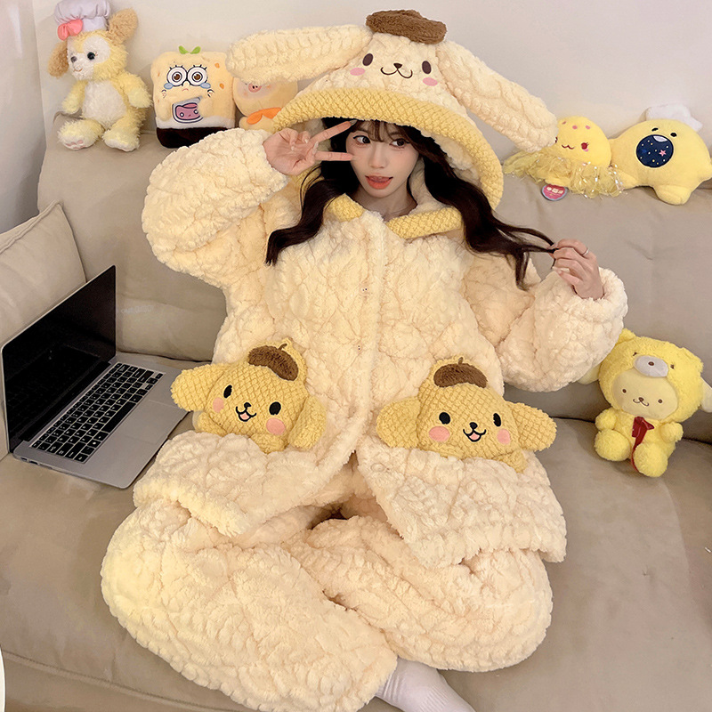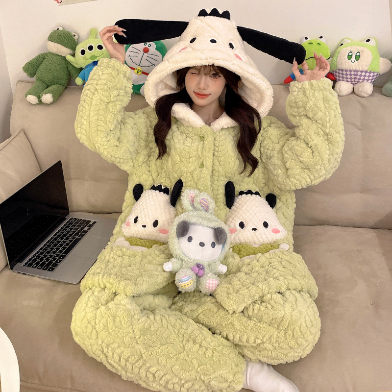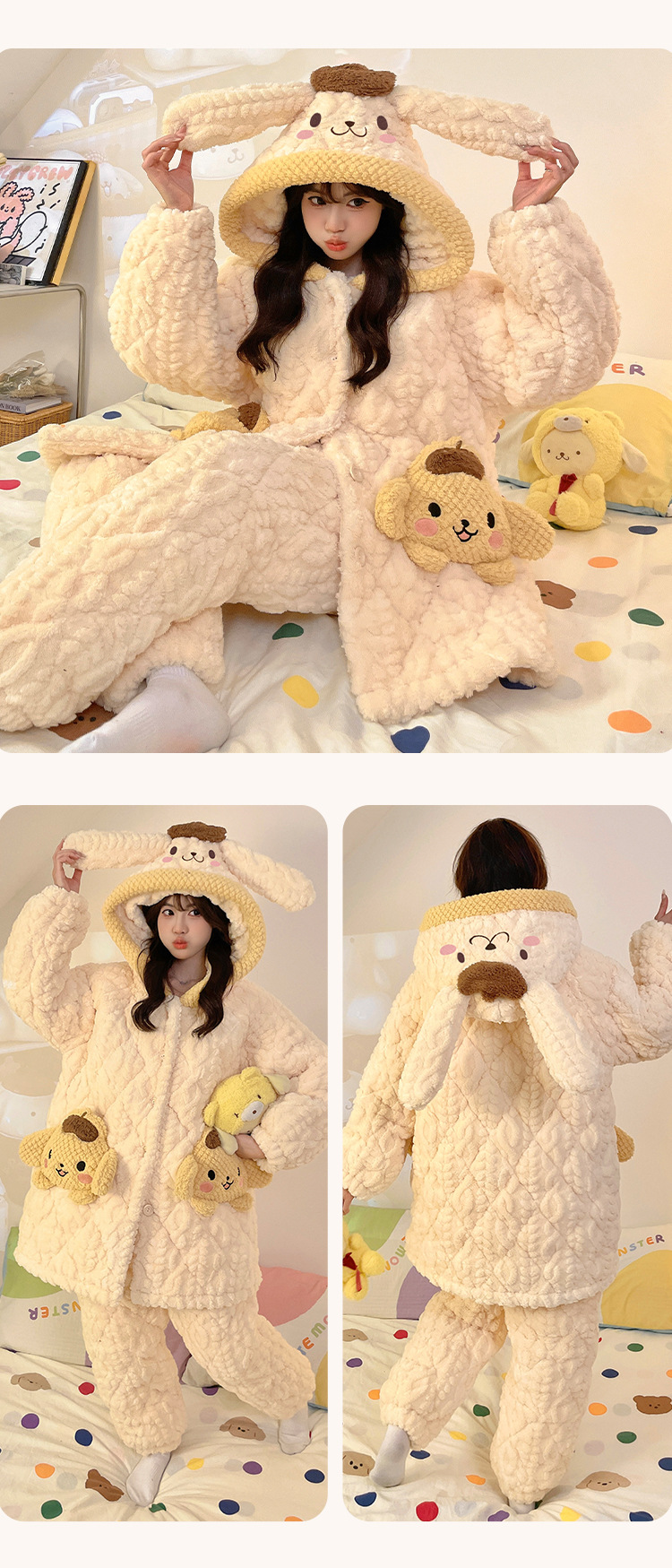 산호 양털 퀼트 3 층 두꺼운 잠옷 여자의 겨울 지퍼 후드 새로운 스타일 가정 옷 플란넬 기모 따뜻한