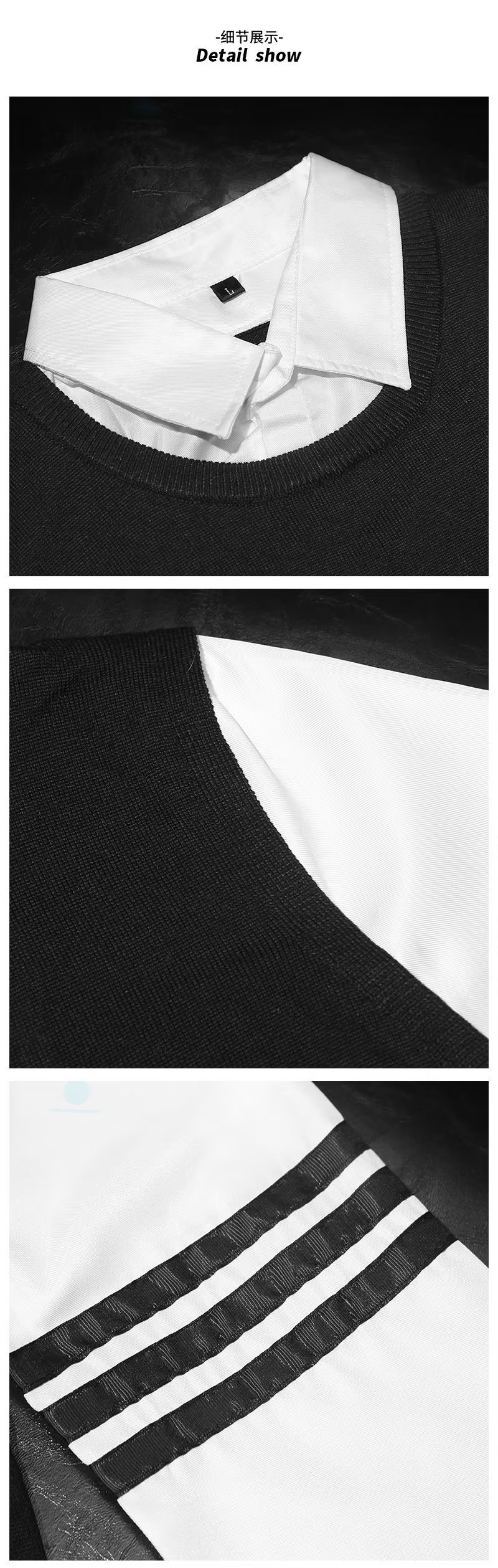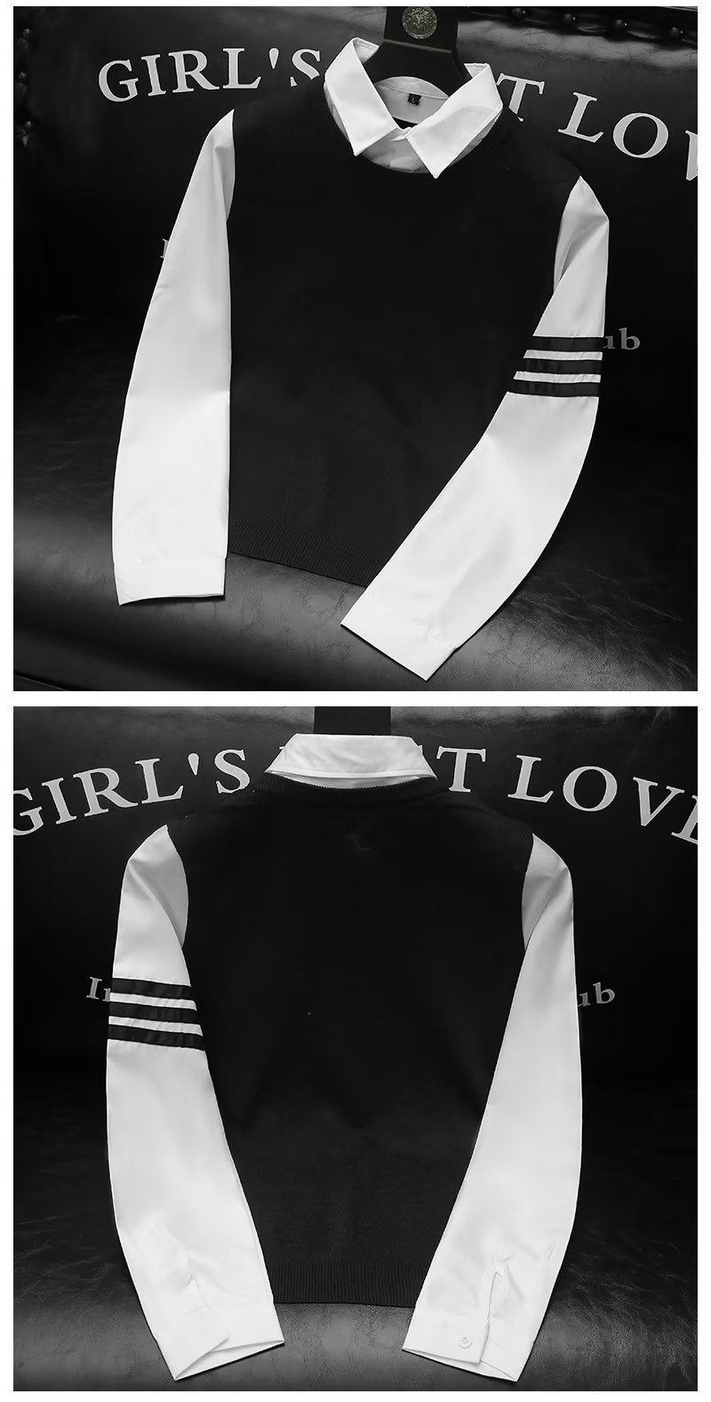 2023 홍콩 스타일 봄과 가을 가짜 투피스 스티칭 셔츠 칼라 니트웨어 남성용 슬림핏 쓰리 바 긴팔 트렌디 남성 스웨터