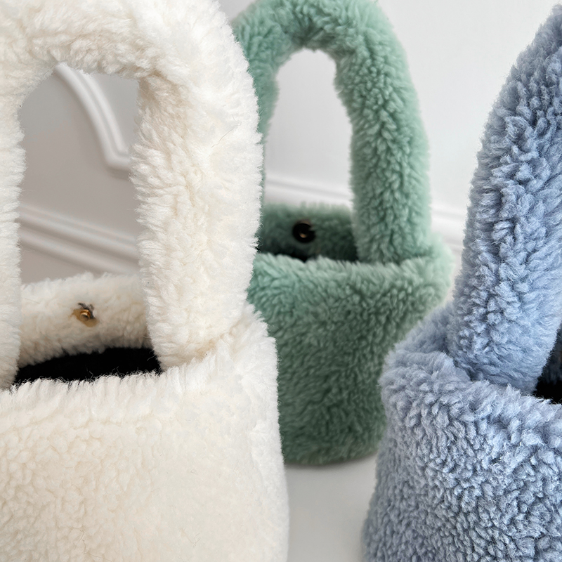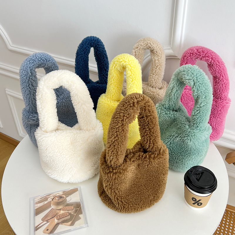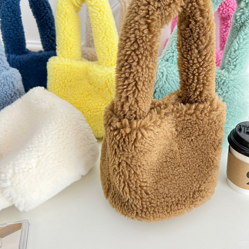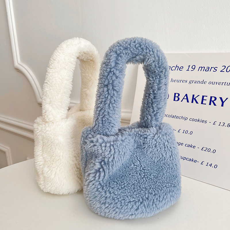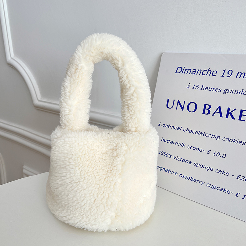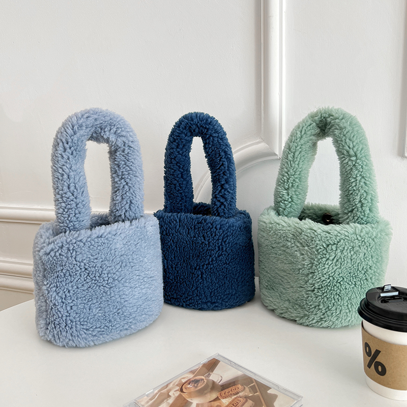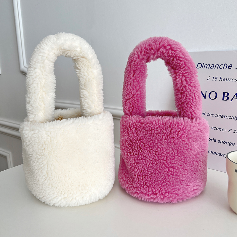 모조 양고기 푹신한 가방 작은 가방 여자의 겨울 새로운 단색 핸드백 작은 푹신한 버킷 가방스토어 가기