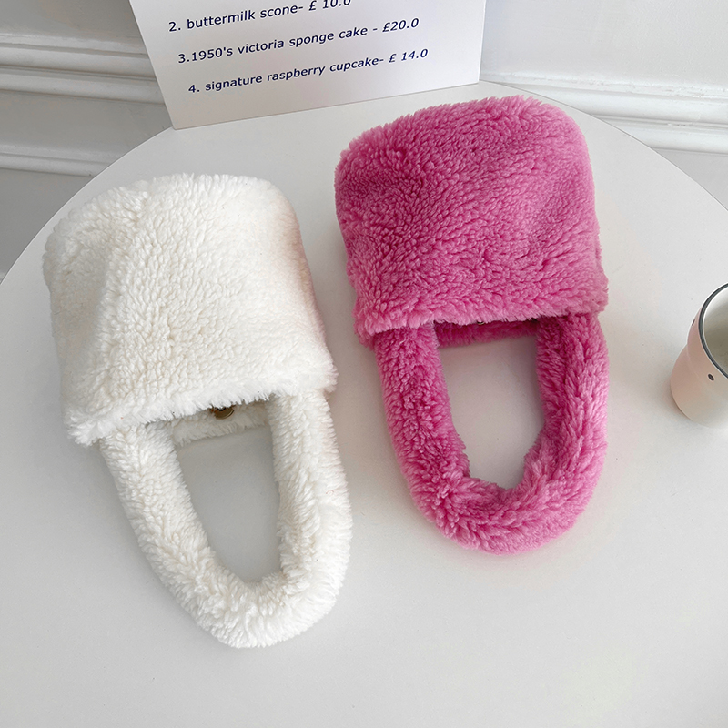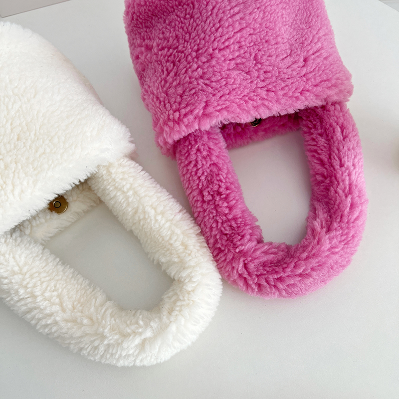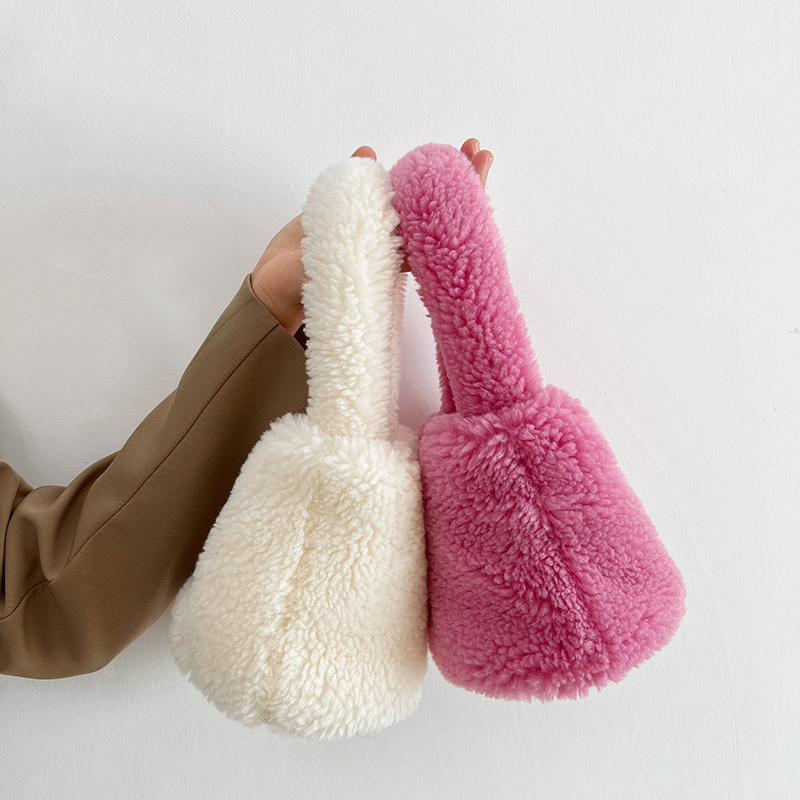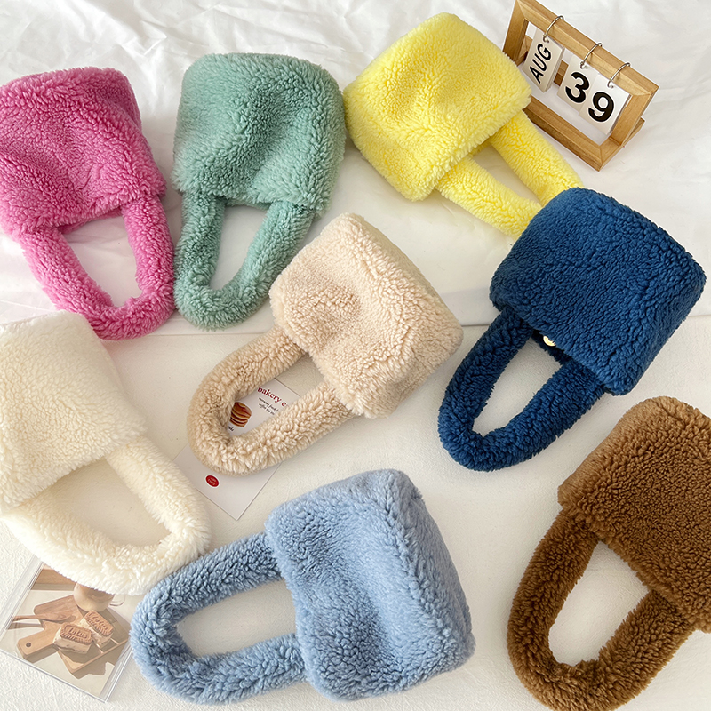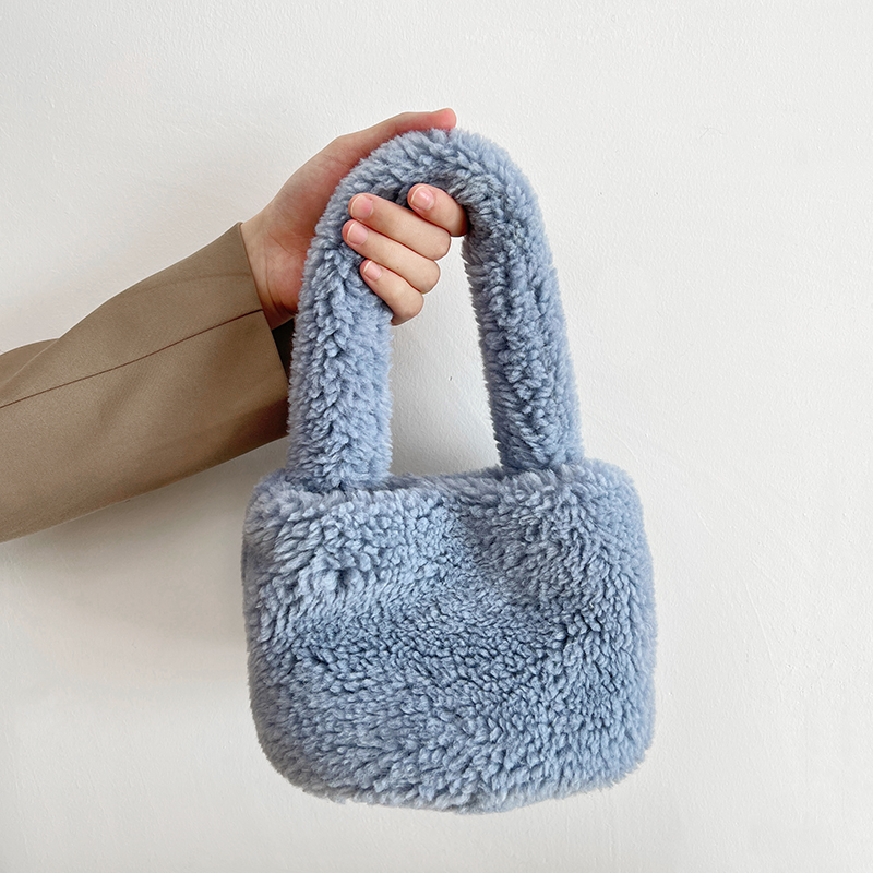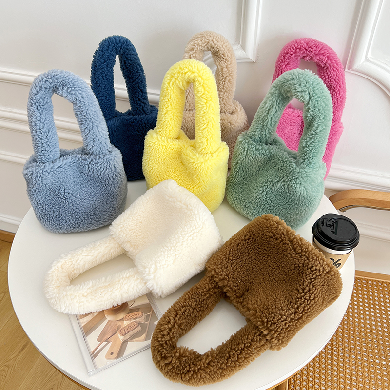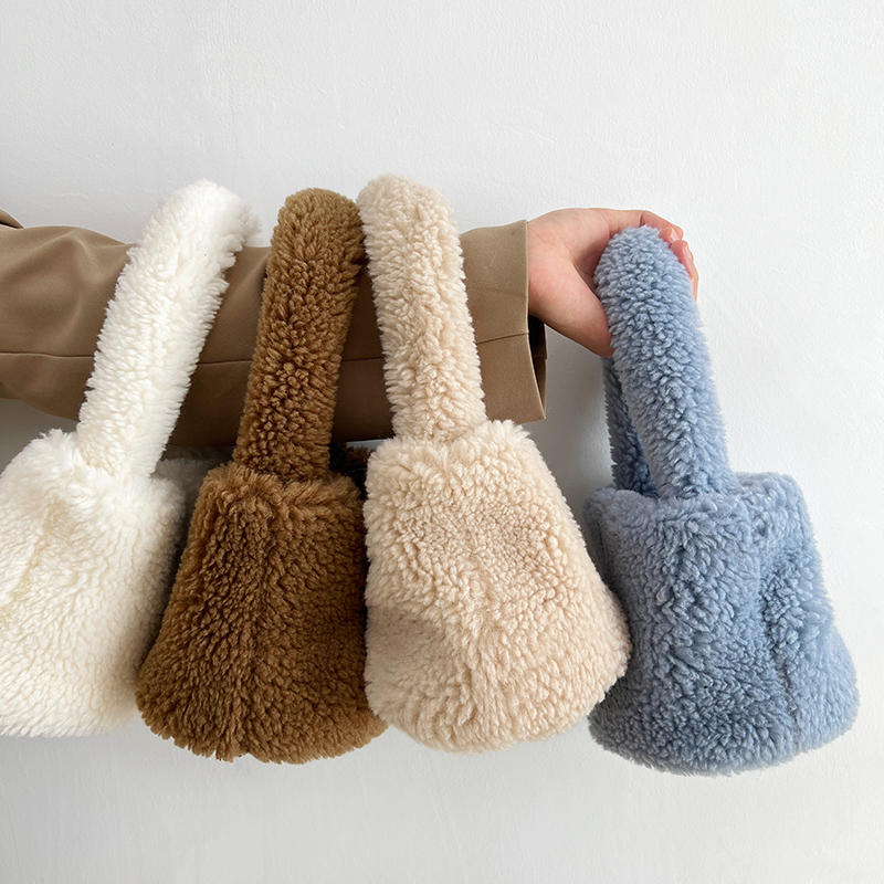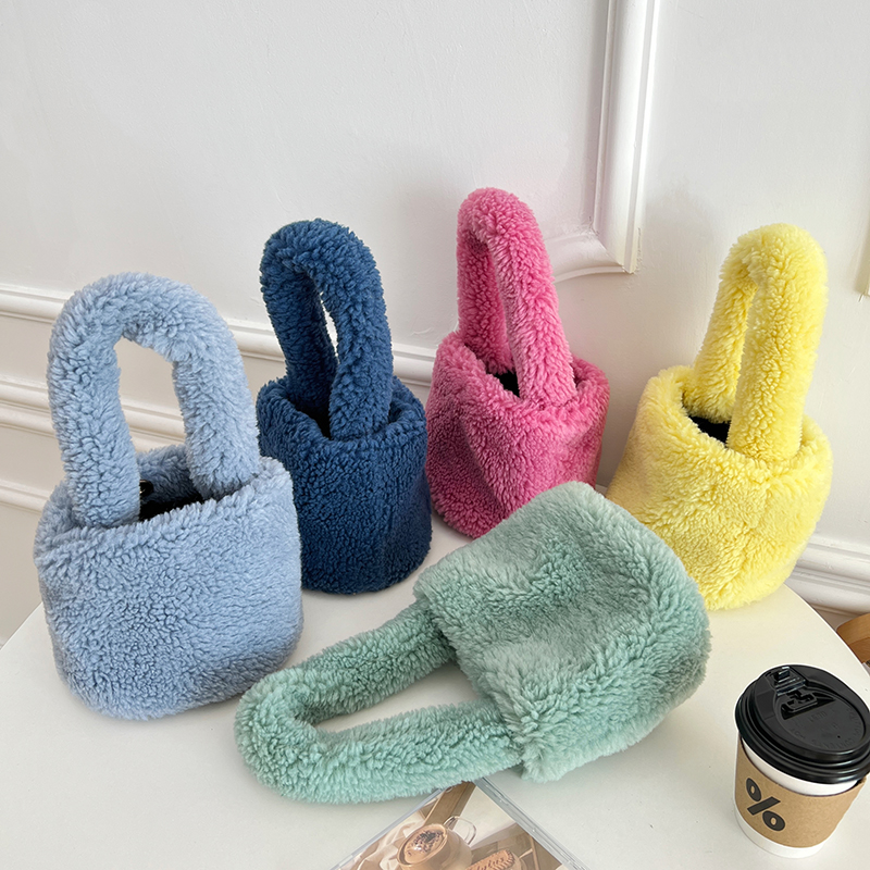 모조 양고기 푹신한 가방 작은 가방 여자의 겨울 새로운 단색 핸드백 작은 푹신한 버킷 가방스토어 가기