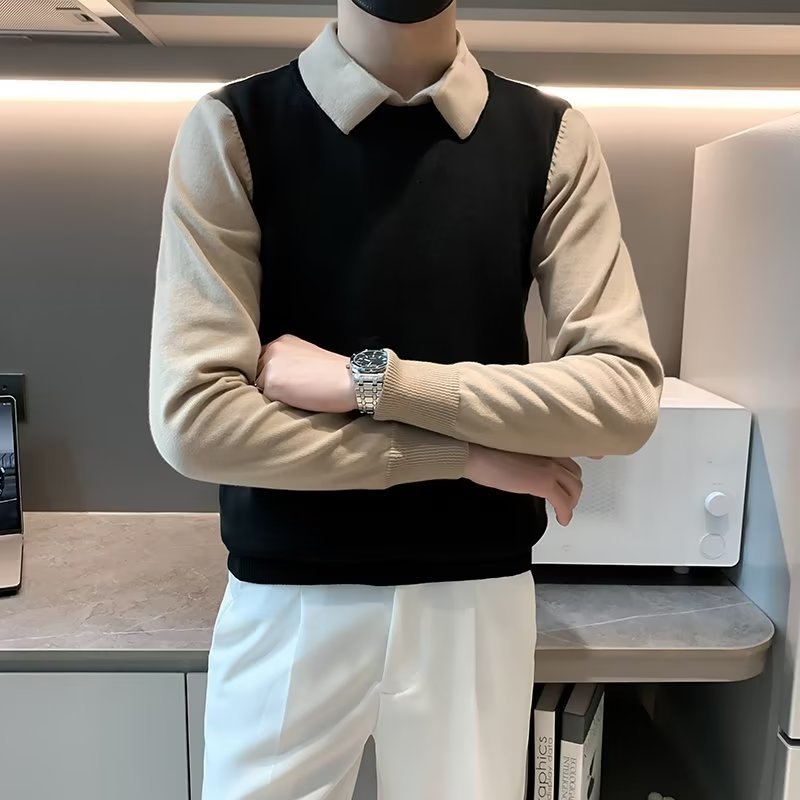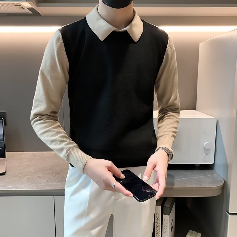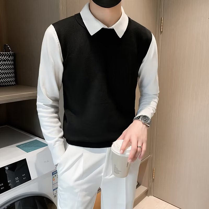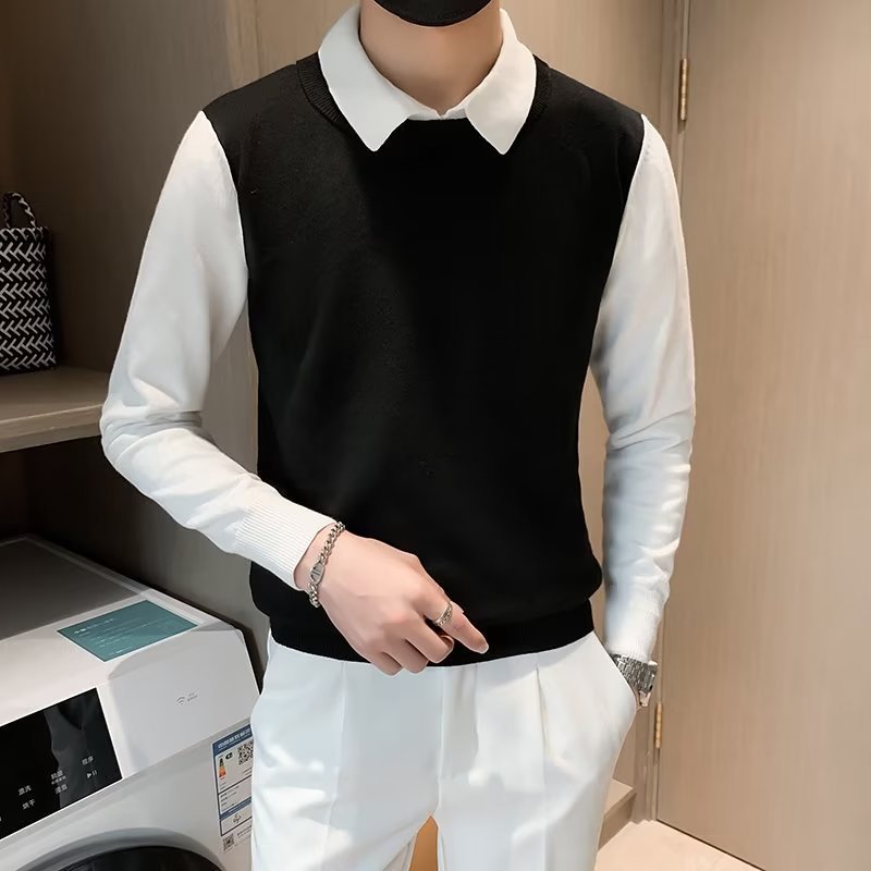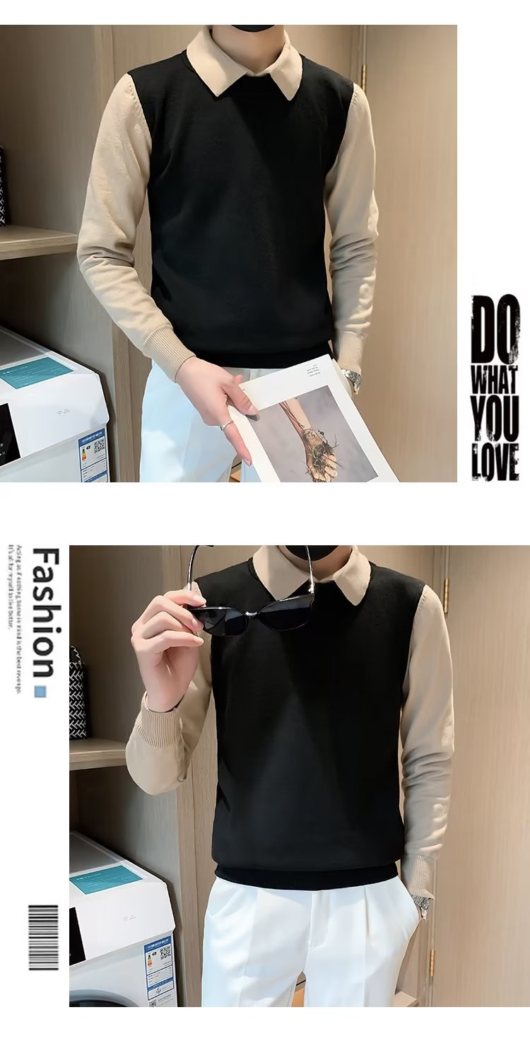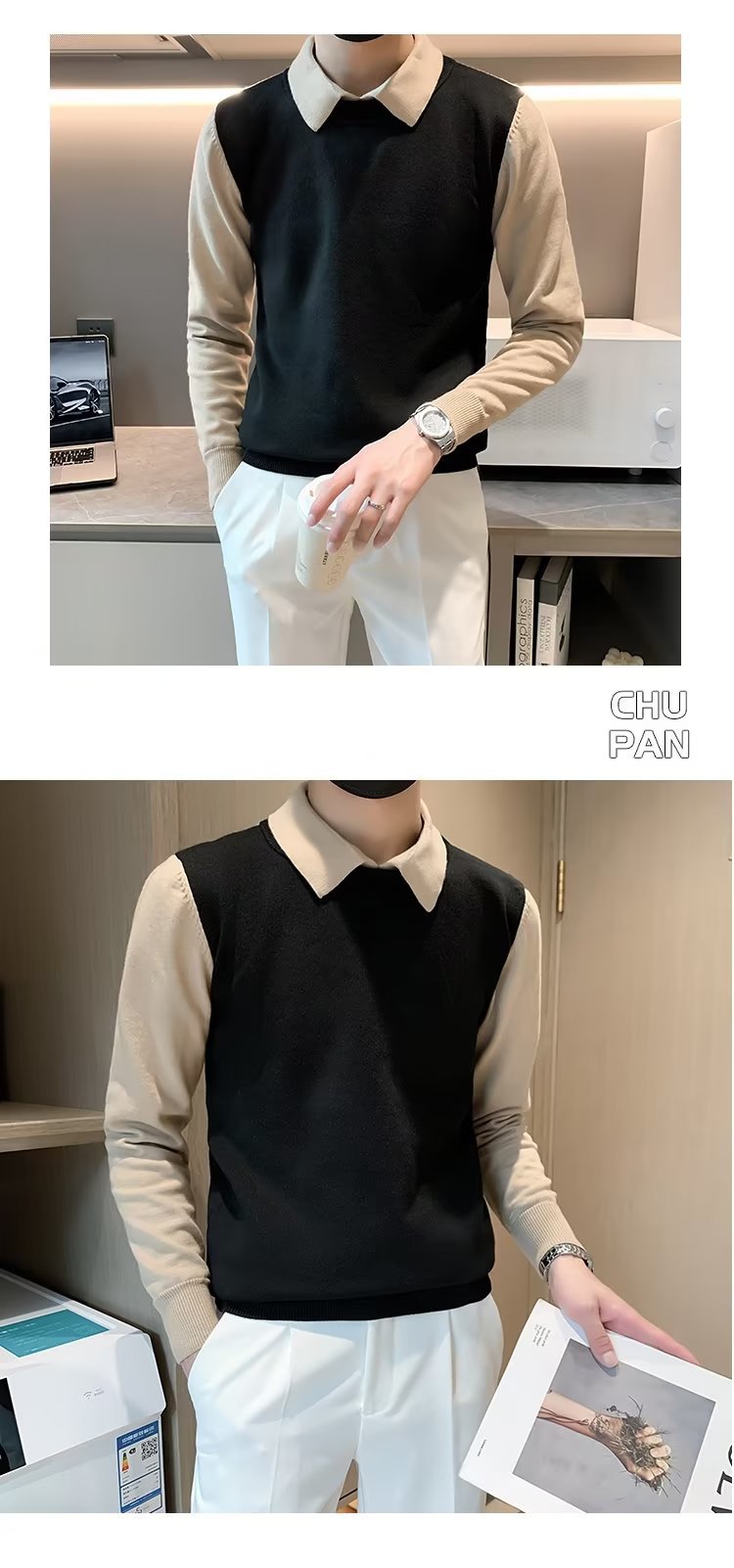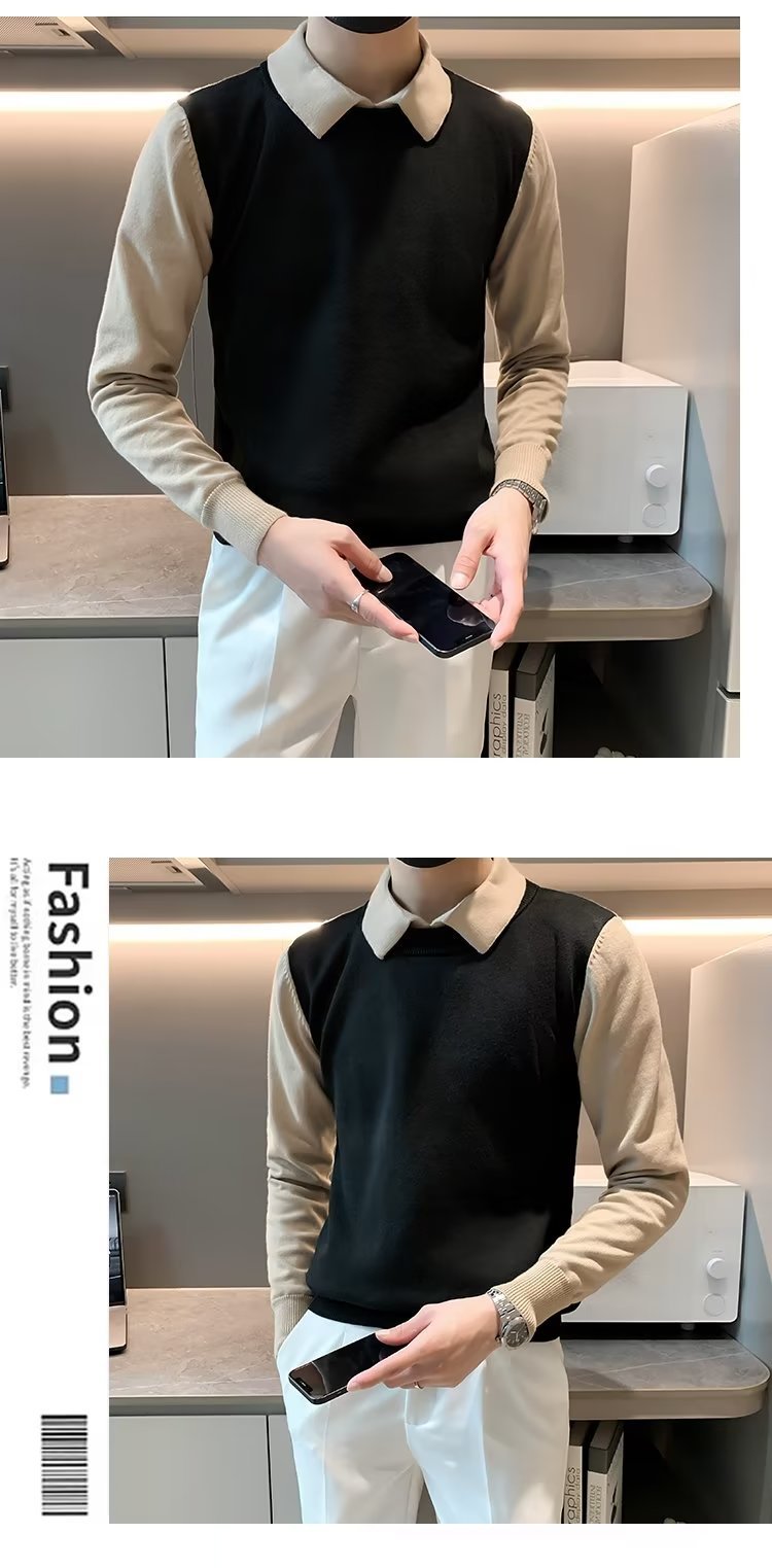 가을 가짜 투피스 니트 스웨터 남성용 스트라이프 셔츠 칼라 새로운 남성용 긴팔 겉옷 스웨터 2024 트렌디 한 남성용 가을과 겨울스토어 가기