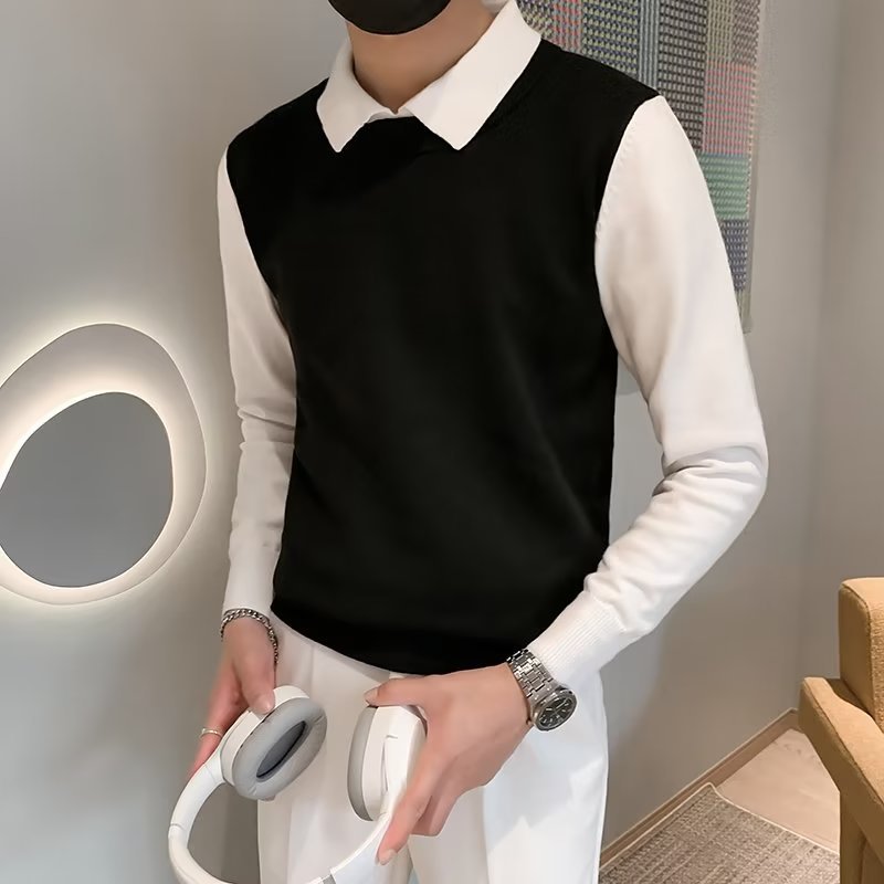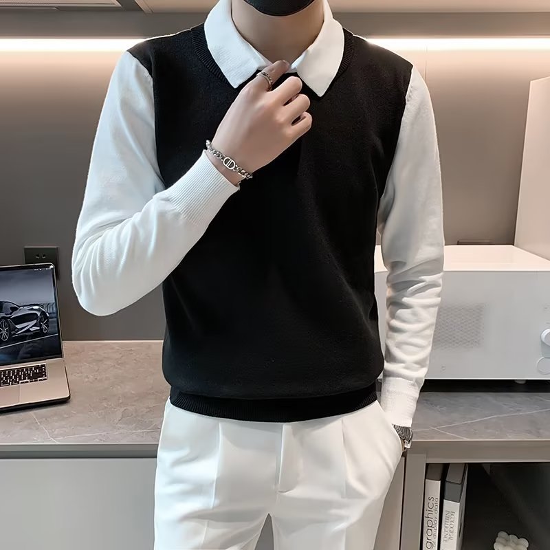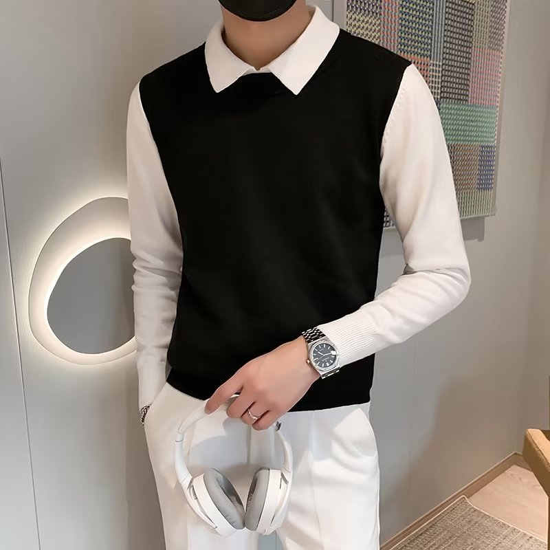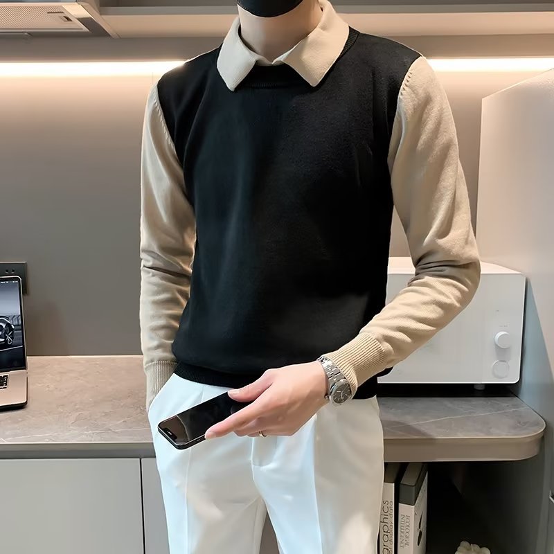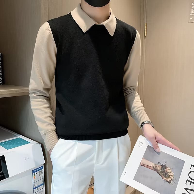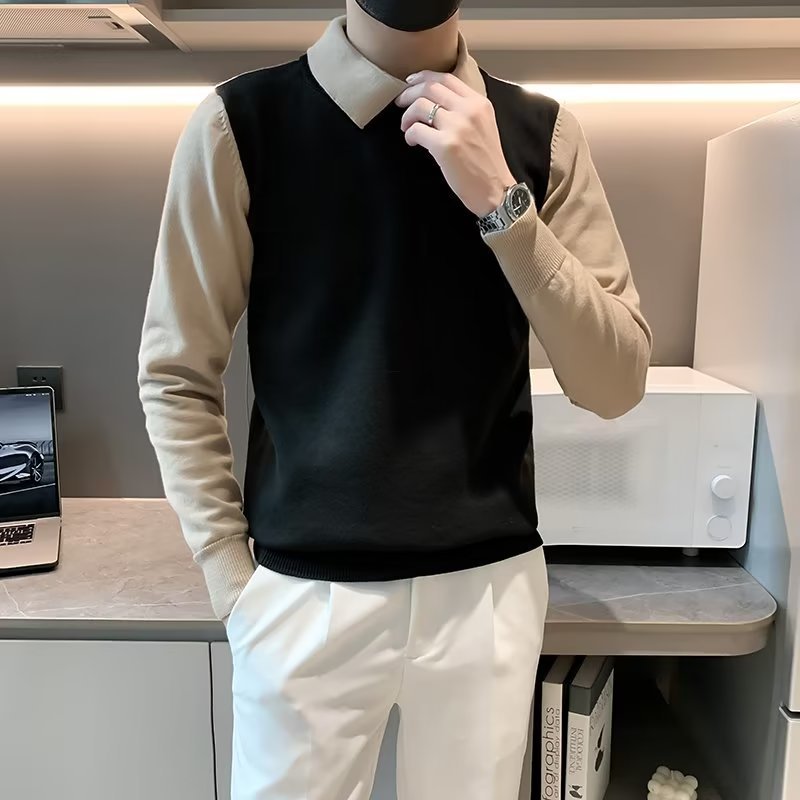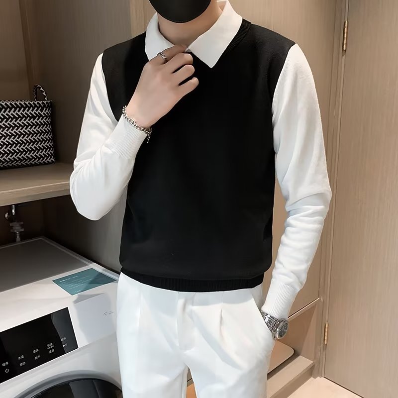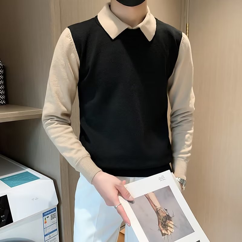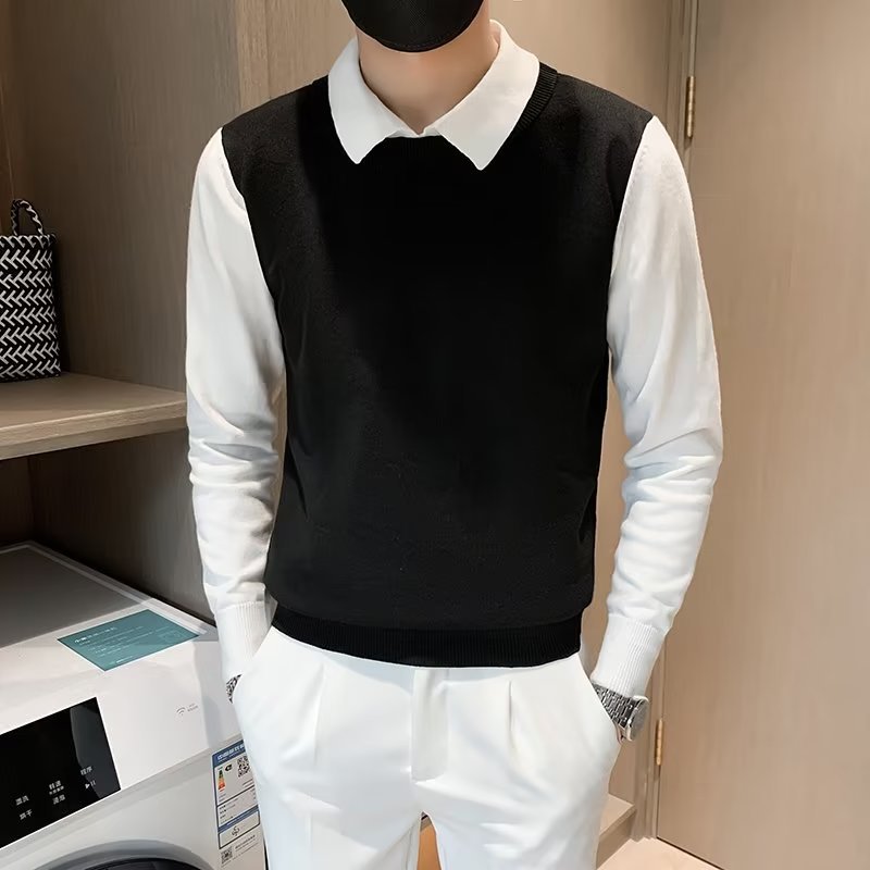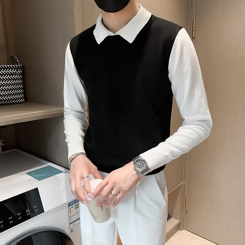 가을 가짜 투피스 니트 스웨터 남성용 스트라이프 셔츠 칼라 새로운 남성용 긴팔 겉옷 스웨터 2024 트렌디 한 남성용 가을과 겨울스토어 가기
