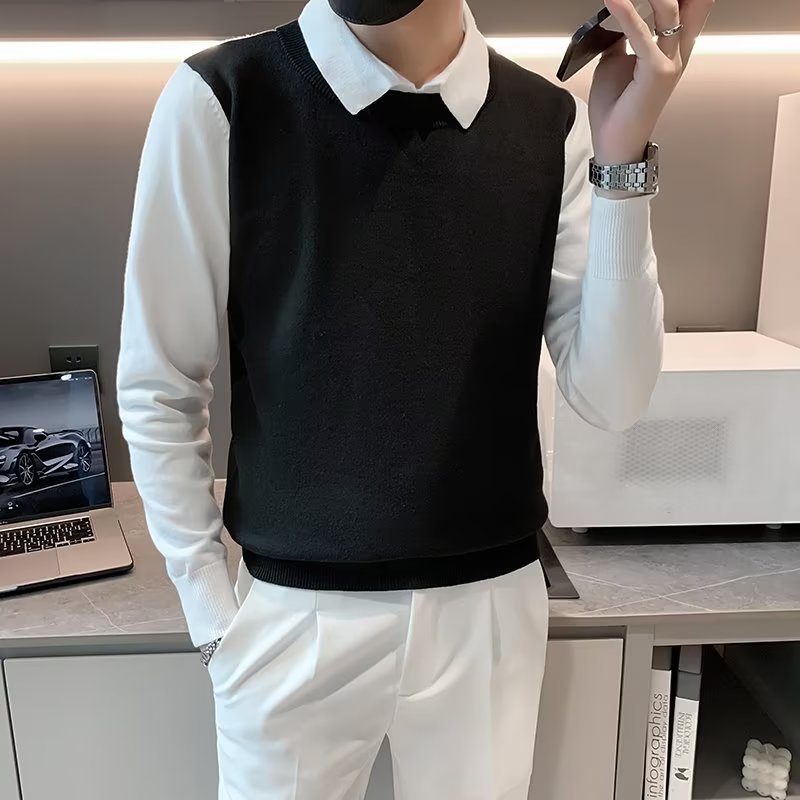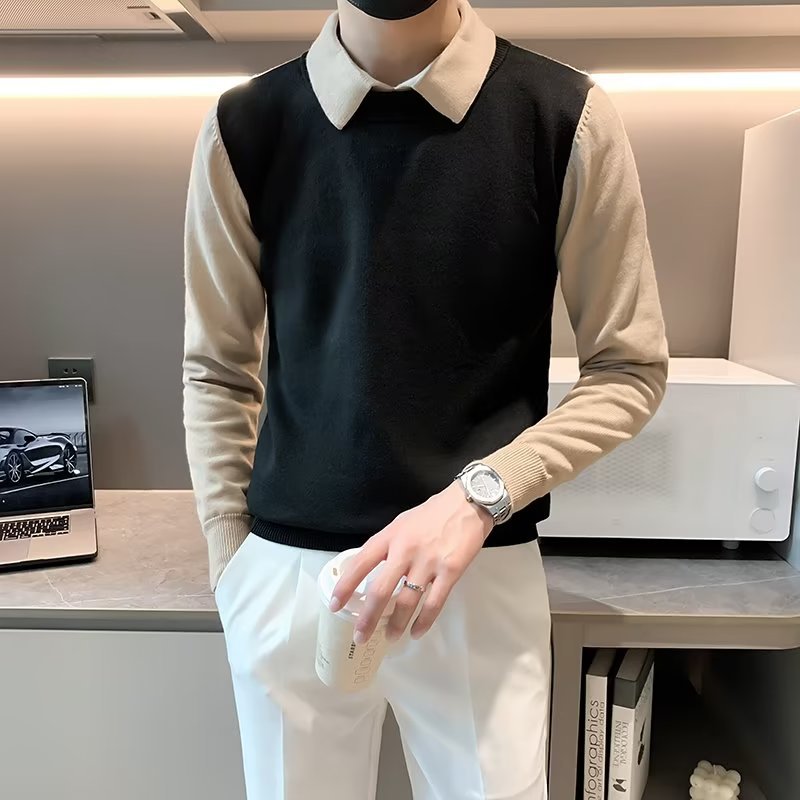 가을 가짜 투피스 니트 스웨터 남성용 스트라이프 셔츠 칼라 새로운 남성용 긴팔 겉옷 스웨터 2024 트렌디 한 남성용 가을과 겨울