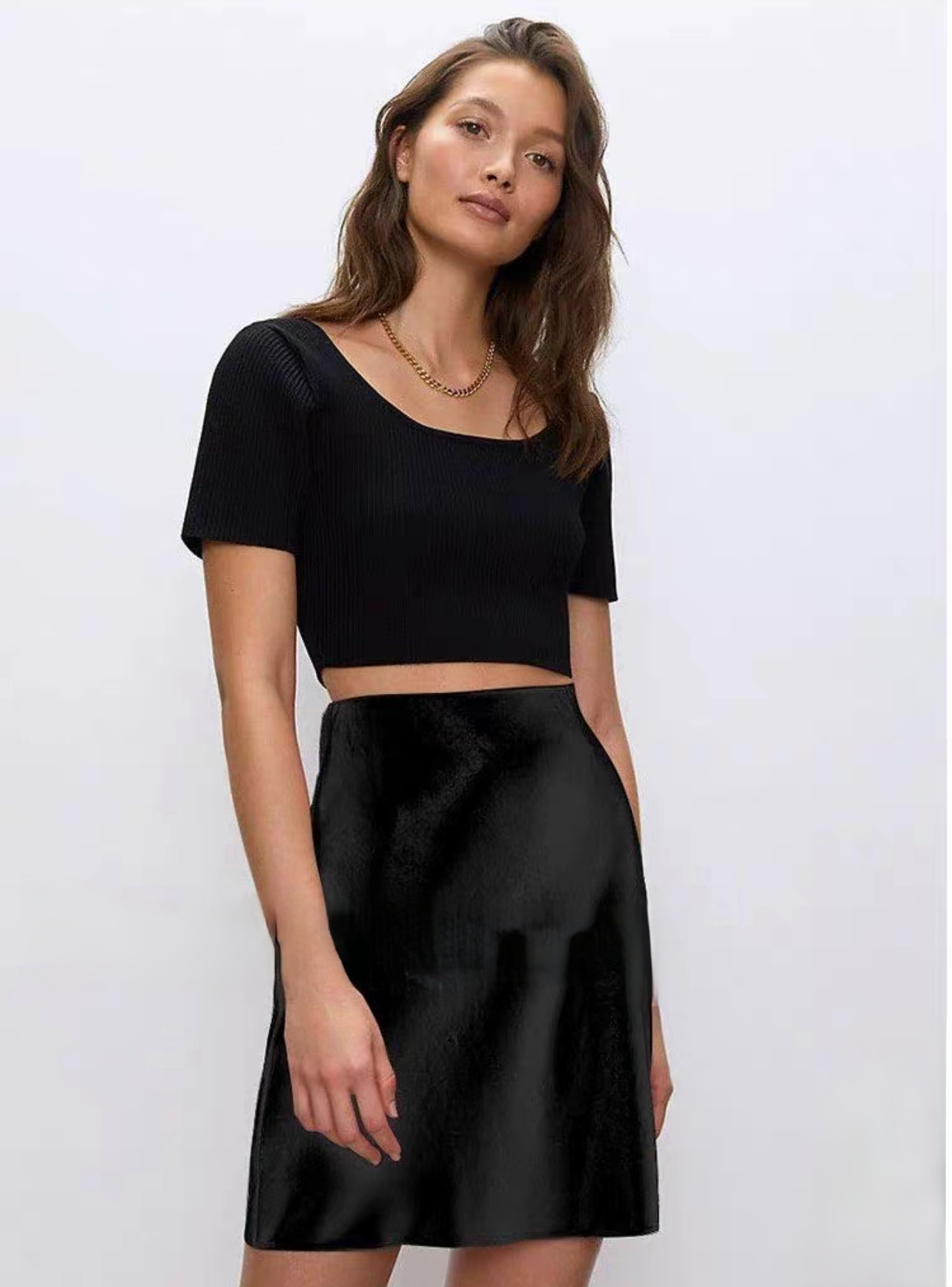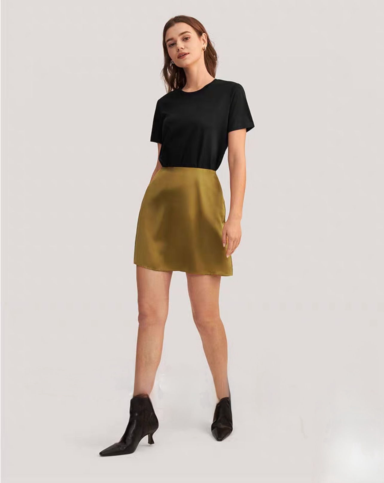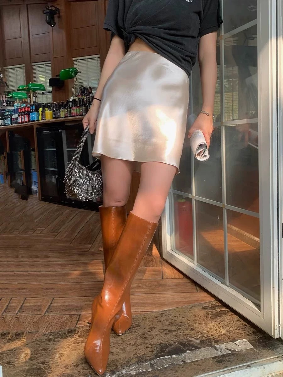 헤비웨이트 수입 삼아세테이트 스커트, 새틴 광택, 신축성 있는 허리, 사선 재단 A라인 머메이드 미니 스커트, 여성용 가을