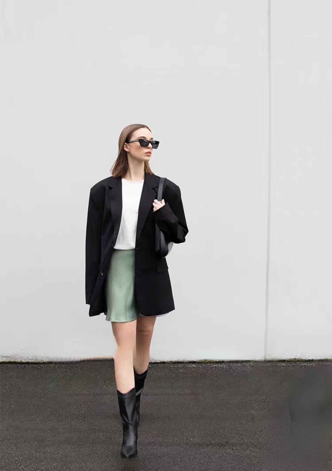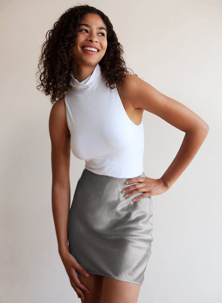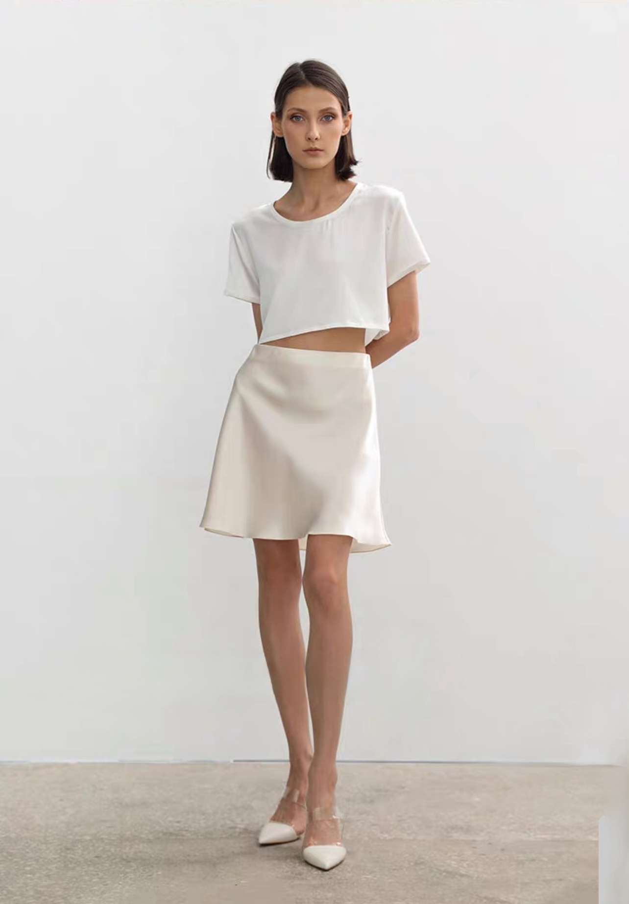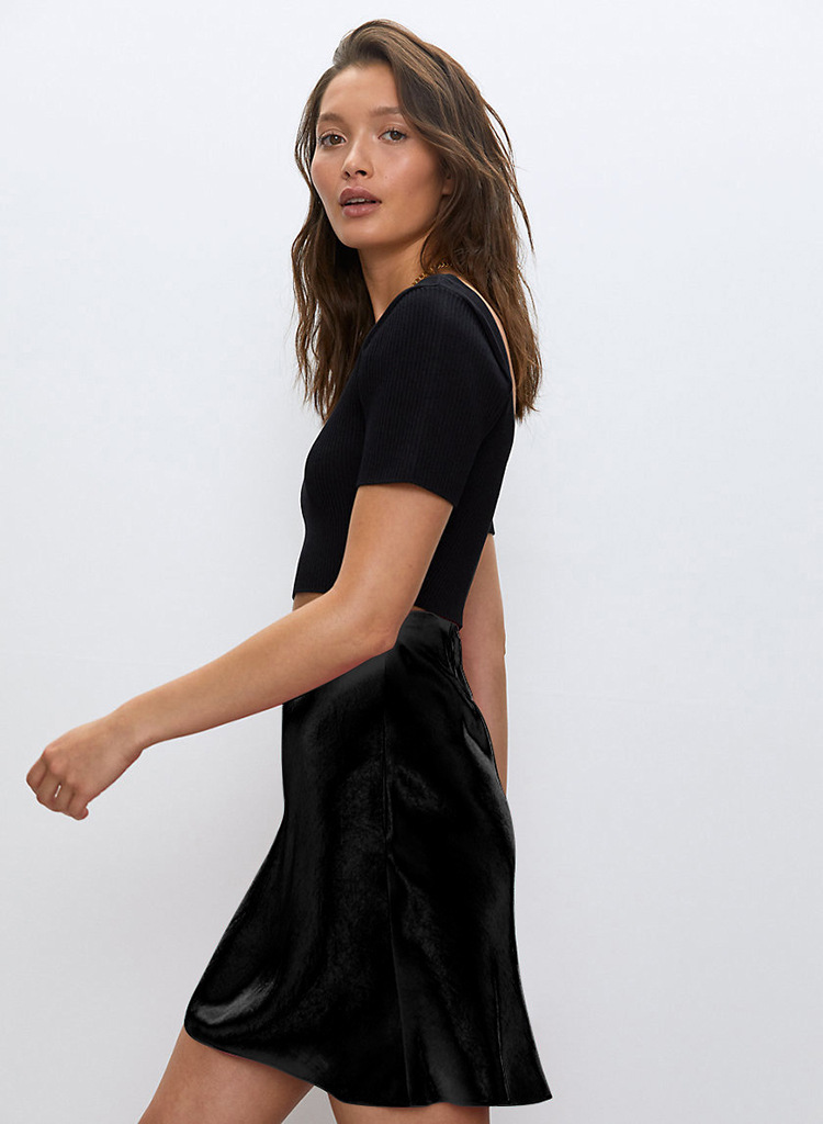 헤비웨이트 수입 삼아세테이트 스커트, 새틴 광택, 신축성 있는 허리, 사선 재단 A라인 머메이드 미니 스커트, 여성용 가을