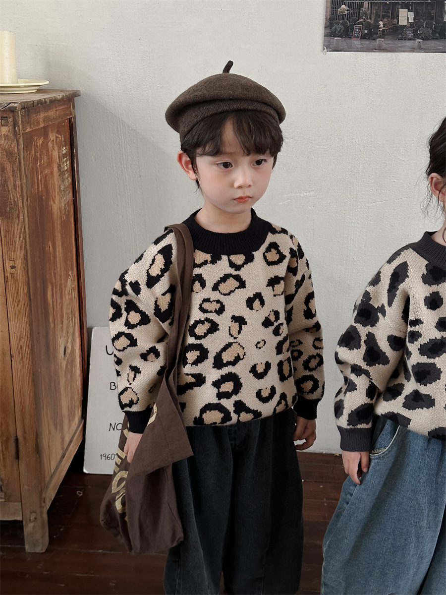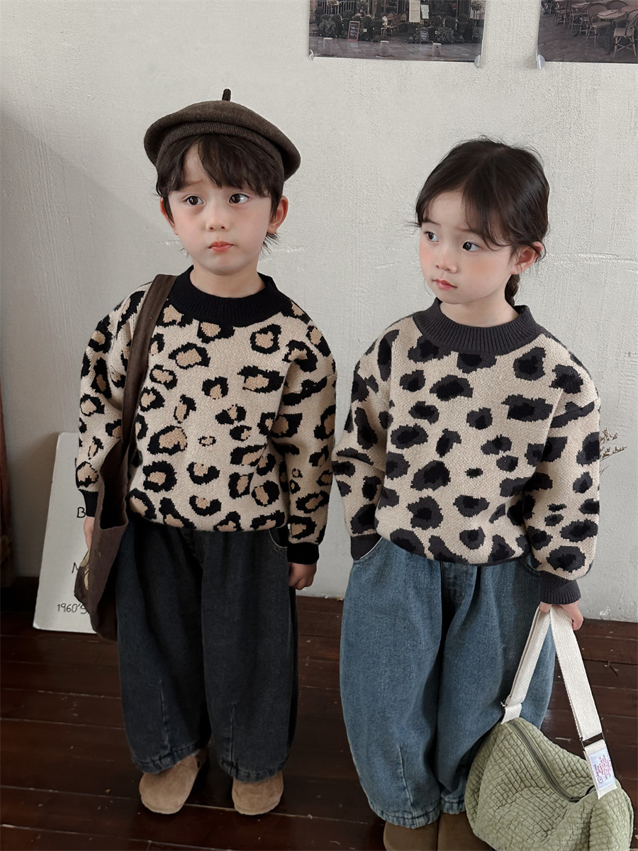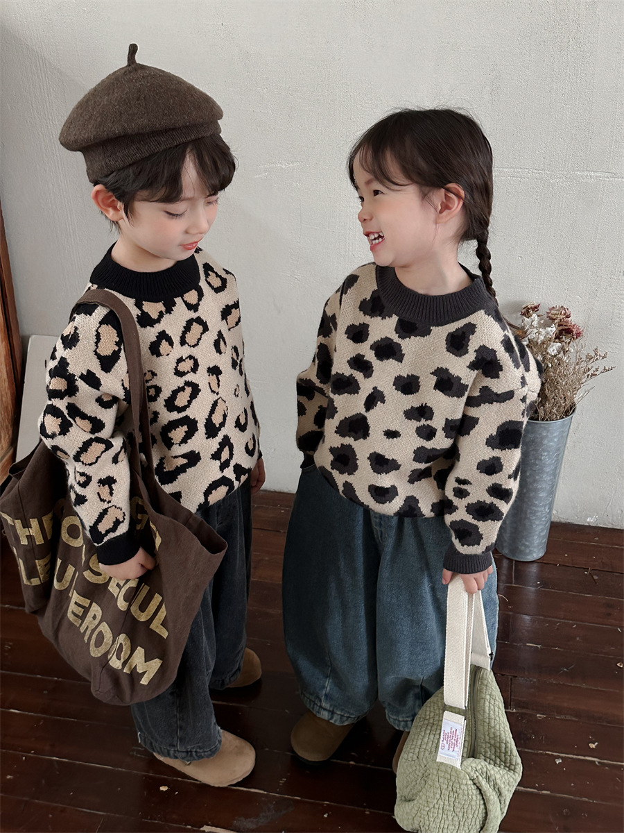 2024년 신상 아동복 겨울 레오파드 무늬 니트 남녀 아기용 루즈핏 스타일리시 상의 이너웨어스토어 가기