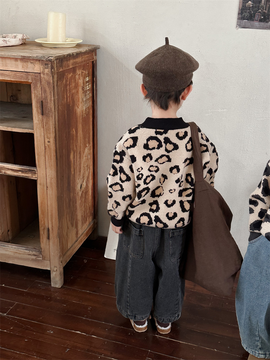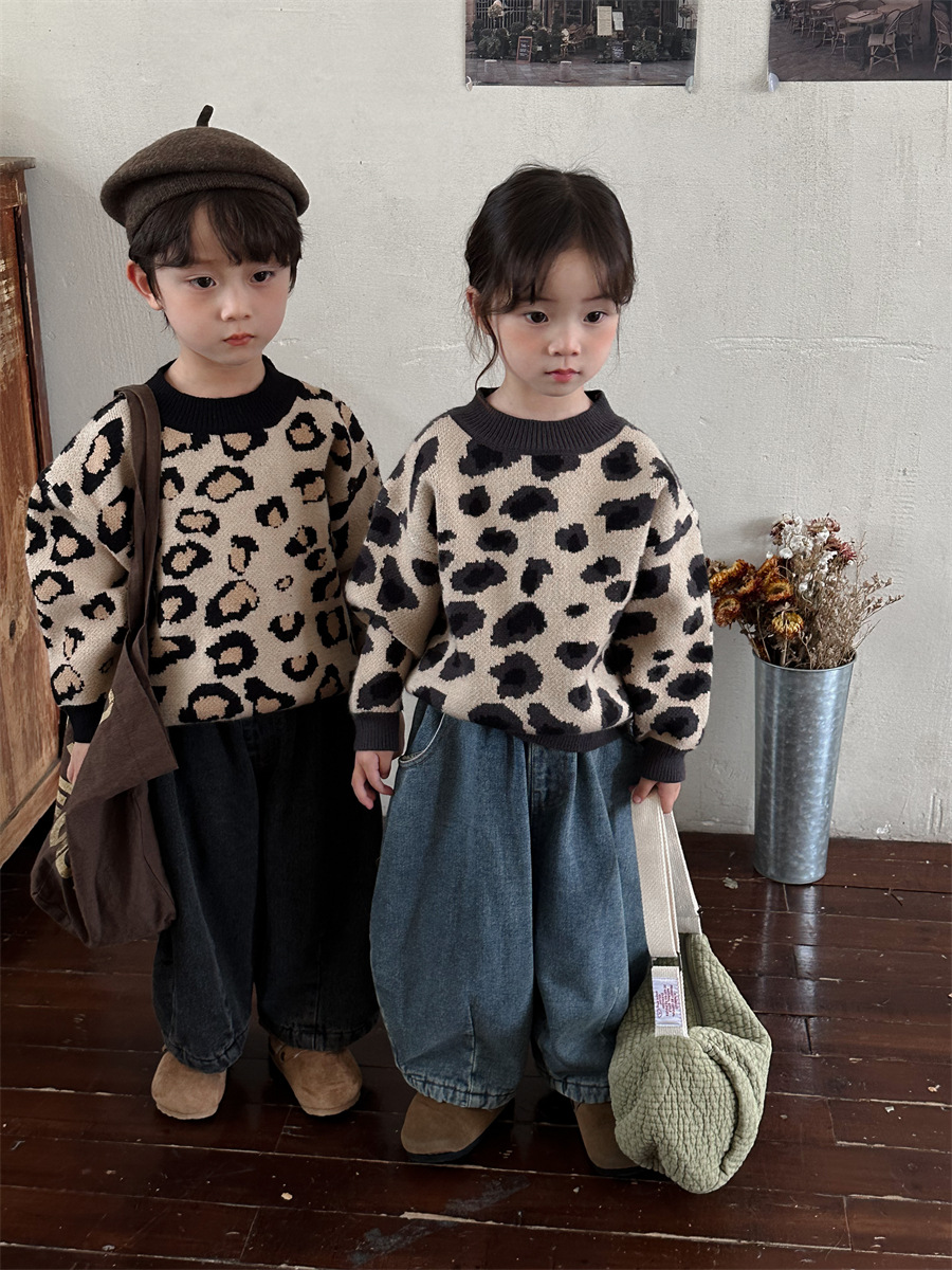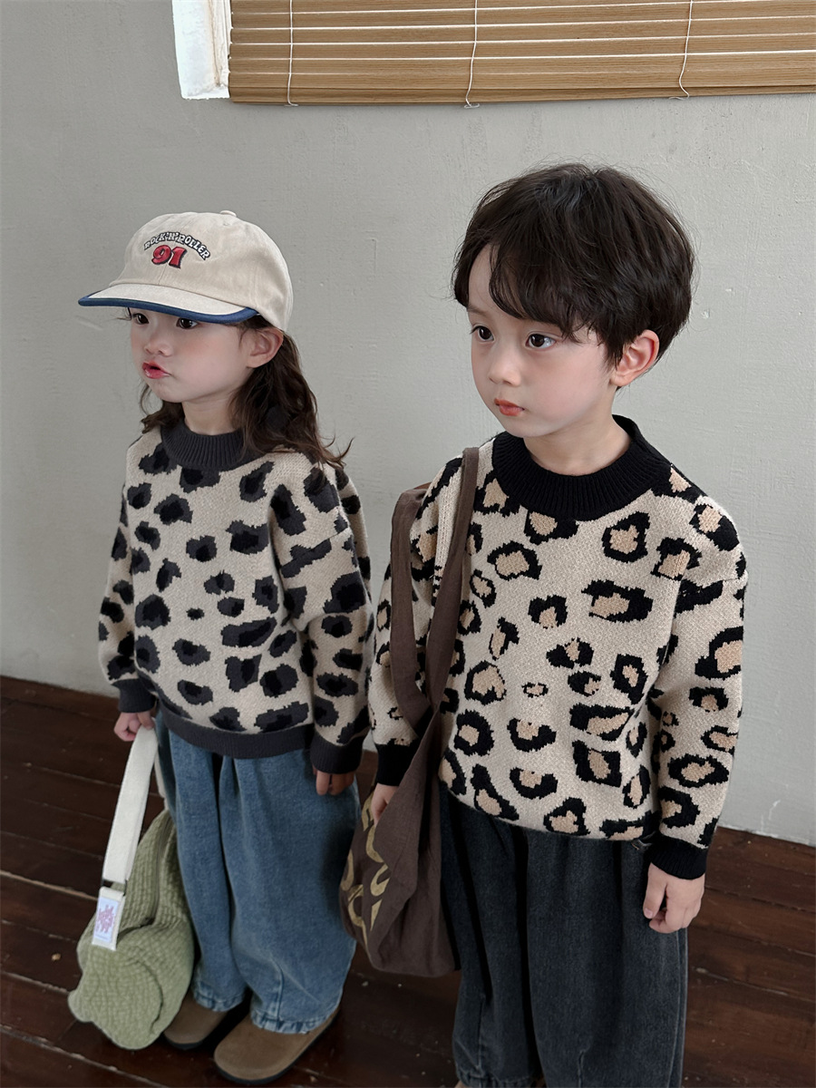 2024년 신상 아동복 겨울 레오파드 무늬 니트 남녀 아기용 루즈핏 스타일리시 상의 이너웨어스토어 가기