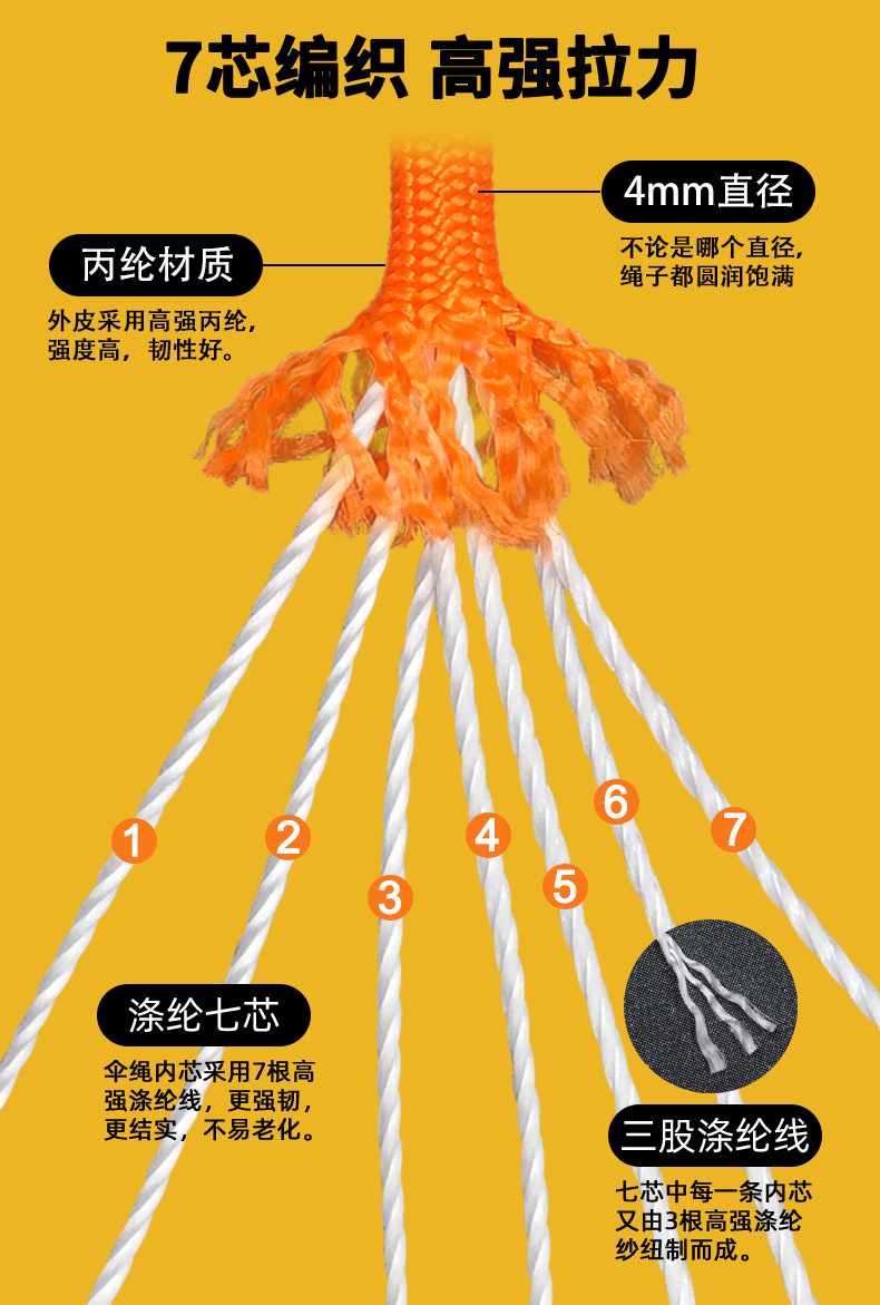 소스 공장 의류 액세서리 장식 모자 로프 모험 캠핑 텐트 로프 컬러 우산 로프 4mm 7 코어 라운드 로프