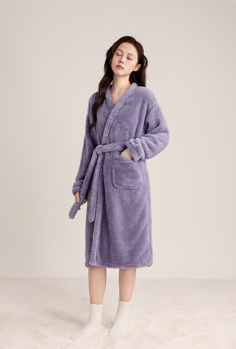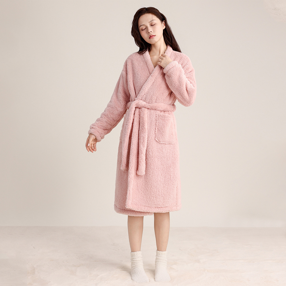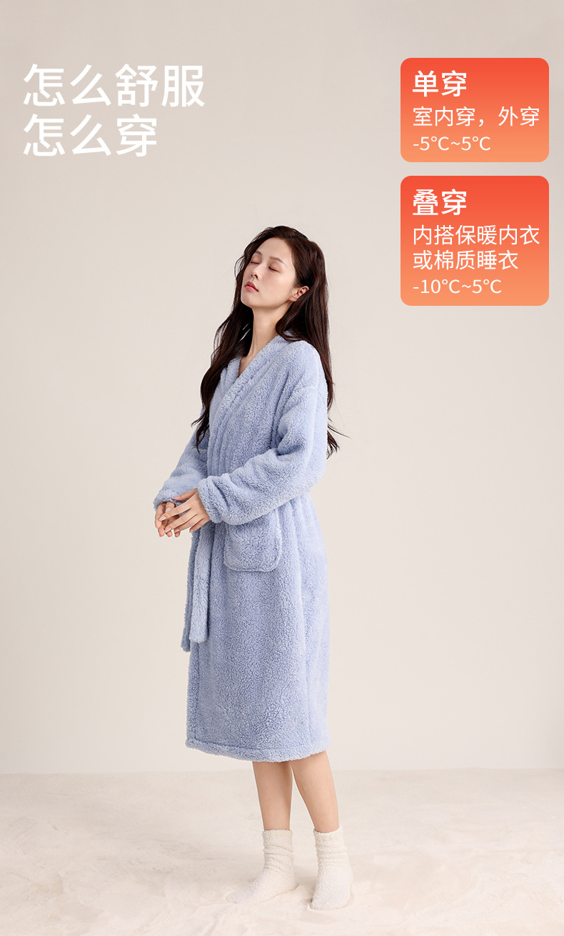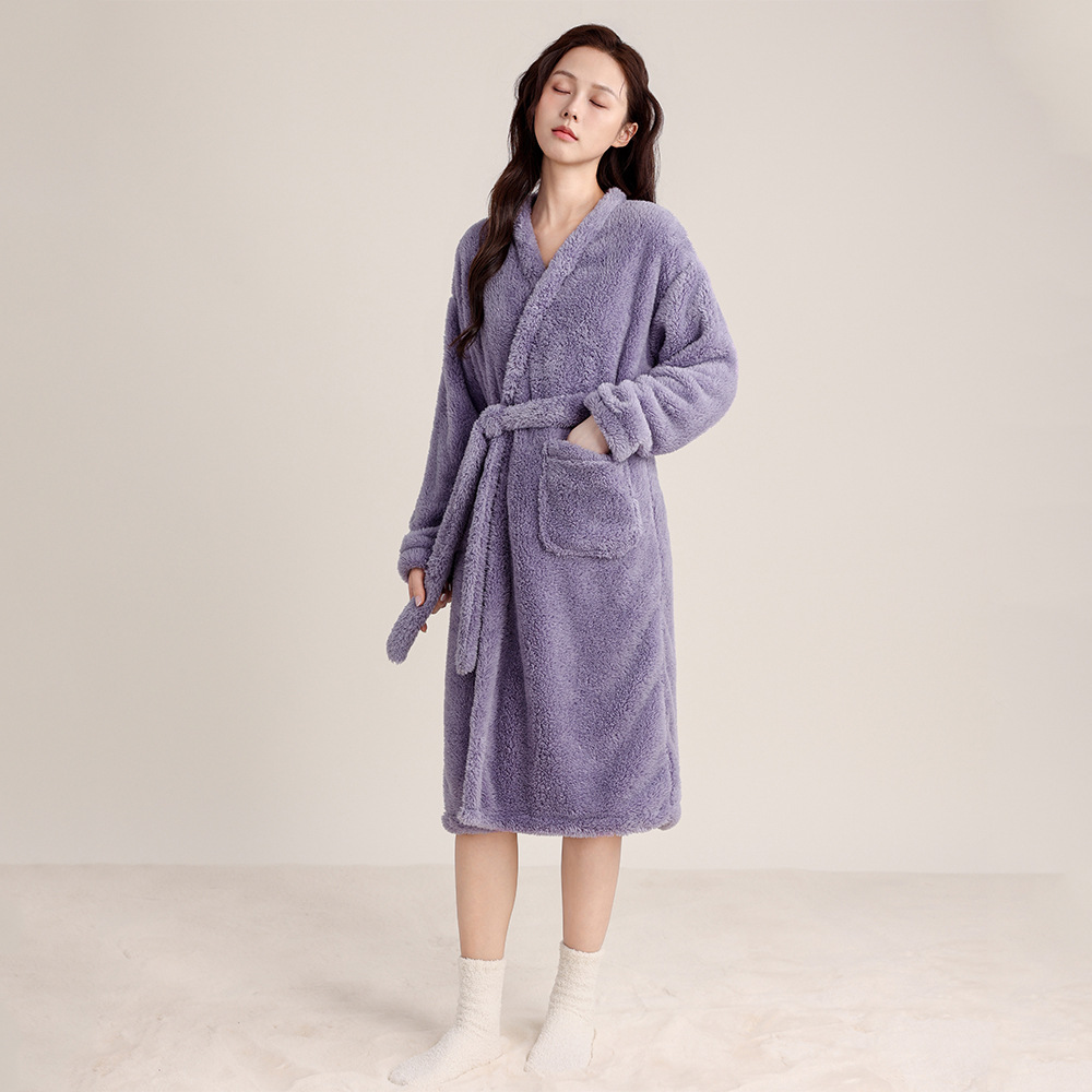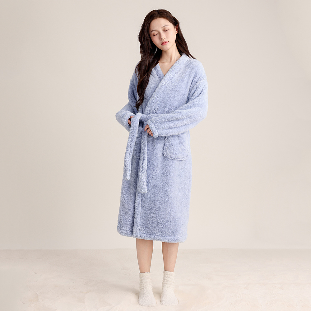 가을 겨울 여성용 잠옷 브이넥 비스듬한 단추 디자인 심플한 홈웨어 플란넬 플러스 벨벳 두꺼운 목욕 가운 따뜻한 롱 잠옷스토어 가기