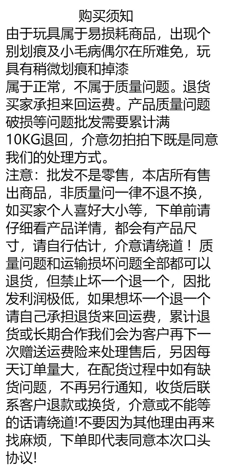 由于玩具属于易损耗商品,出现个别划痕及小毛病偶尔在所难免,玩具有稍微划痕和掉漆属于正常,不属于质量问题。退货买家承担来回运费。质量破损等问题批发需要累计满10KG退回,介意勿拍,拍下既是同意我们的处理方式!