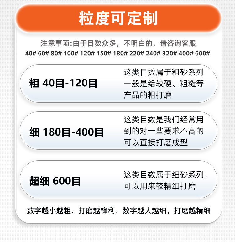 我们可以按照客户图纸或样品定制各类材质尺寸的打磨抛光产品,打样周期2-3天。还为有需要的客户提供OEM服务,包括设计独特品牌logo和包装。并持续关注客户的售后体验,让客户享受安心的产品和服务。