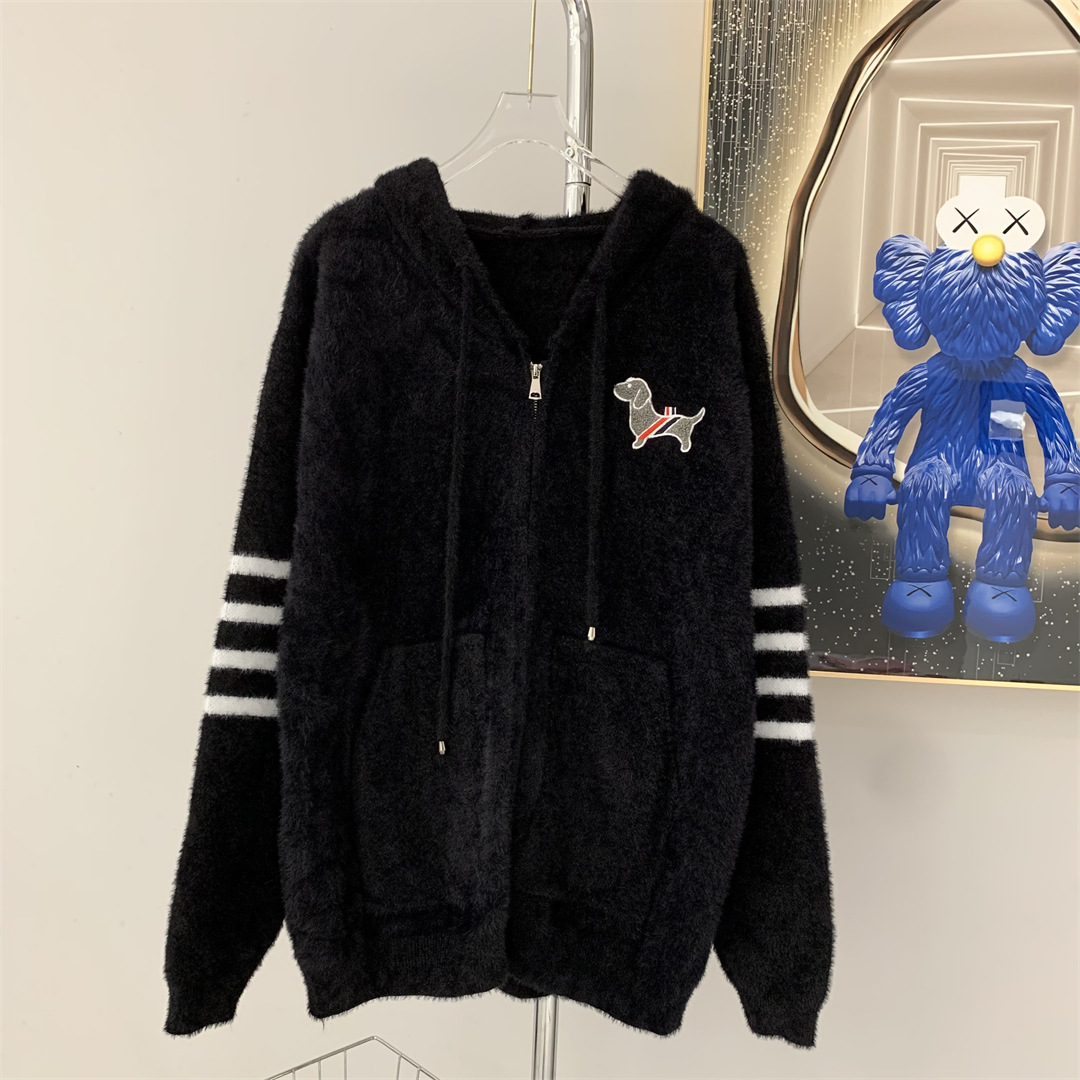 TB 강아지 4 바 스트라이프 모조 밍크 지퍼 후드 니트 카디건 여성 대학 스타일 루즈 캐주얼 스웨터 자켓스토어 가기