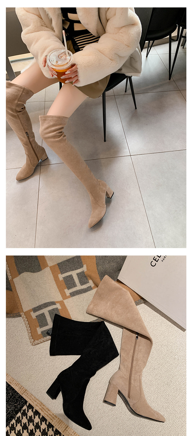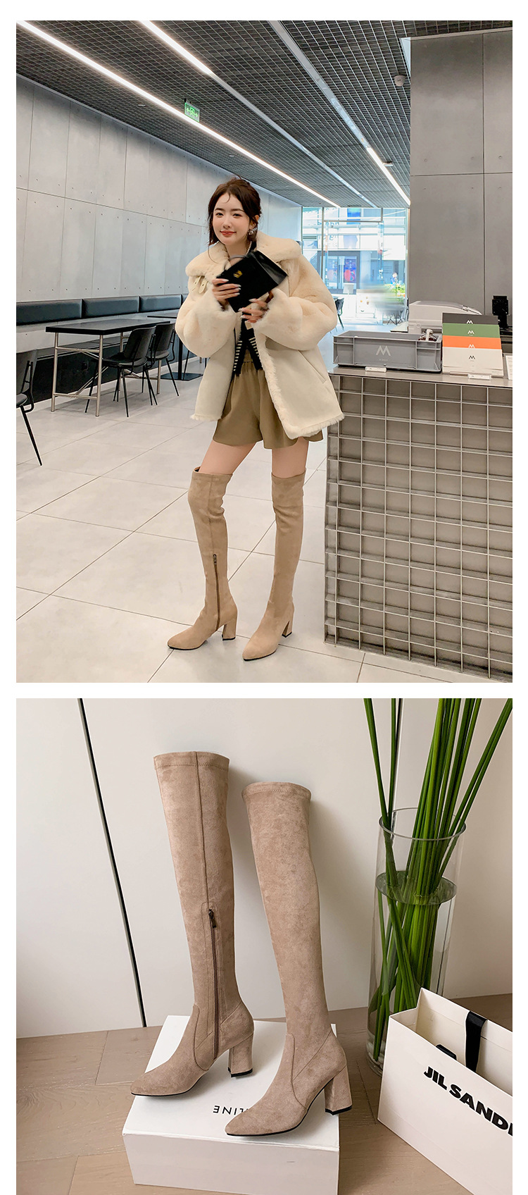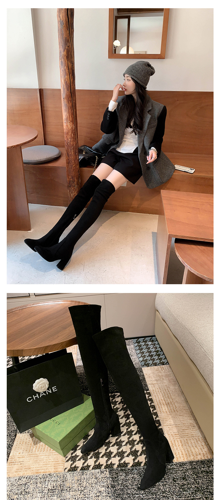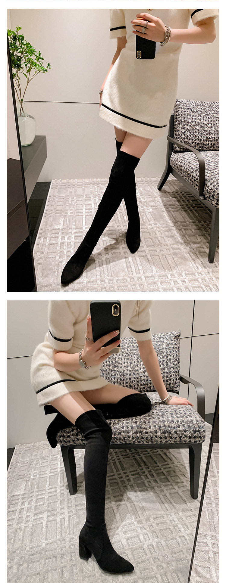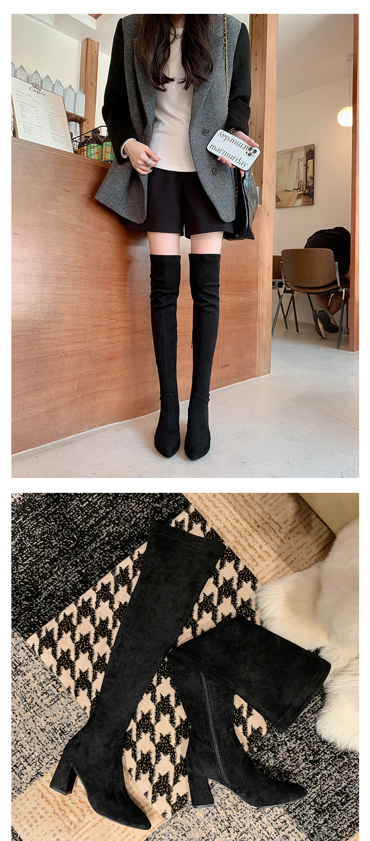 디자이너 Kun 무릎 부츠 여성의 가을과 겨울 새로운 뾰족한 두꺼운 굽 높은 스트레치 무릎 부츠 작은 부츠스토어 가기