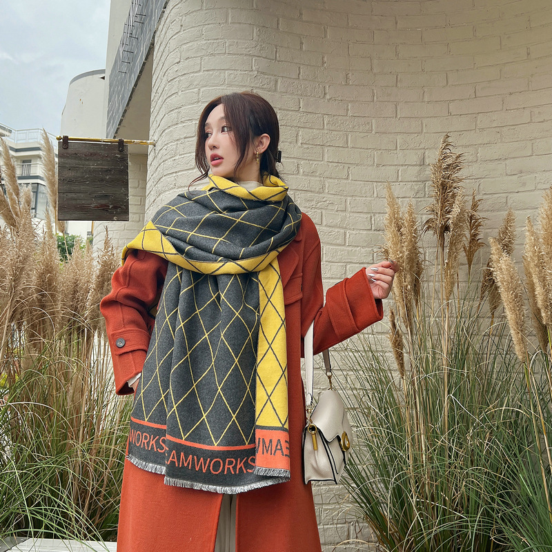 다이아몬드 기하학 스카프 여성용 한국식 겨울 새로운 모조 캐시미어 모든 매치 따뜻한 격자 무늬 숄 학생 편지 스카프스토어 가기