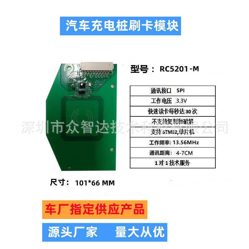 应用:新能源汽车充电桩刷卡模块/低功耗高频13.56MHZ无线射频识别感应读写模块SPI通信接口,应用于比亚迪,东风,广汽, 长安等各大车厂。也可应用学校,公司,工厂,工业,商用的众多领域,例如:RFID手持终端、RFID读写器、智能读卡器、读写器、发卡器、IC卡刷卡器、智能充电桩、智能柜,智能电表、水表,平板一体机,门禁,电子标签,防伪系统,电子自动化设备等。