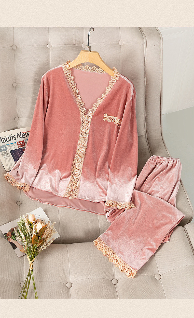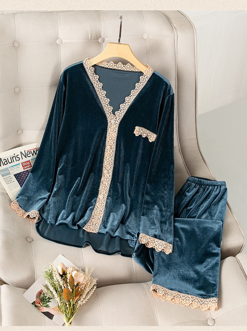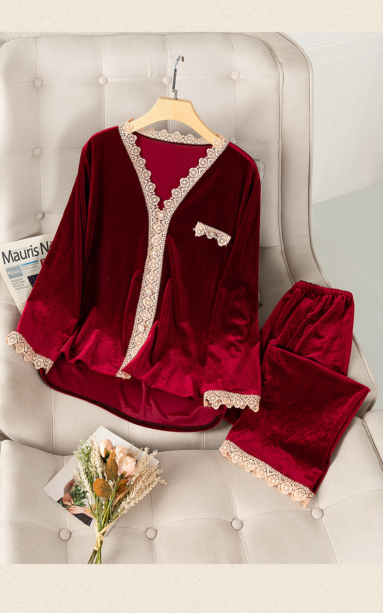 골든 벨벳 잠옷 여자의 가을과 겨울 2023 새로운 긴 소매 바지 세트 레이스 카디건 복장