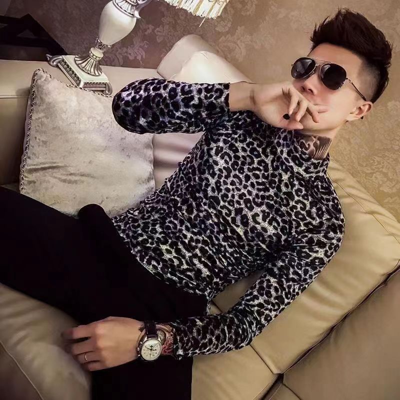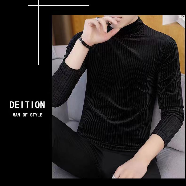 봄 한국식 슬림핏 남성용 하프 하이 칼라 긴팔 티셔츠 트렌디 한 남성용 세련된 양털 스트라이프 미들 칼라 베이스 셔츠스토어 가기