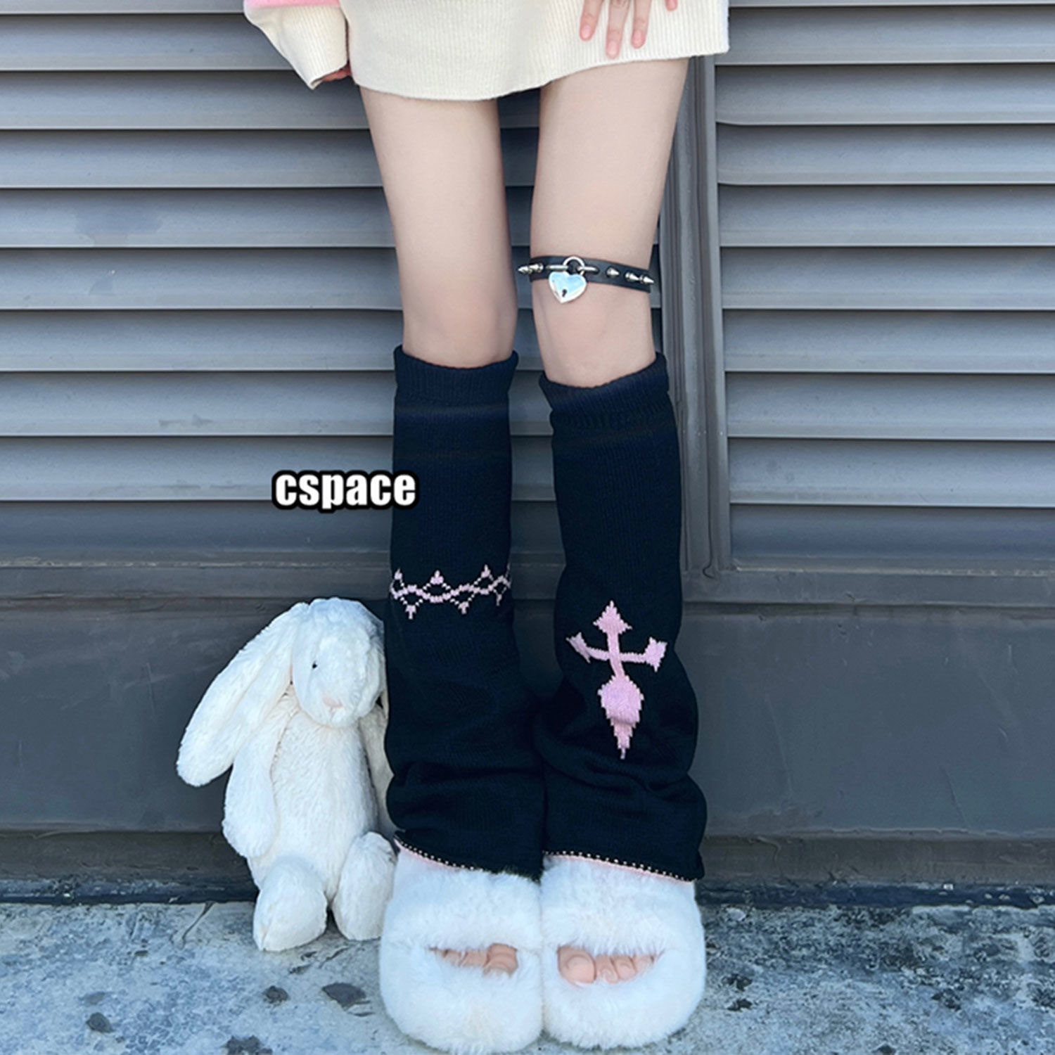 핑크 크로스 와이드 다리 양말 비대칭 다리 워머 로리타 소녀 겨울 따뜻한 송아지 양말 Y2K스토어 가기