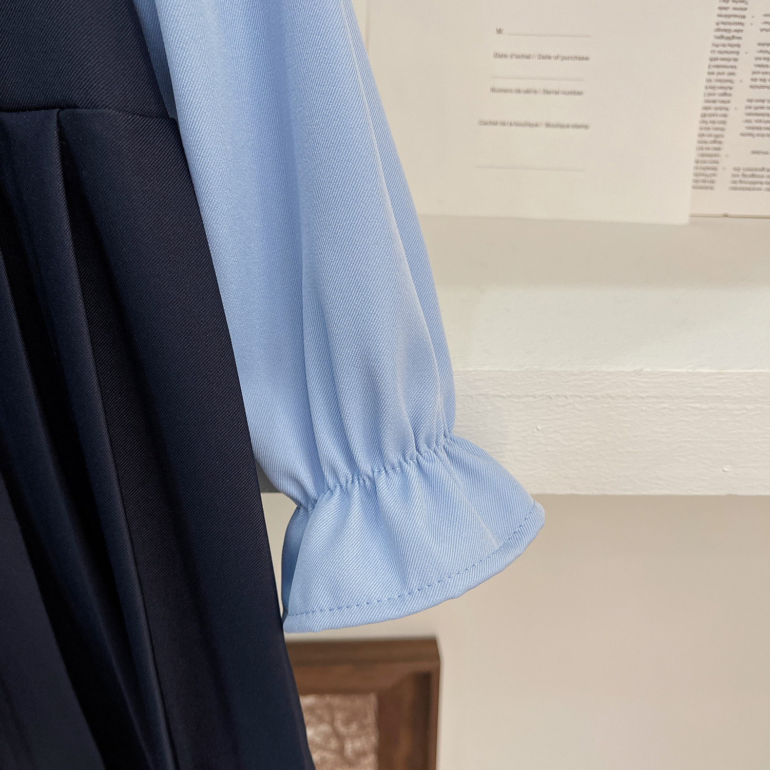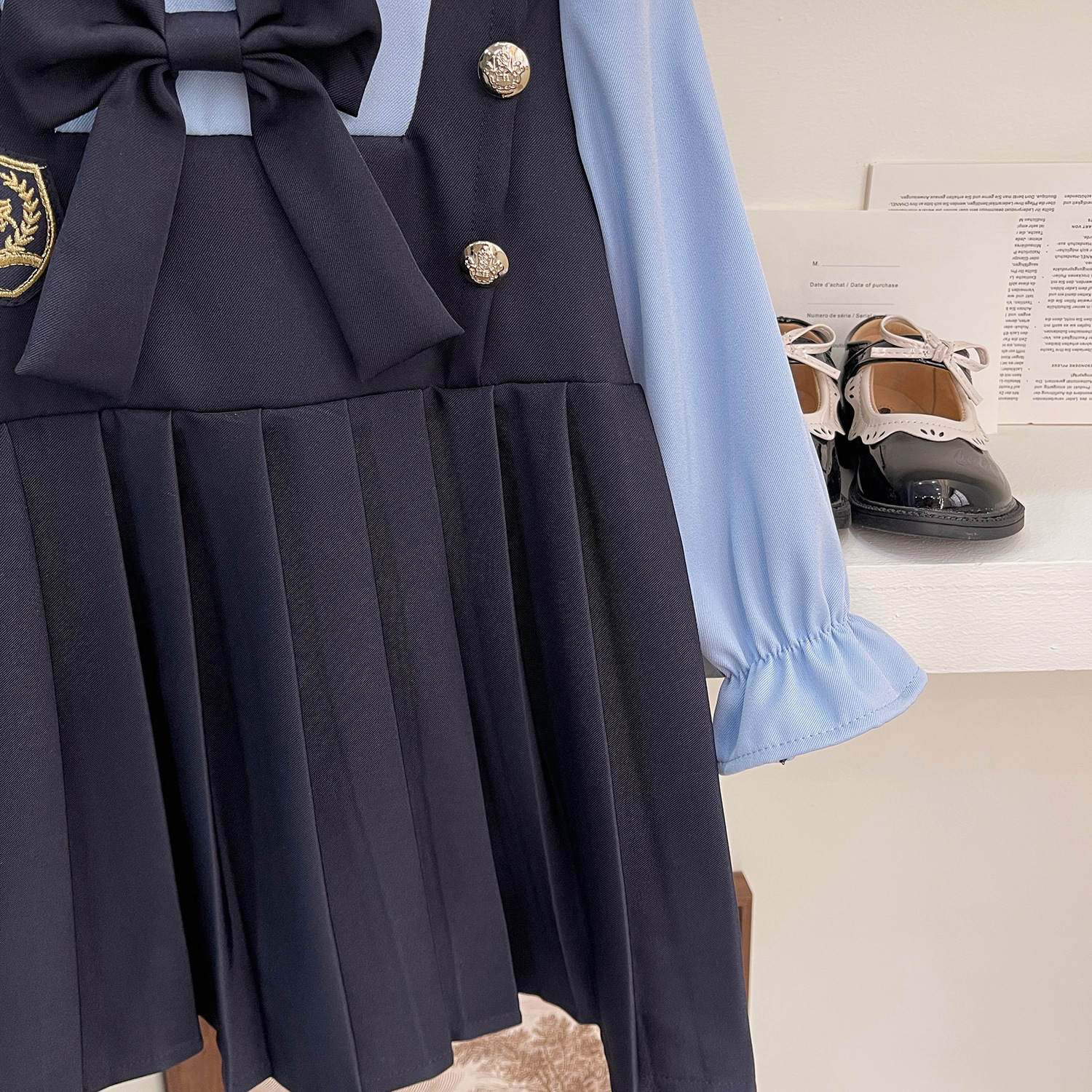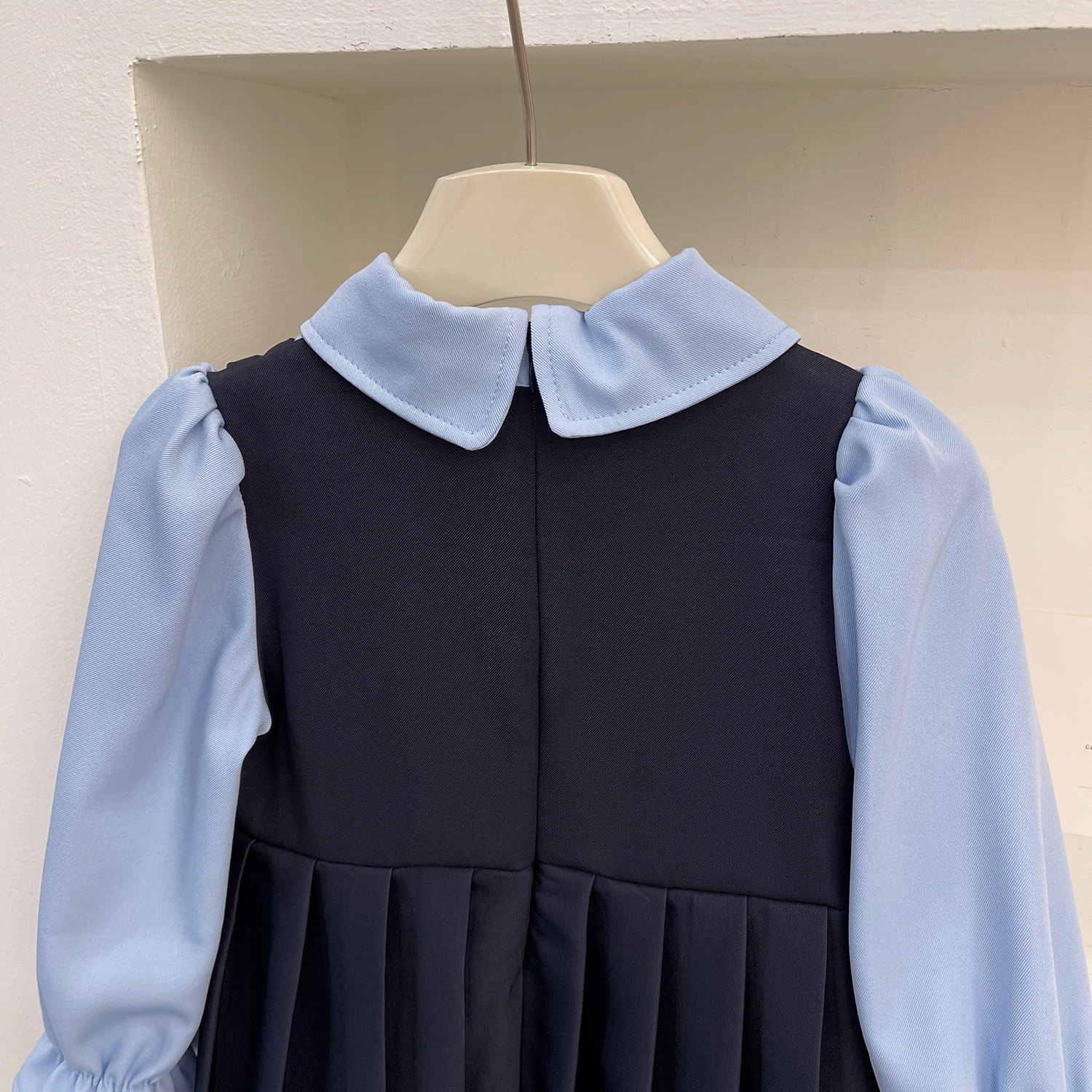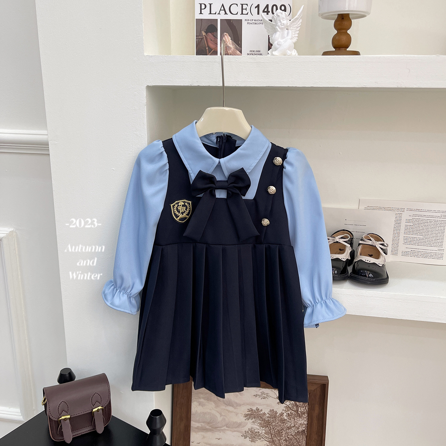 어린이 치마 2023 봄과 가을 여자 긴 소매 가짜 두 원피스 학업 셔츠 칼라 주름 치마 머리카락의 세대