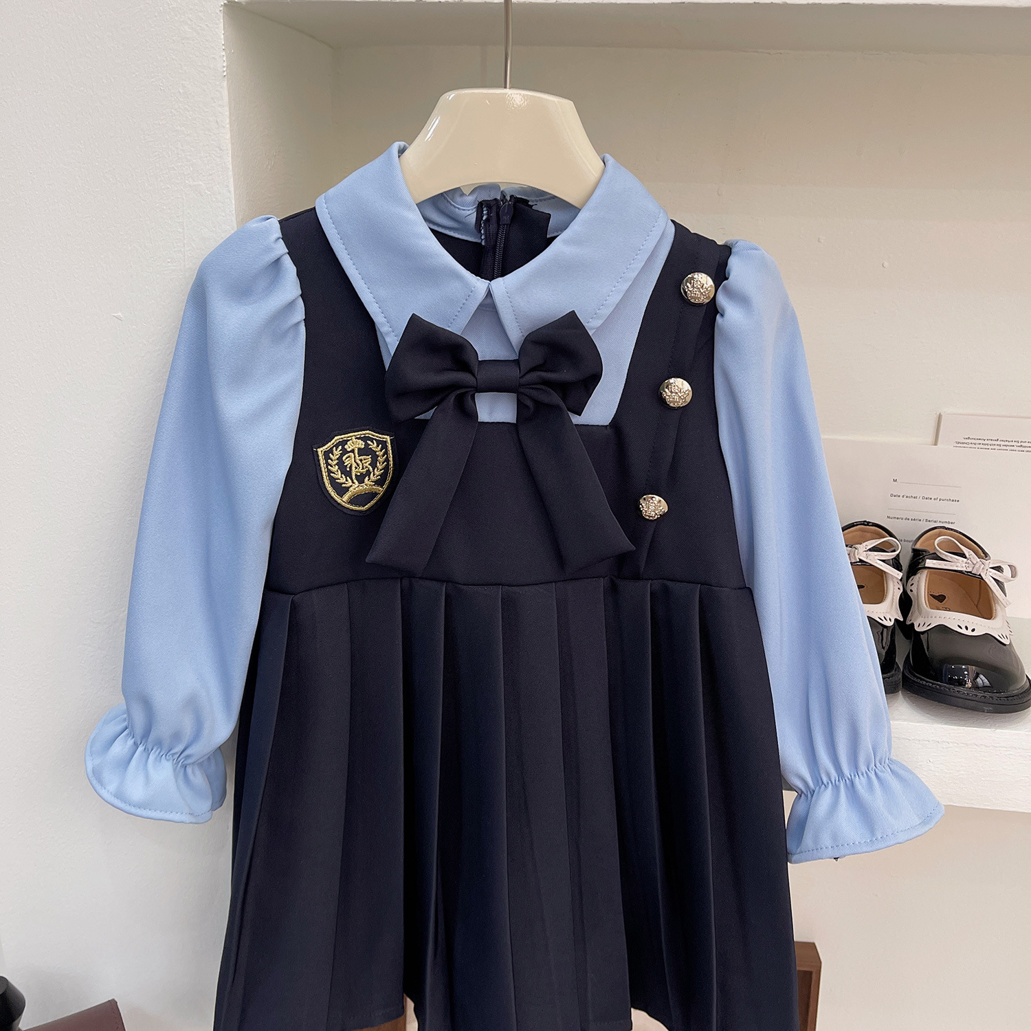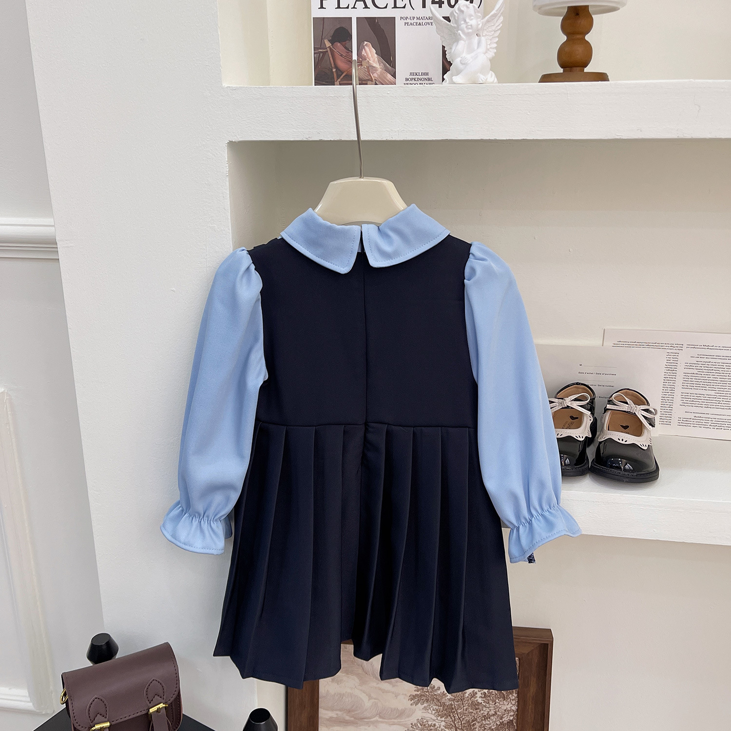 어린이 치마 2023 봄과 가을 여자 긴 소매 가짜 두 원피스 학업 셔츠 칼라 주름 치마 머리카락의 세대스토어 가기