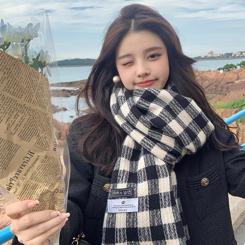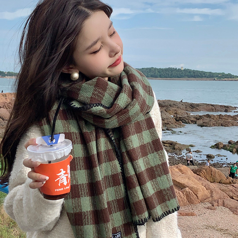 새로운 레트로 격자 무늬 스카프 여성용 겨울 두꺼운 한국식 학생 숄 이중 목적 따뜻한 스카프 그린 모든 매치스토어 가기