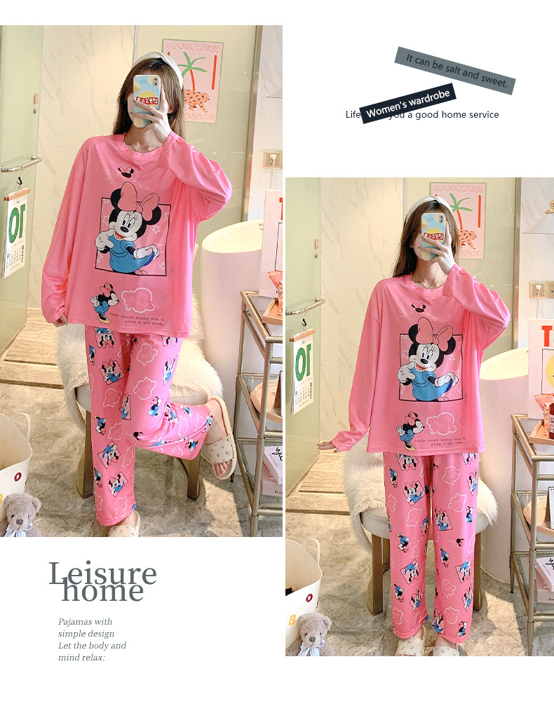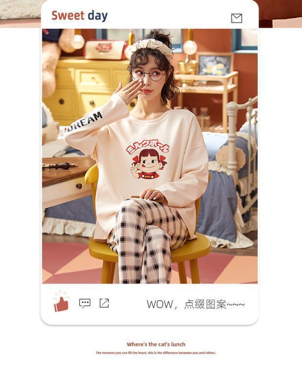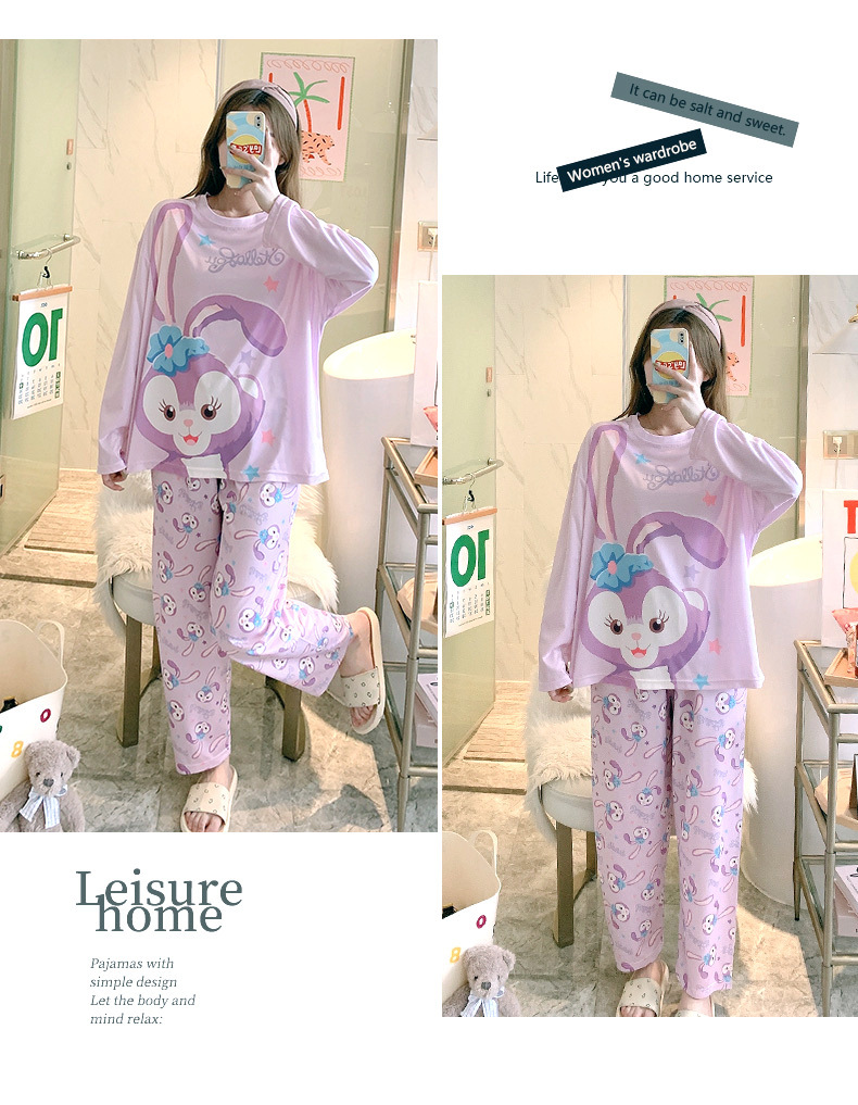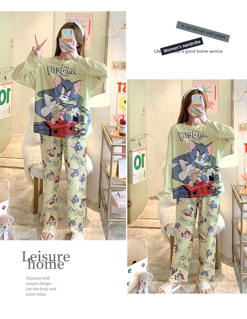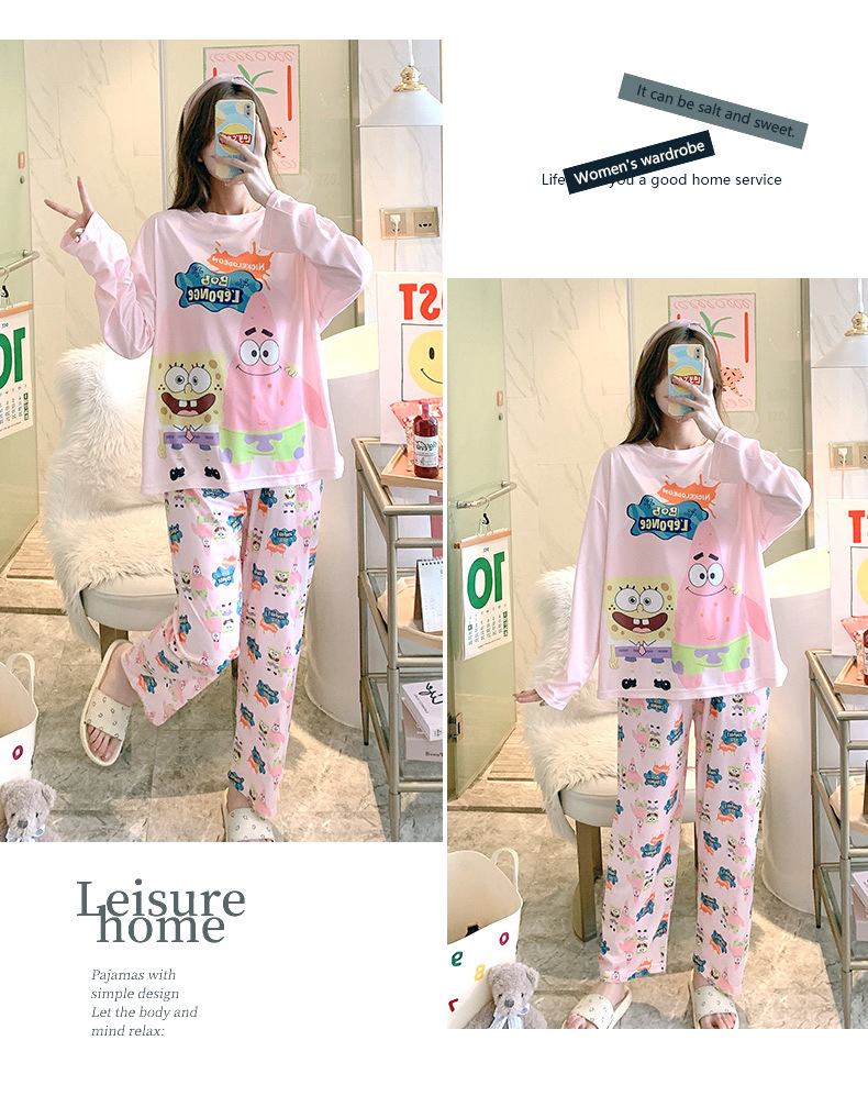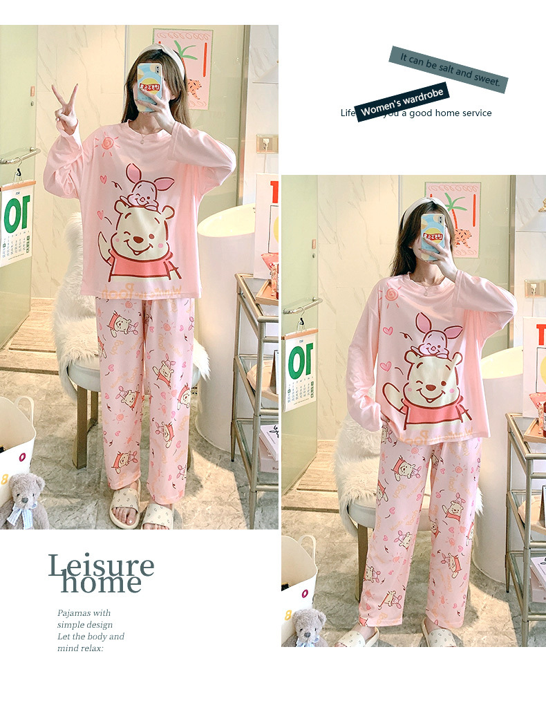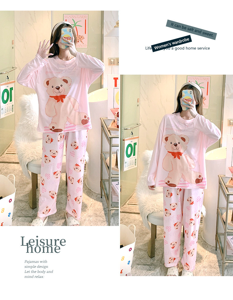 잠옷 여성용 봄과 가을 한국식 느슨한 긴팔 바지 라운드 넥 달콤한 귀여운 만화 투피스 가정복스토어 가기