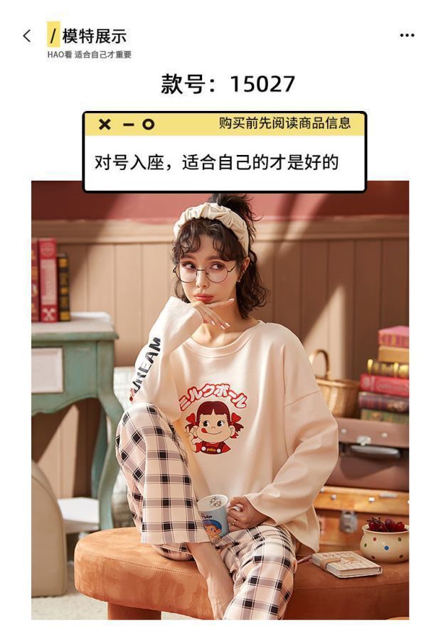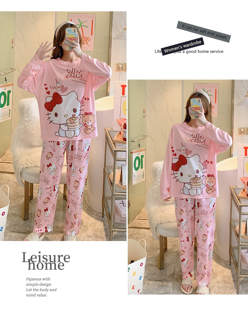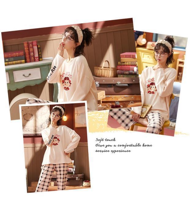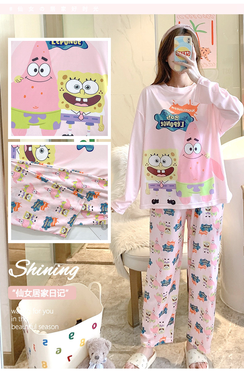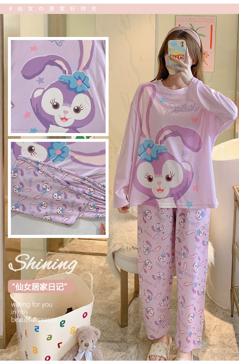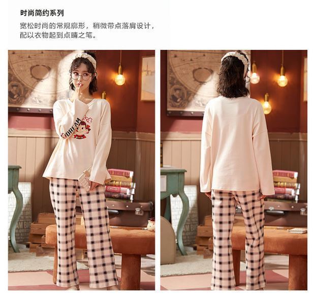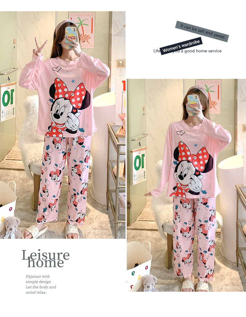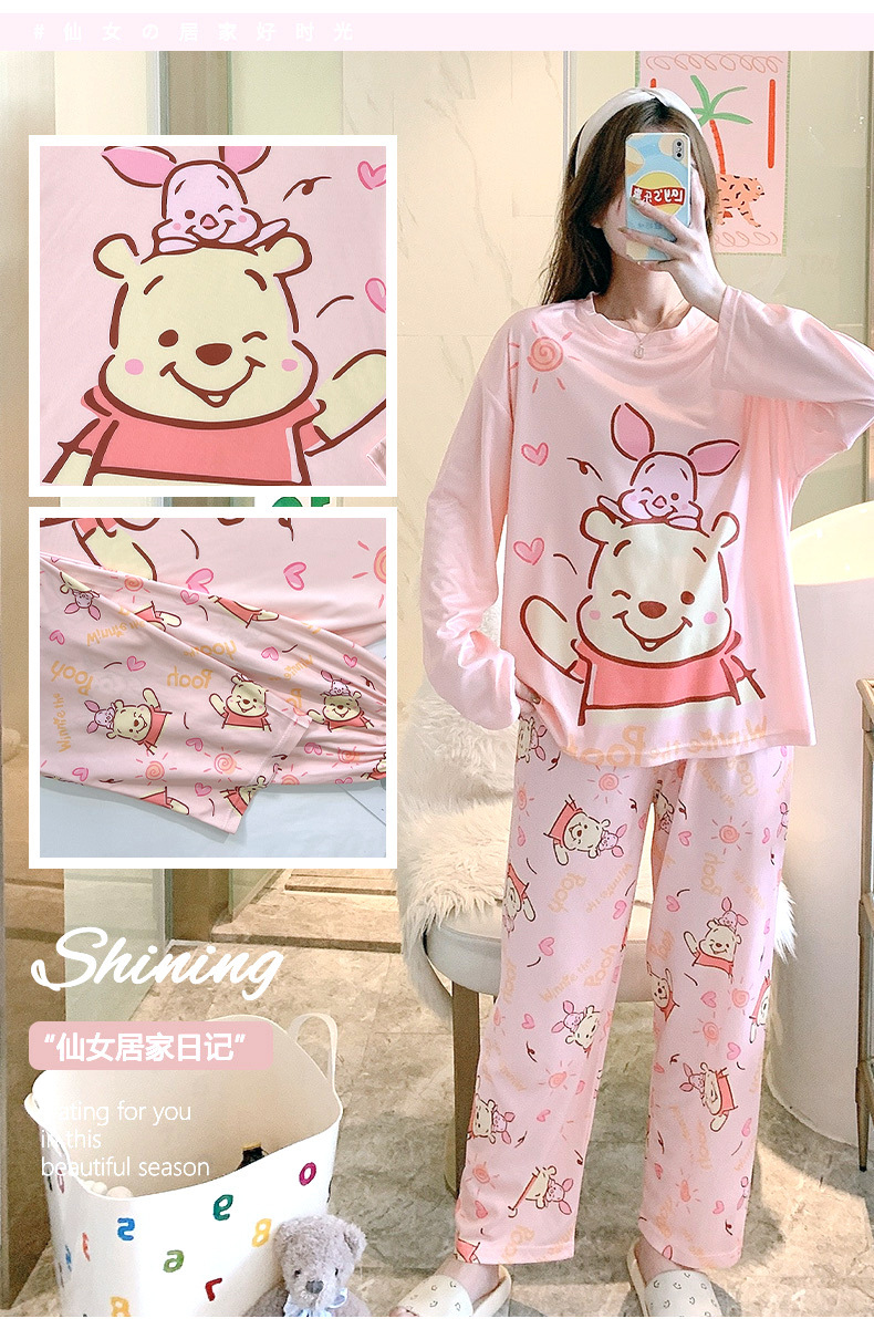 잠옷 여성용 봄과 가을 한국식 느슨한 긴팔 바지 라운드 넥 달콤한 귀여운 만화 투피스 가정복스토어 가기