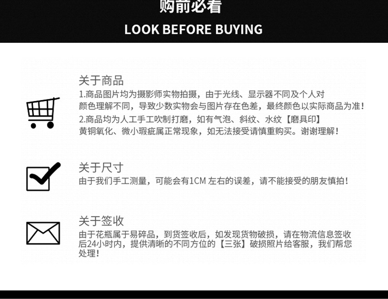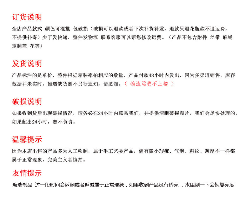5、关于售后问题:我们不能百分百保证商品中运输途中不会因为暴力的快递或物流而产生破损情况!请收到货物48小时之内核实好宝贝的数量与质量问题,如有问题及时反馈给在线客服以便好尽快的帮您处理好,如收到货物有破损,48小内给破损图片。