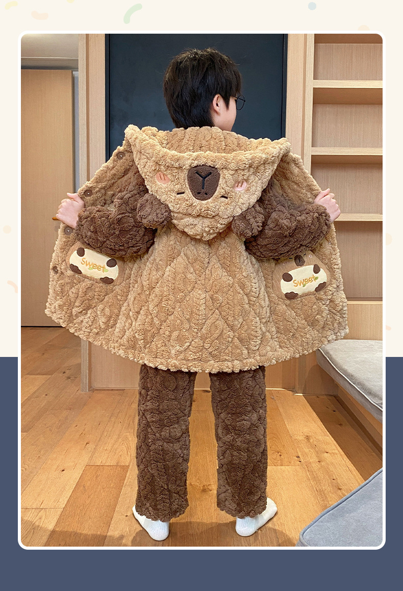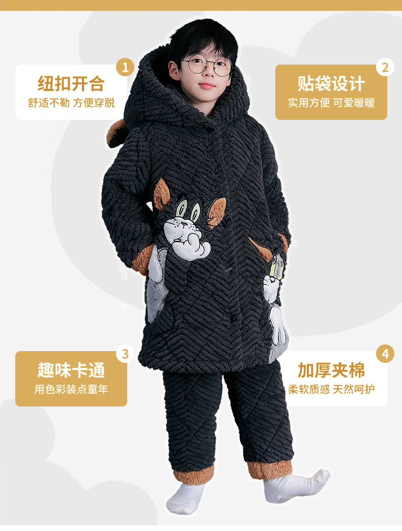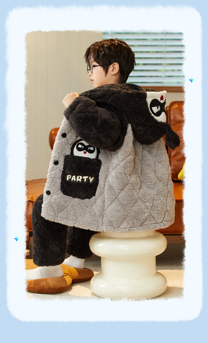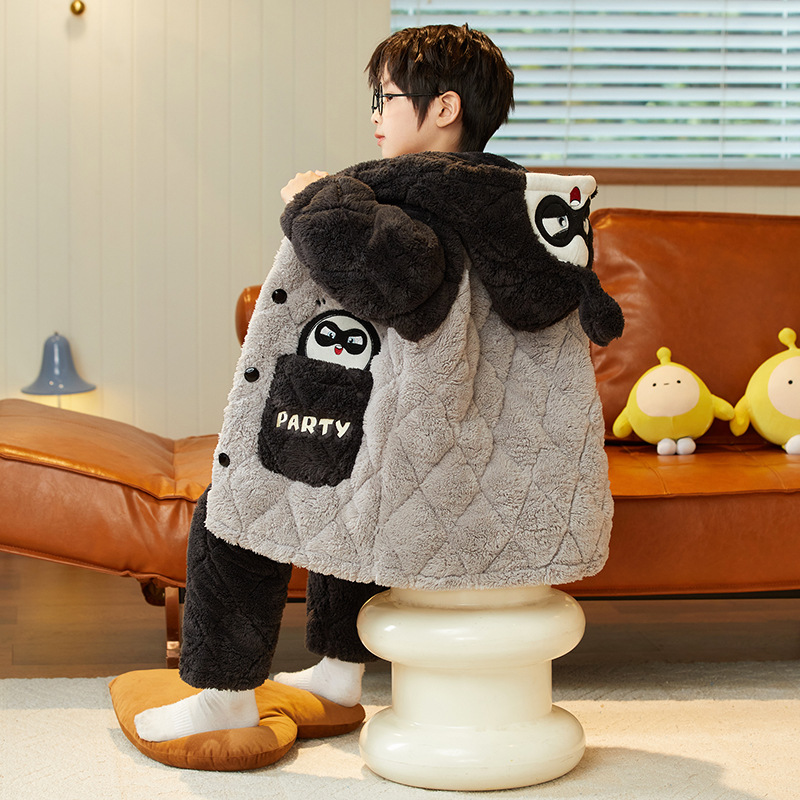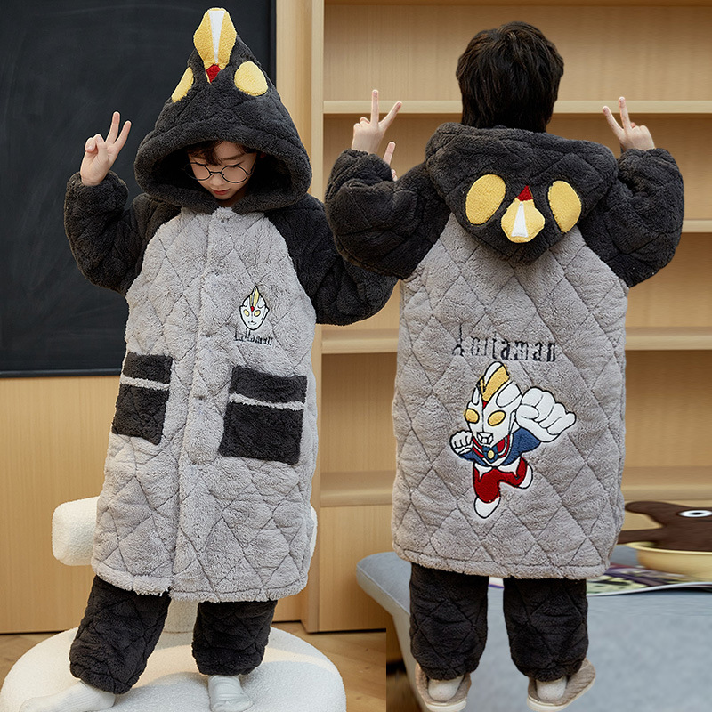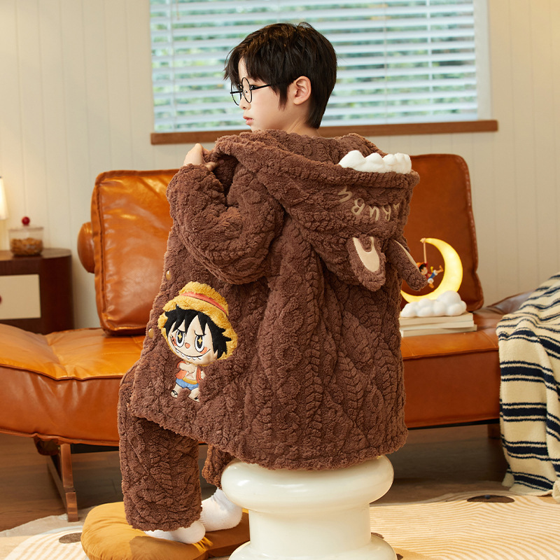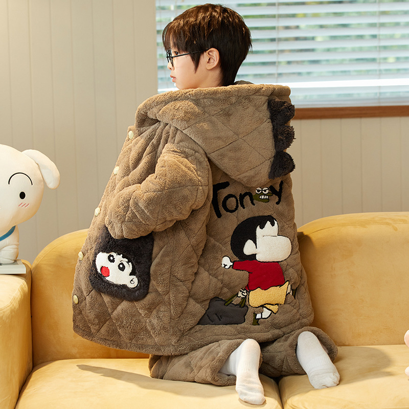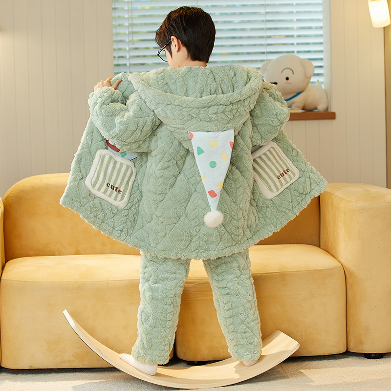 겨울 두꺼운 3 층 퀼트 어린이 플란넬 잠옷 남아 중간 긴 잠옷 소년 산호 양털 가정 의류