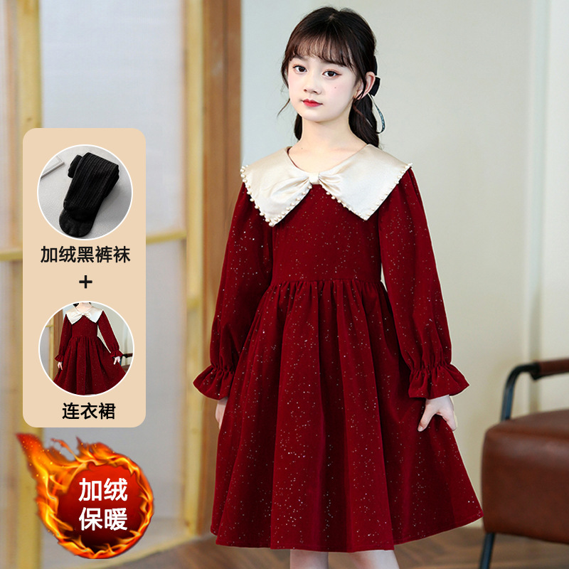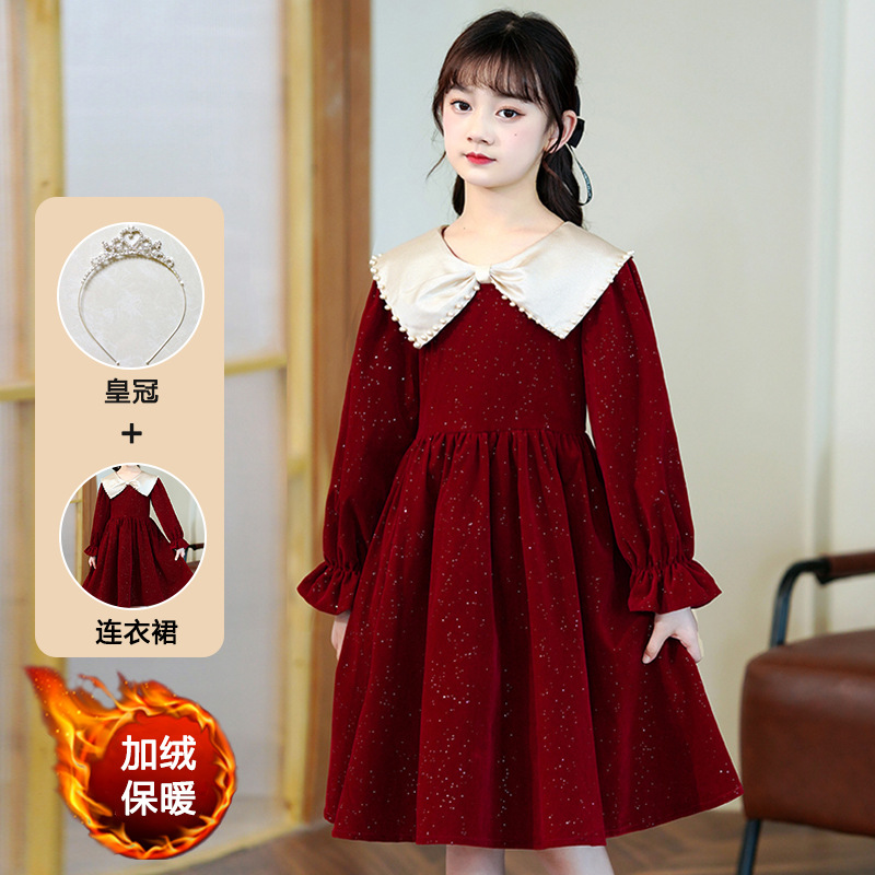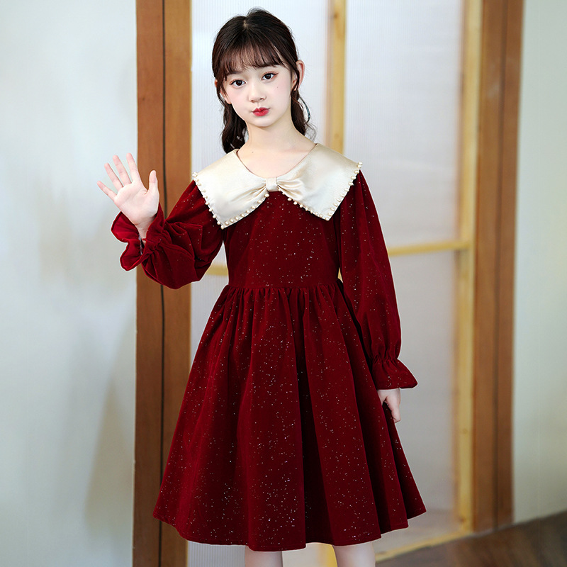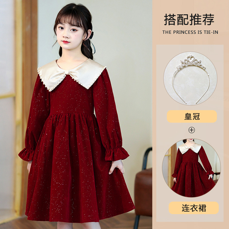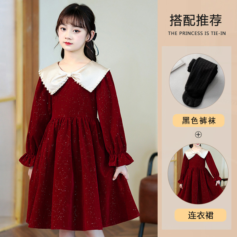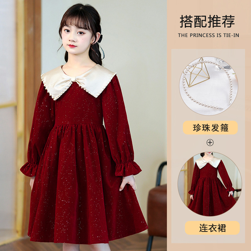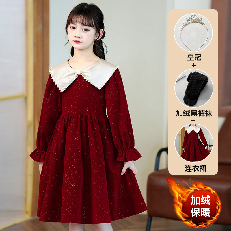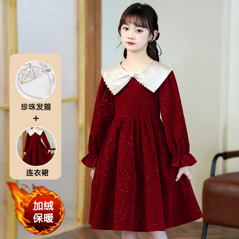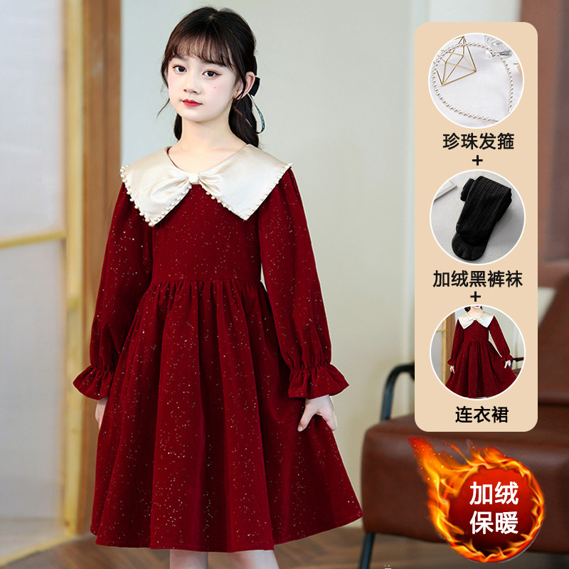 소녀 가을 원피스 2023 새로운 소녀 세련된 공주 원피스 어린이 가을과 겨울 긴 소매 기모 원피스 여성