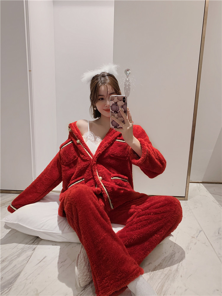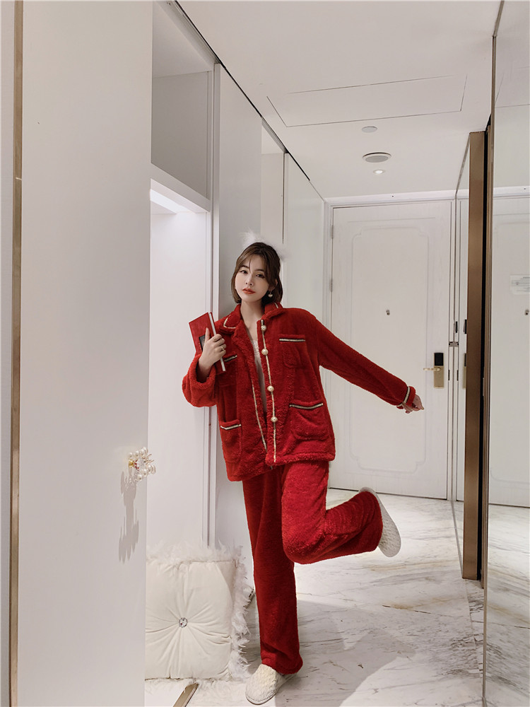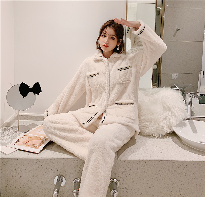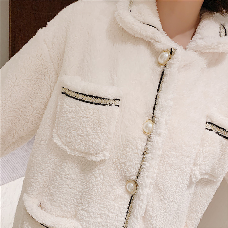 가을과 겨울 새로운 숙녀 단색 플러시 잠옷 작은 향기로운 바람 따뜻한 가정 착용 두꺼운 따뜻한 플란넬스토어 가기