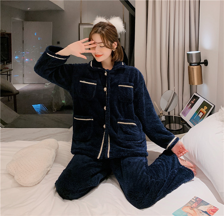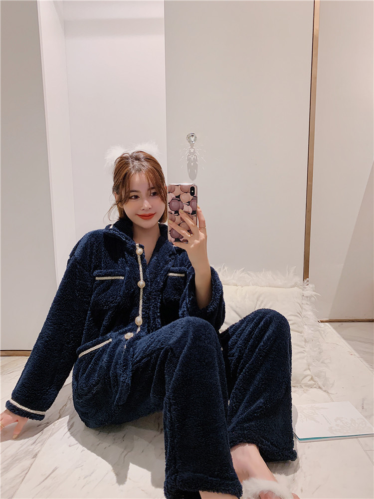 가을과 겨울 새로운 숙녀 단색 플러시 잠옷 작은 향기로운 바람 따뜻한 가정 착용 두꺼운 따뜻한 플란넬