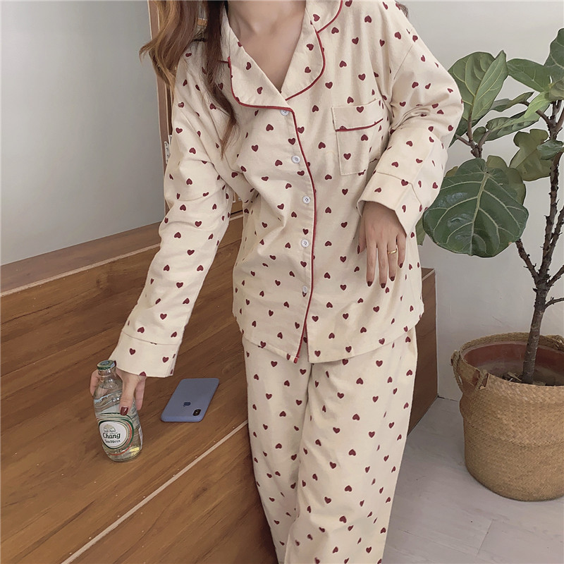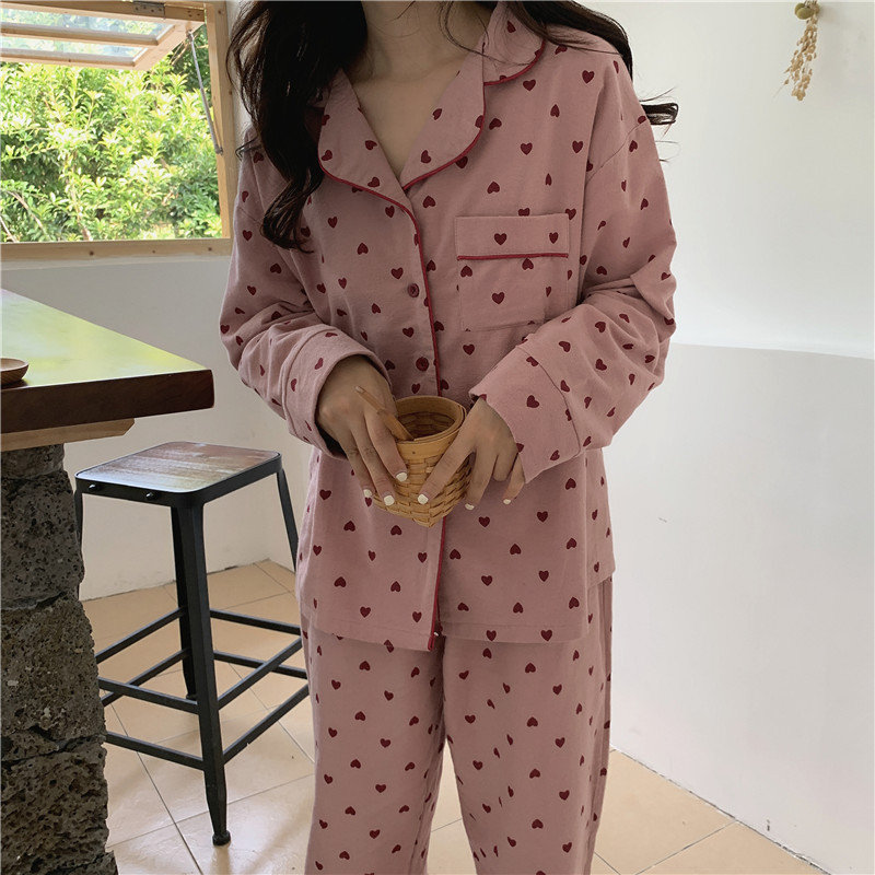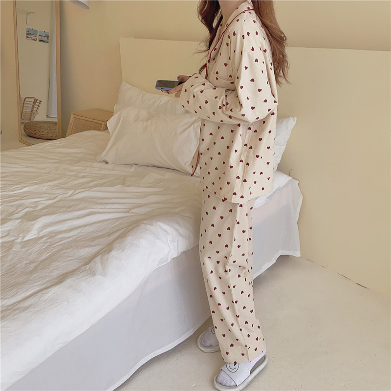 가을 샌딩 달콤한 사랑 긴팔 파자마 여성의 한국식 느슨한 세트 귀여운 학생 여성을위한 새로운 스타일 홈 옷스토어 가기