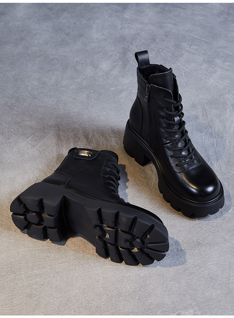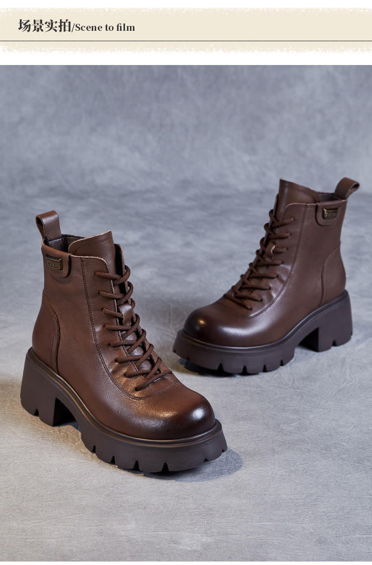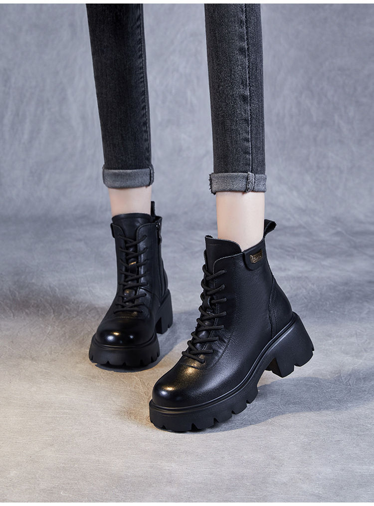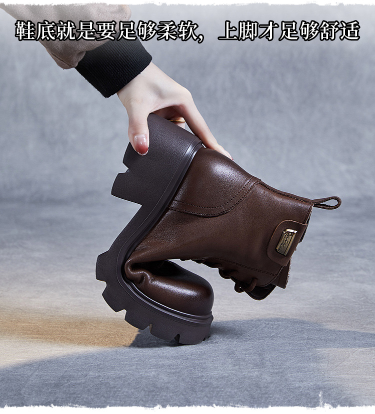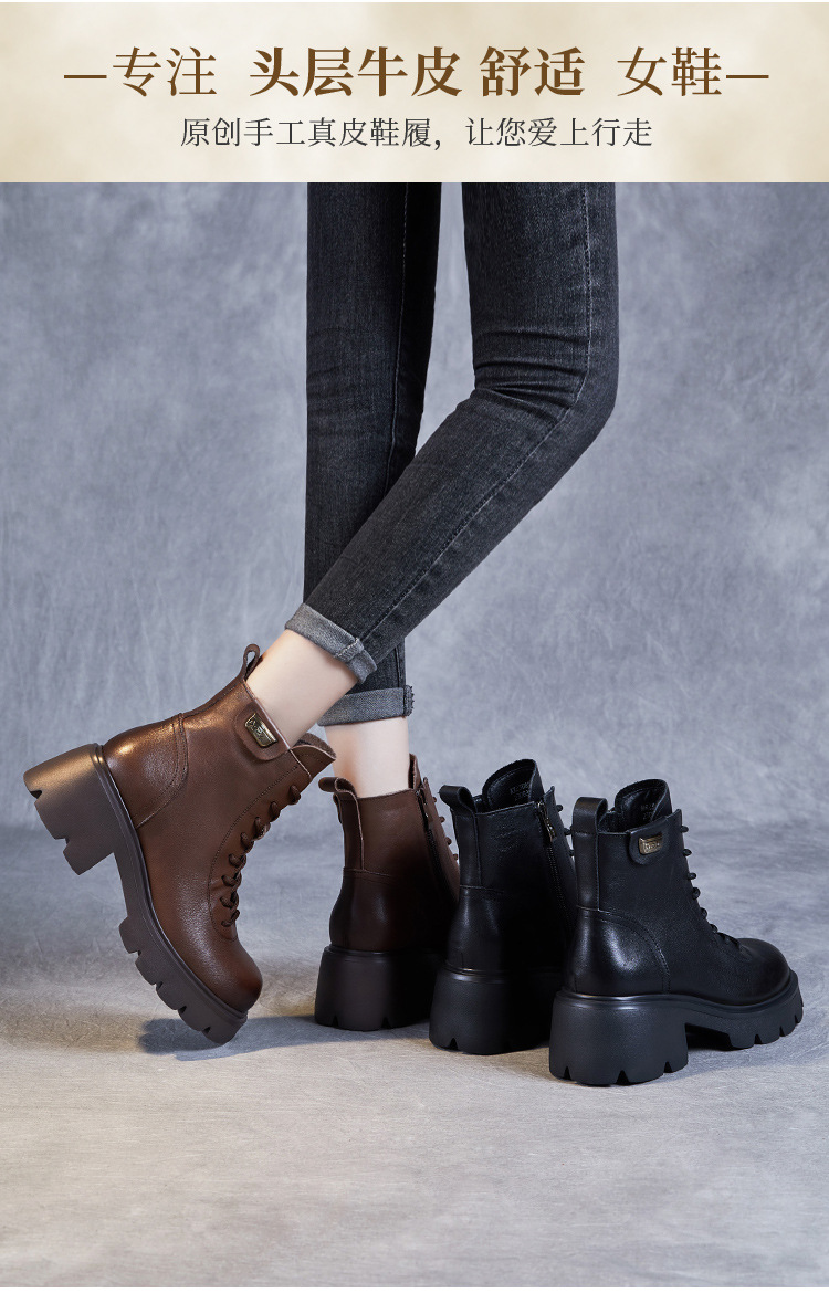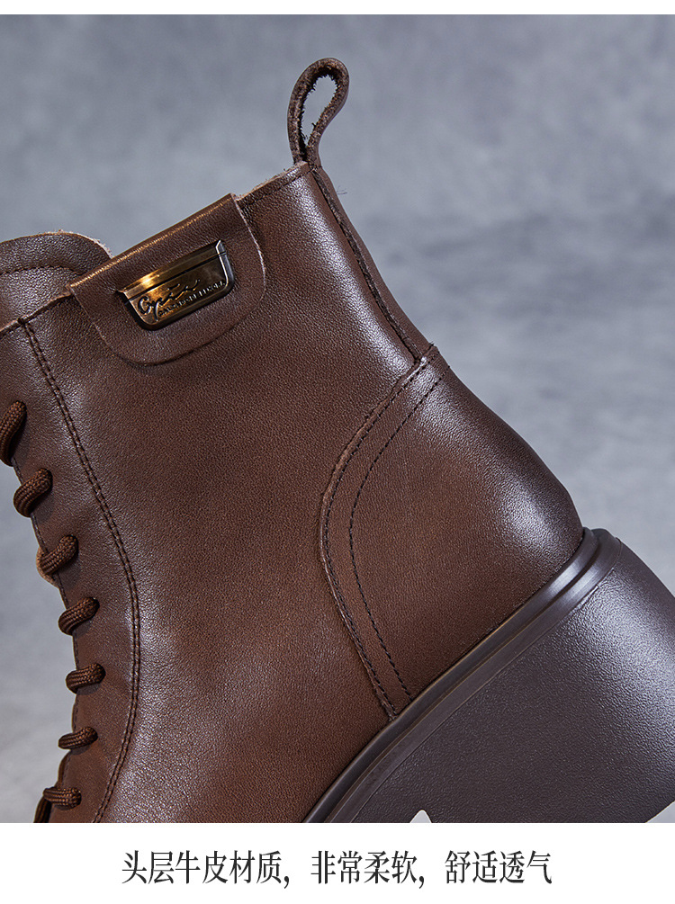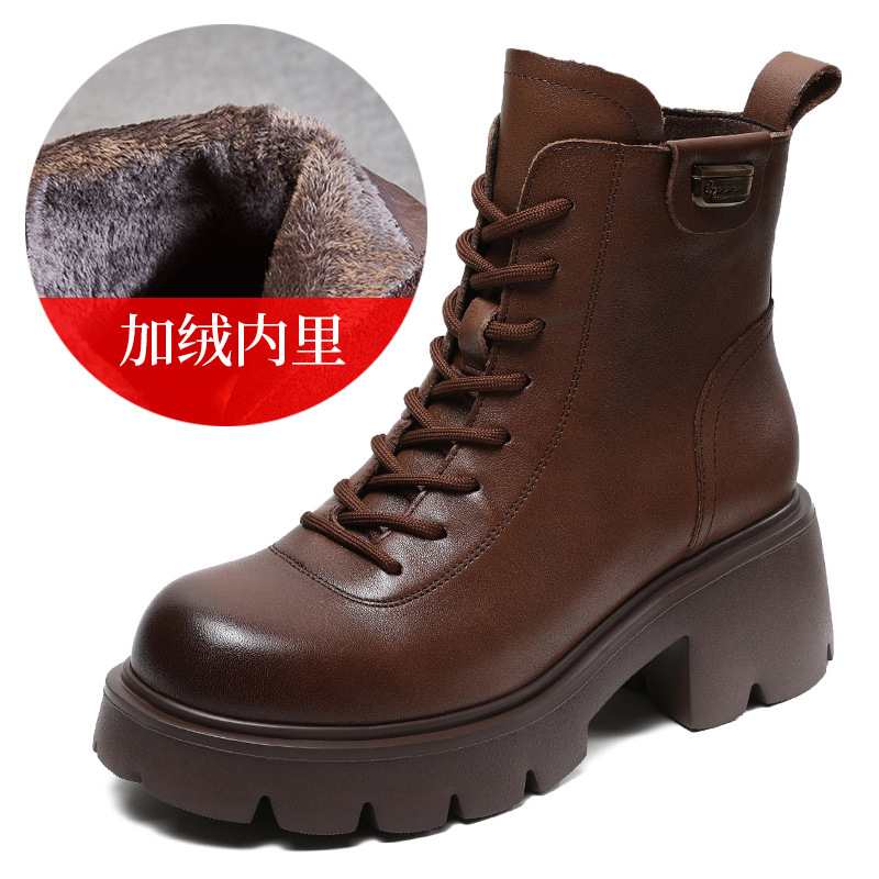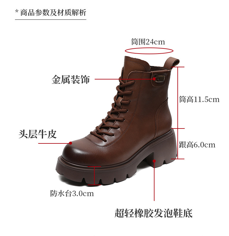 탑 레이어 소가죽 두꺼운 굽 두꺼운 밑창 영국 스타일 마틴 부츠 23 가을과 겨울 새로운 기모 레이스업 미드 튜브 숏부츠 가죽 코튼 부츠