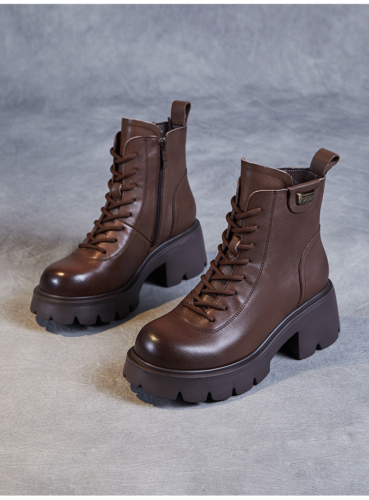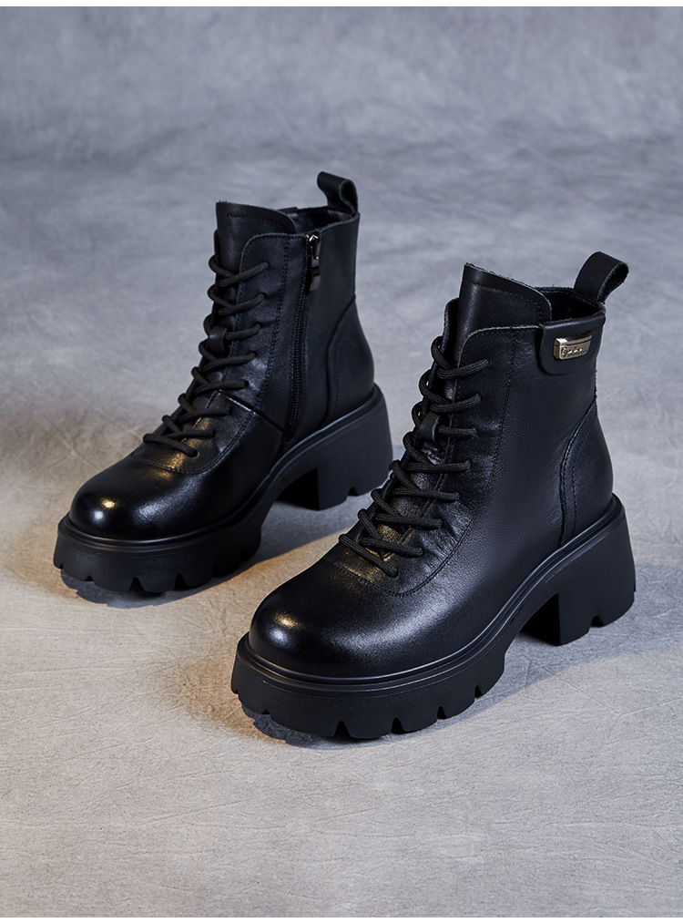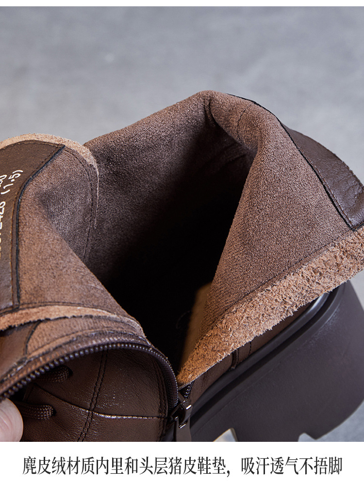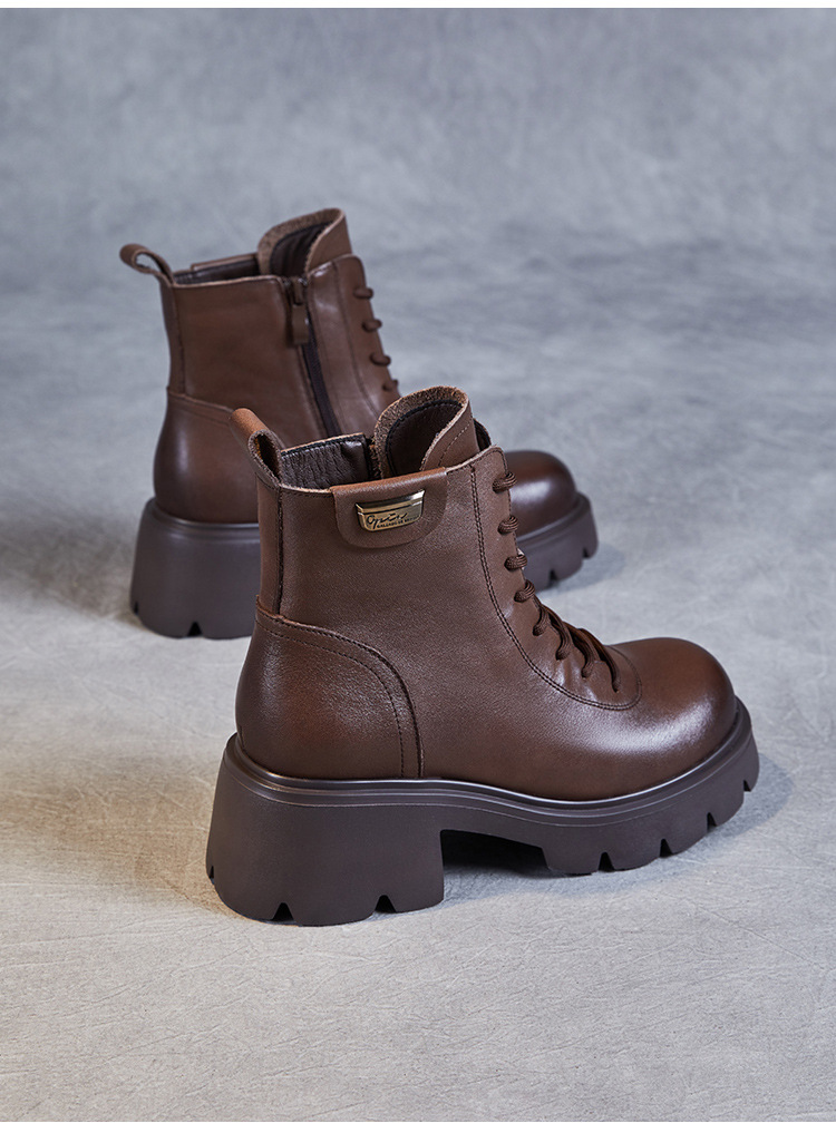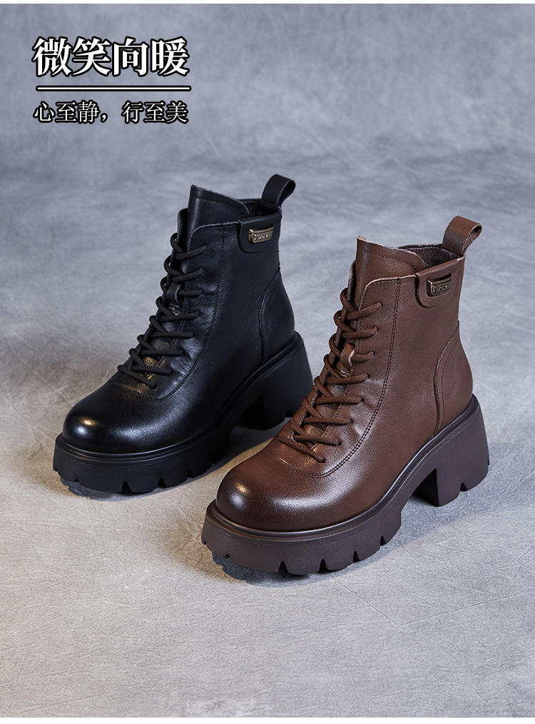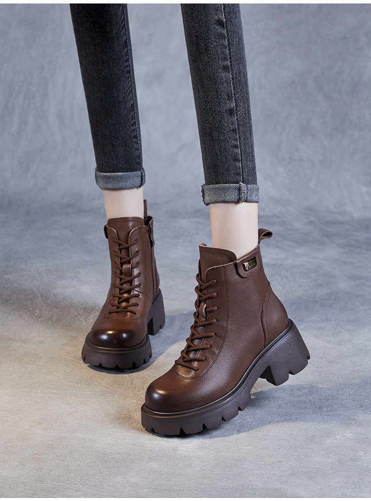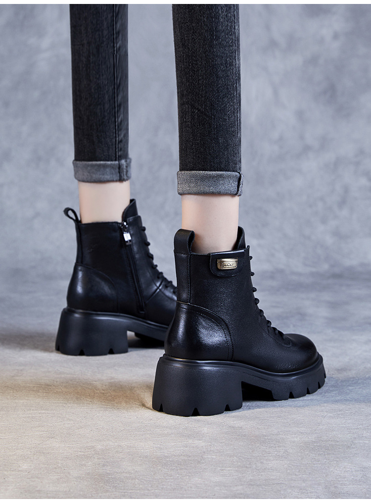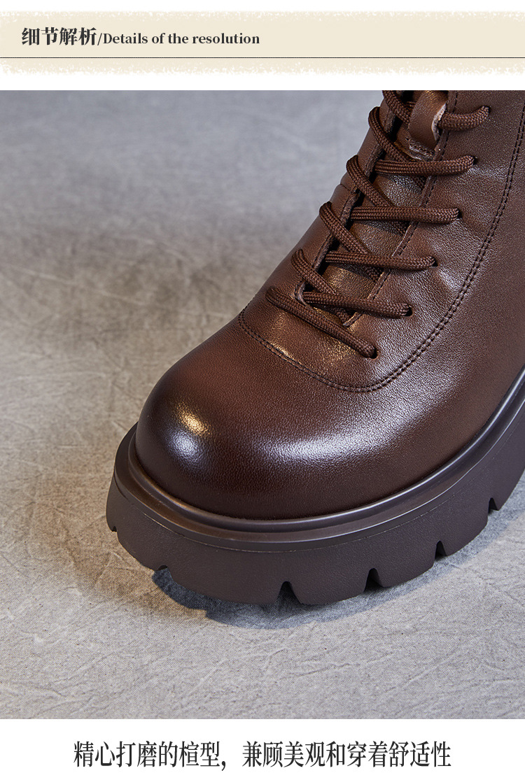 탑 레이어 소가죽 두꺼운 굽 두꺼운 밑창 영국 스타일 마틴 부츠 23 가을과 겨울 새로운 기모 레이스업 미드 튜브 숏부츠 가죽 코튼 부츠