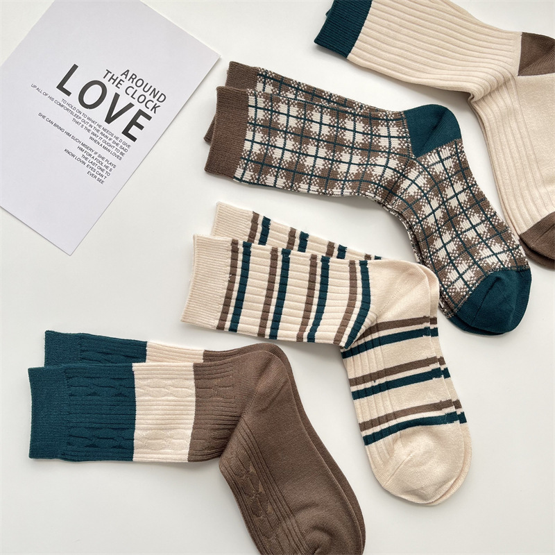 가을과 겨울 색상 차단 소프트 캐시미어 양말 여성용 일본식 빈티지 격자 무늬 중간 길이 양말 스트라이프 다크 브라운 스택