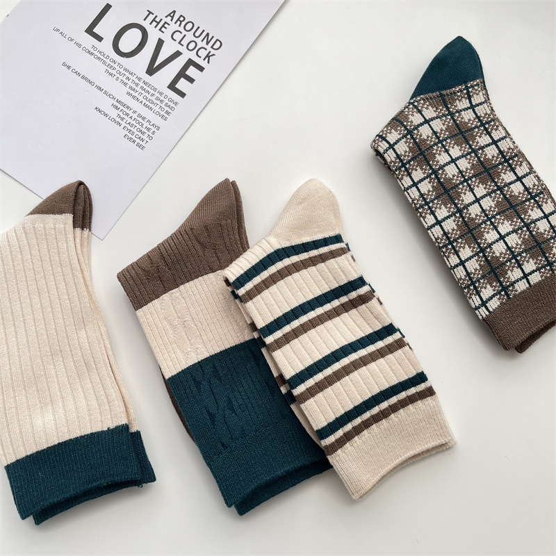가을과 겨울 색상 차단 소프트 캐시미어 양말 여성용 일본식 빈티지 격자 무늬 중간 길이 양말 스트라이프 다크 브라운 스택스토어 가기