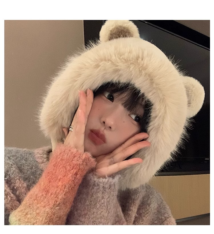 한국 스타일 귀여운 레이 펑 모자 여자의 가을과 겨울 곰 귀 푹신한 모자 기모 두꺼운 승마 감기 방지 귀 보호 모자