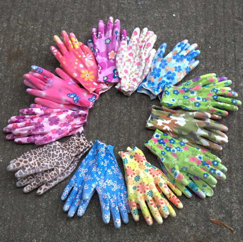내마모성 인쇄 Pu 접착제 디핑 접착제 팜 컬러 얇은 통기성 정원 심기 작업 노동 보호 장갑스토어 가기