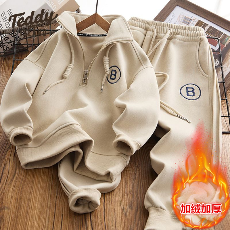 어린이 가을과 겨울 스타일 잘 생긴 중대형 어린이 기모 두꺼운 스웨터 바지 투피스 세트 2023 통통한 어린이를위한 느슨한 스포츠 세트스토어 가기