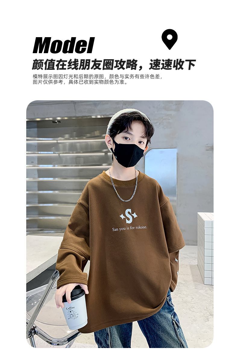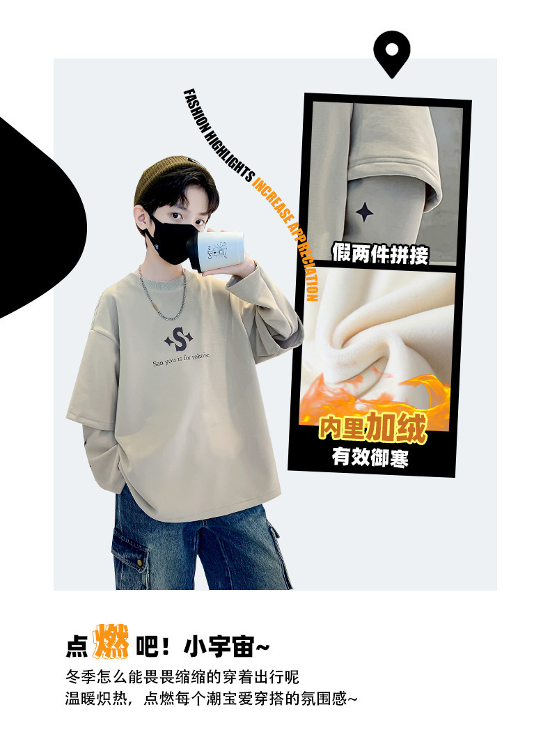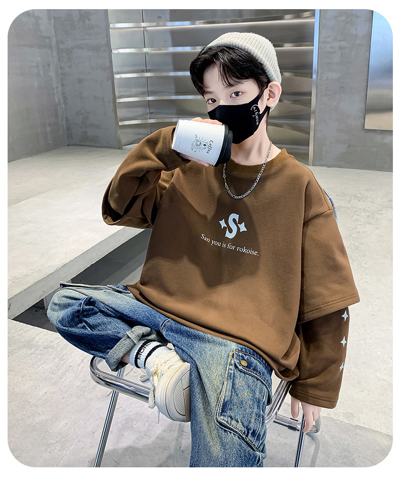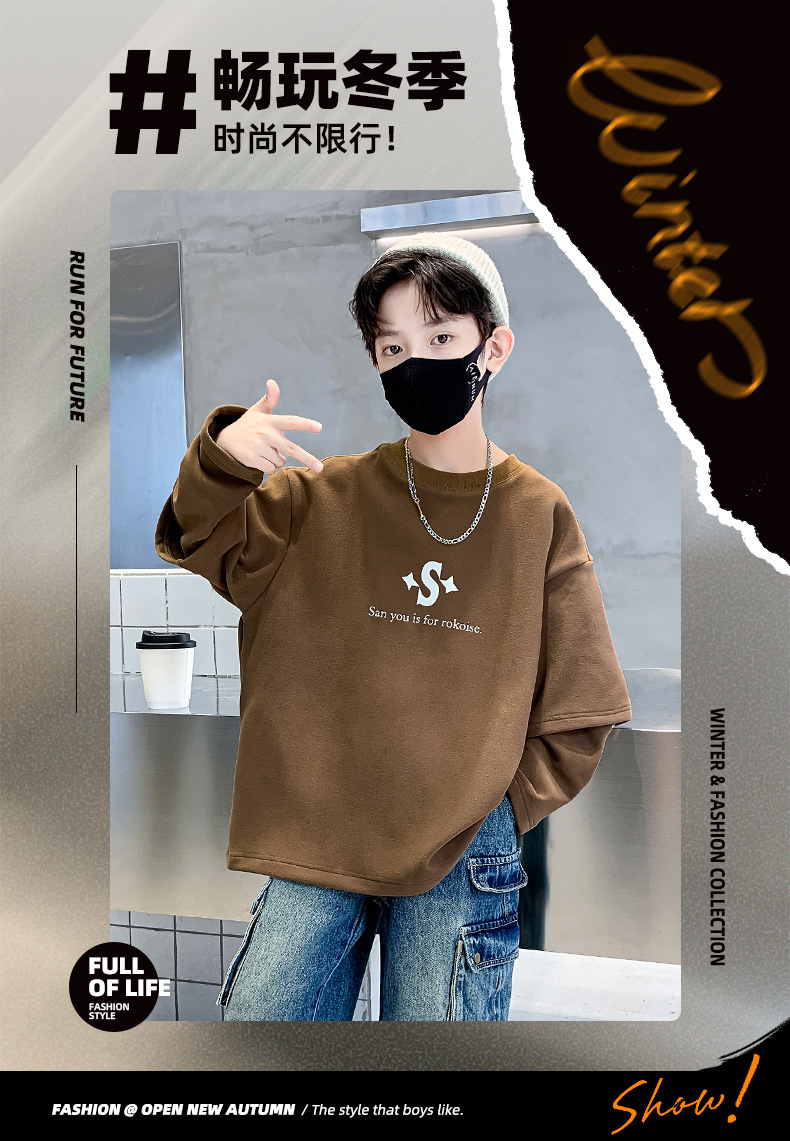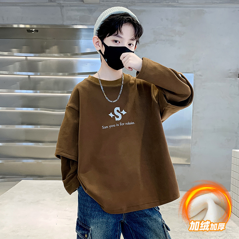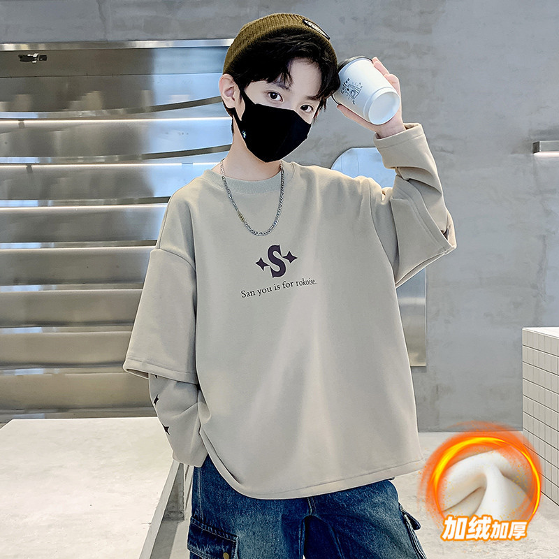 남아용 페이크 투피스 벨벳 스웨트셔츠, 라운드넥, 긴팔, 한국 스타일 다용도 상의, 2024년 신상 중대형 아동 가을 겨울 의류스토어 가기