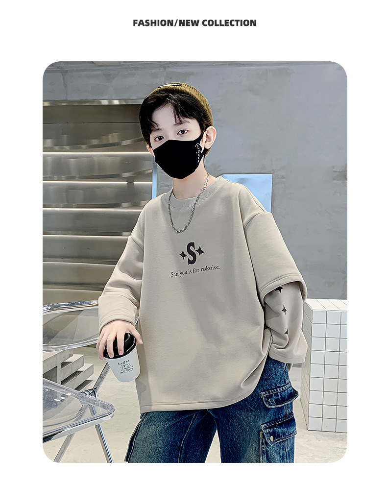 남아용 페이크 투피스 벨벳 스웨트셔츠, 라운드넥, 긴팔, 한국 스타일 다용도 상의, 2024년 신상 중대형 아동 가을 겨울 의류