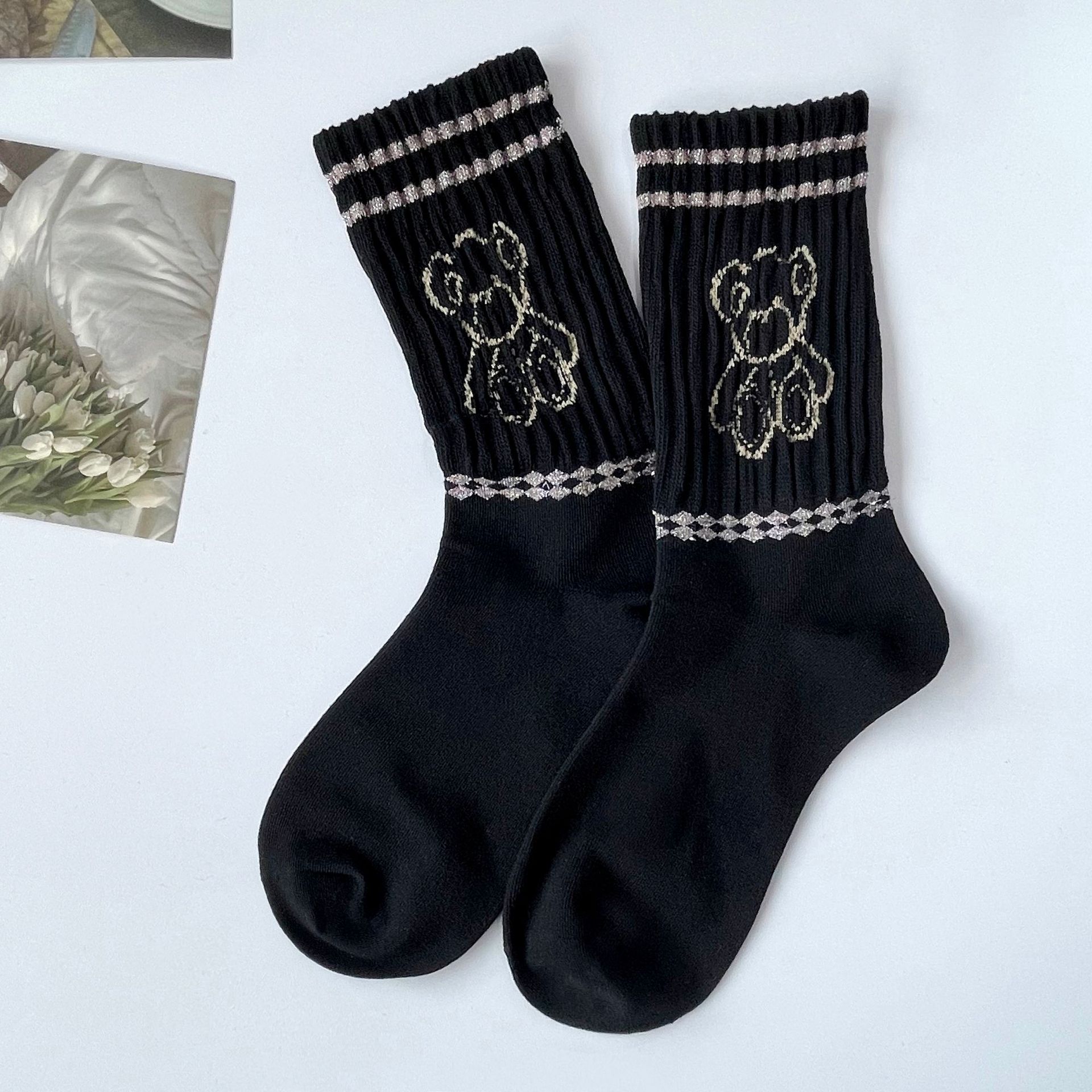 Ziyang 가을과 겨울 새로운 여성 양말 만화 곰 양말 아카데미 스타일 INS 유행 양말 사이버 연예인 더미 양말 검은 면 양말스토어 가기