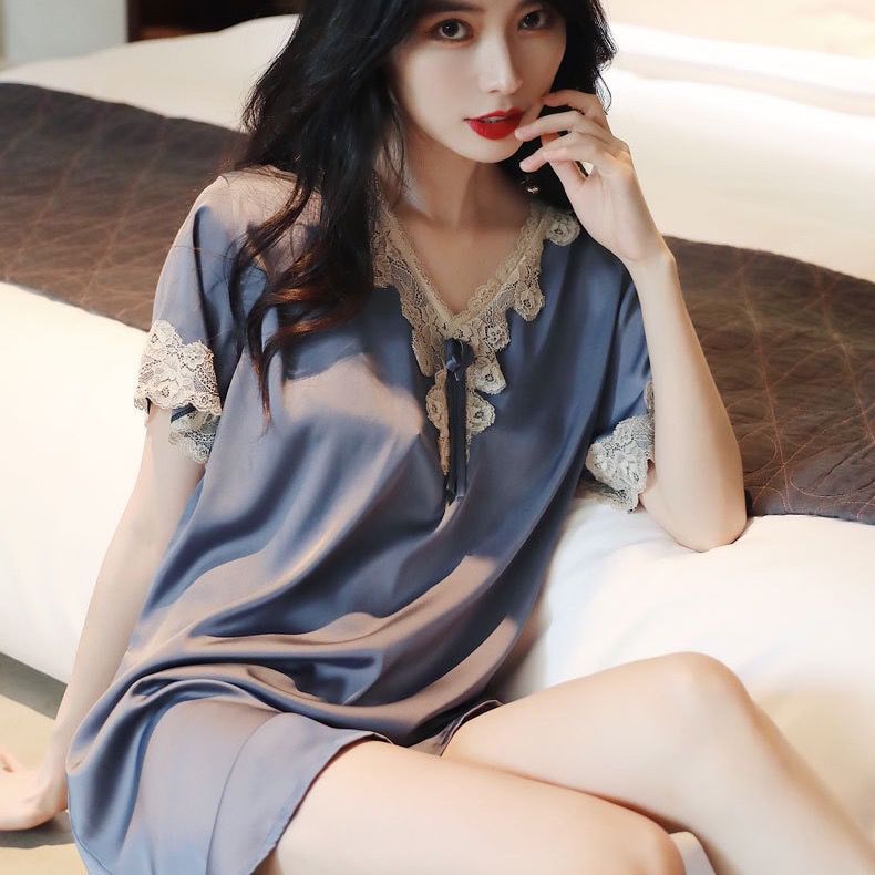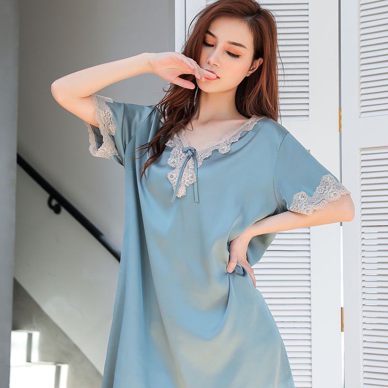 새로운 잠옷 여자의 여름 얼음 실크 느슨한 플러스 사이즈 유럽과 한국 스타일 섹시한 레이스 실크 짧은 소매 잠옷 새틴 가정 옷스토어 가기
