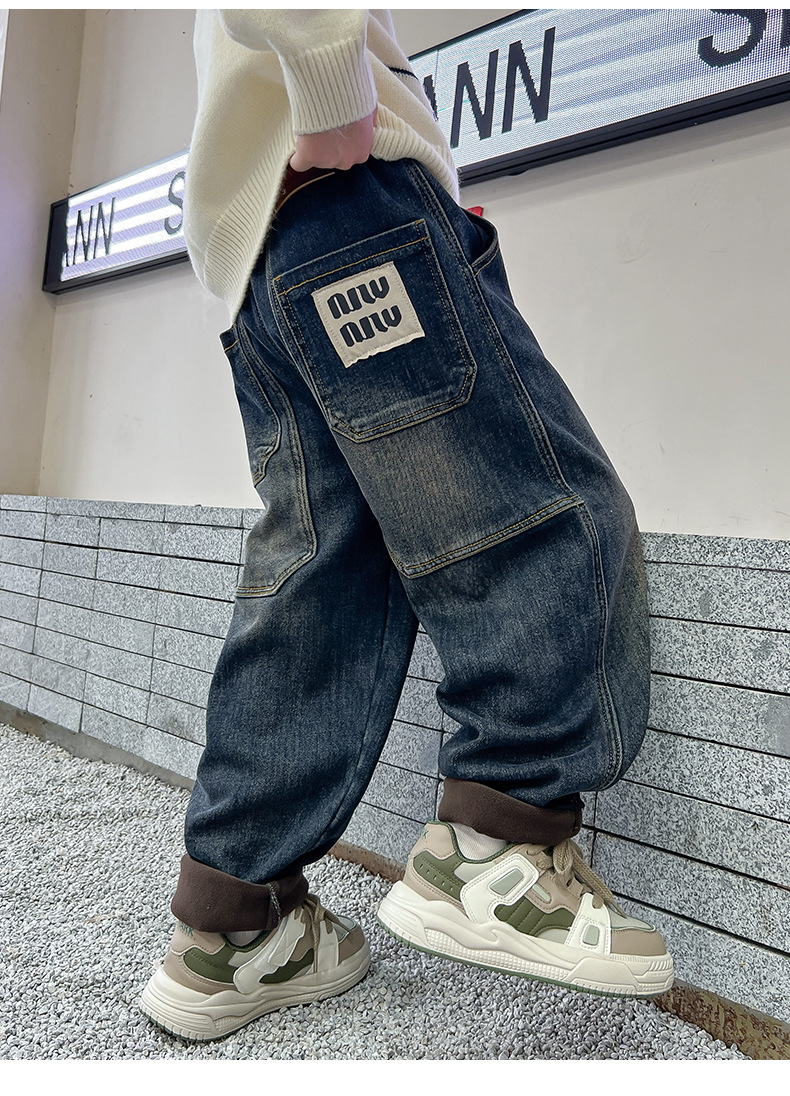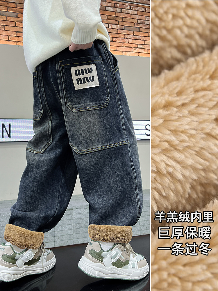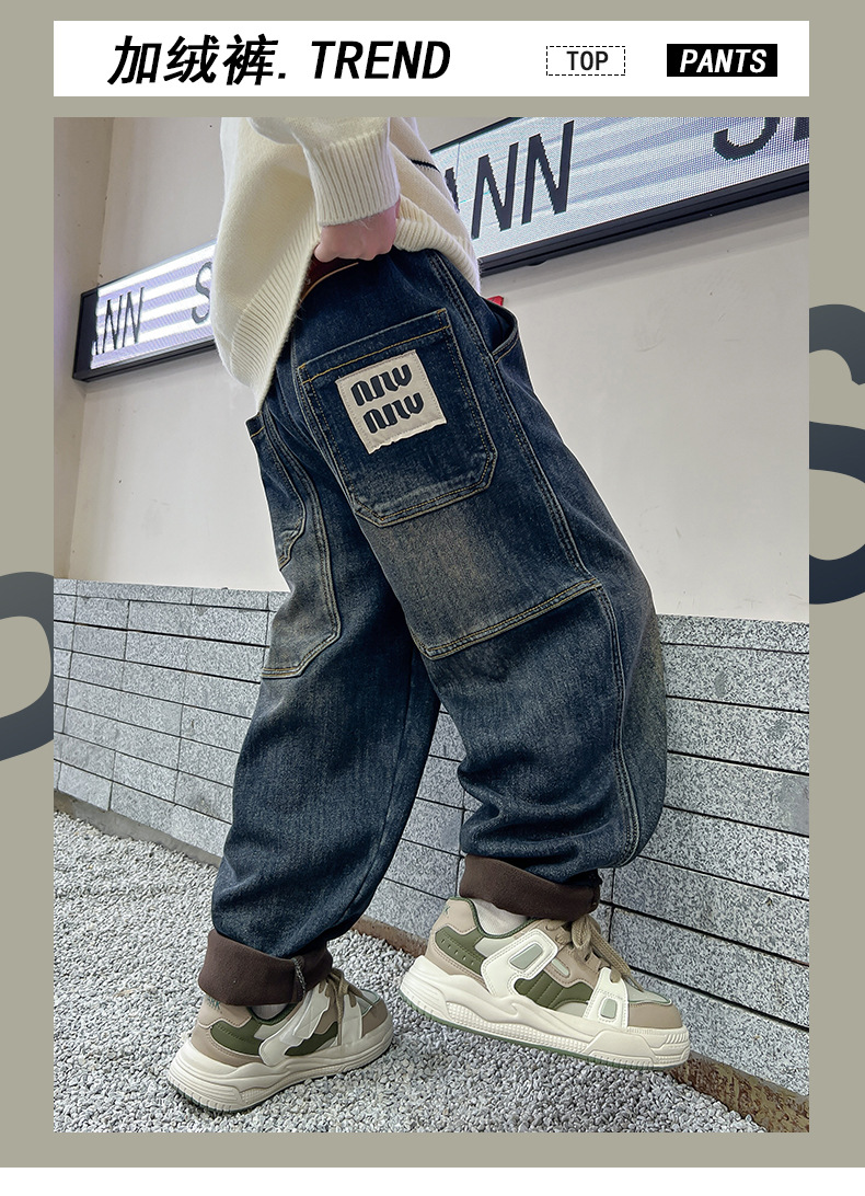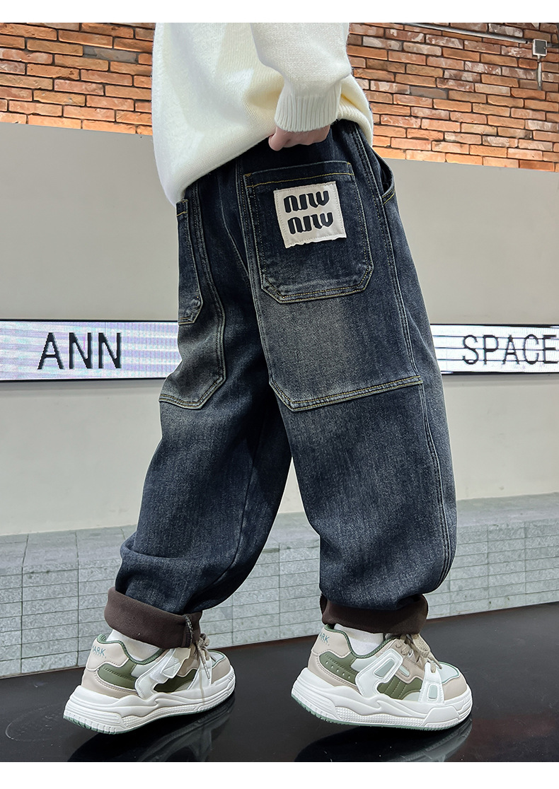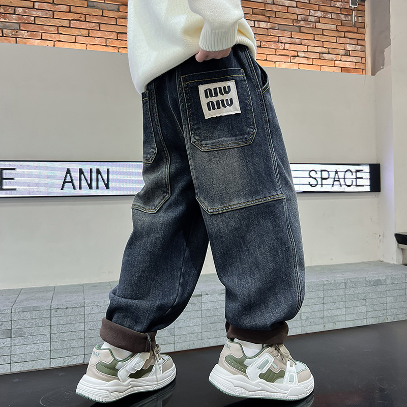 아동복 남아 겨울옷 기모 안감 두꺼운 청바지 2025 신상 남자아이 겨울 일체형 기모 바지 캐주얼 트렌디스토어 가기