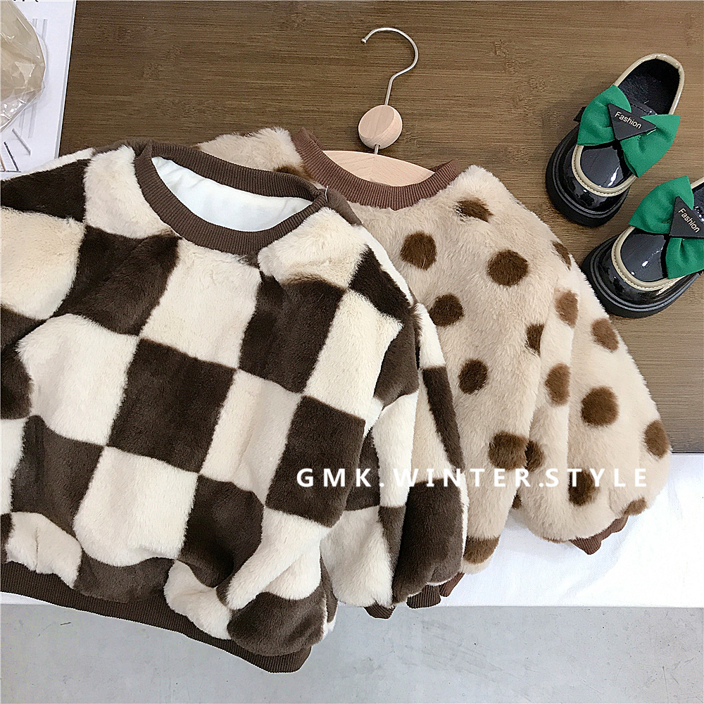여아 웨이브 도트 체크 무늬 푹신한 스웨터 아동용 두꺼운 베이비 탑 가을과 겨울 남아 원피스 푹신한 스웨터 트렌디