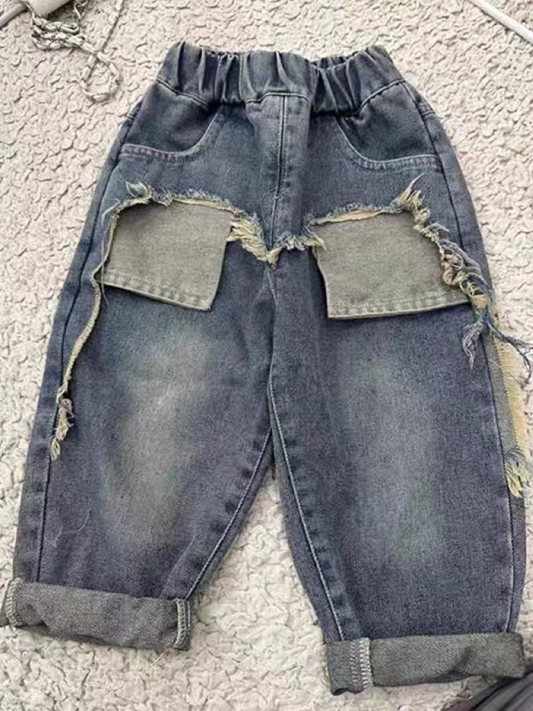 피슈아이 아동 청바지 스트레이트 팬츠 일본식 루즈 찢어진 워싱 남아 중대형 아동 청바지 스트리트 패션 쿨스토어 가기