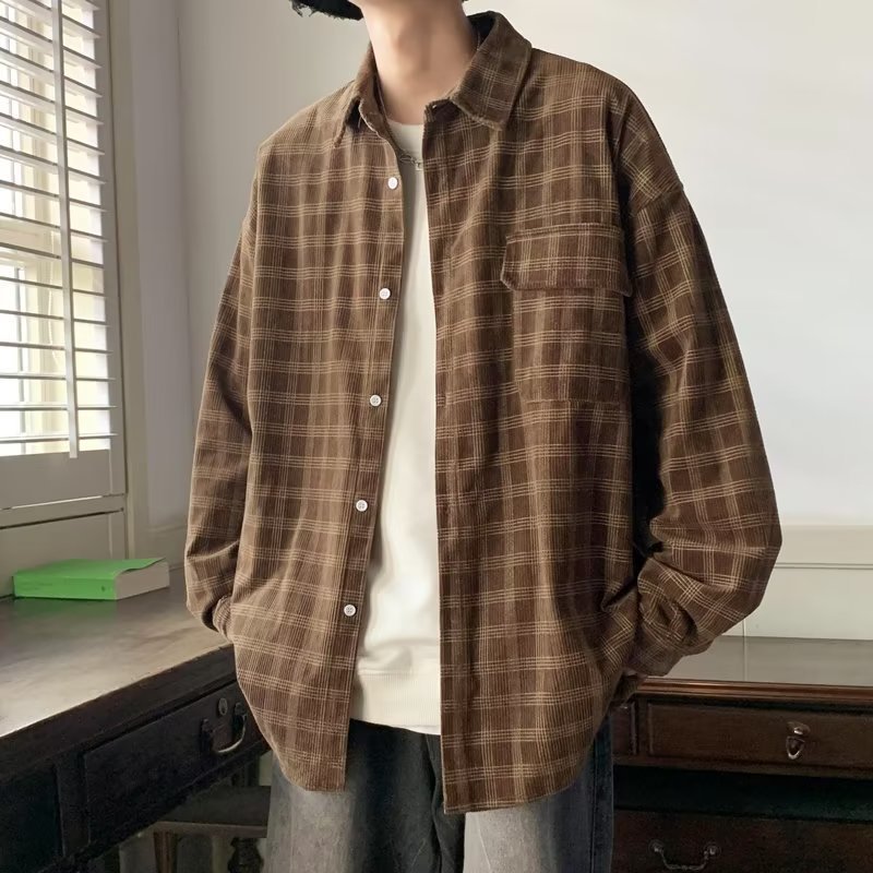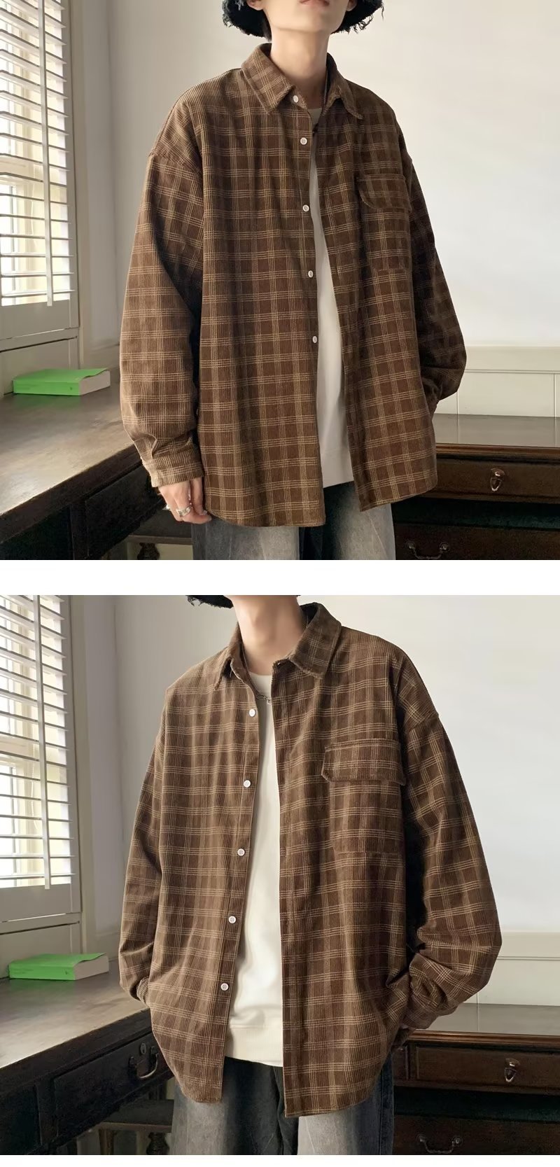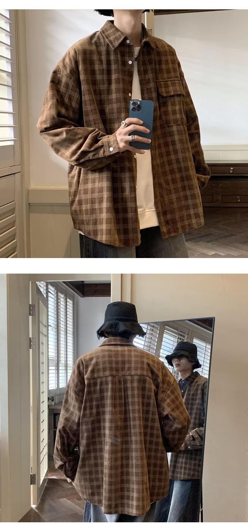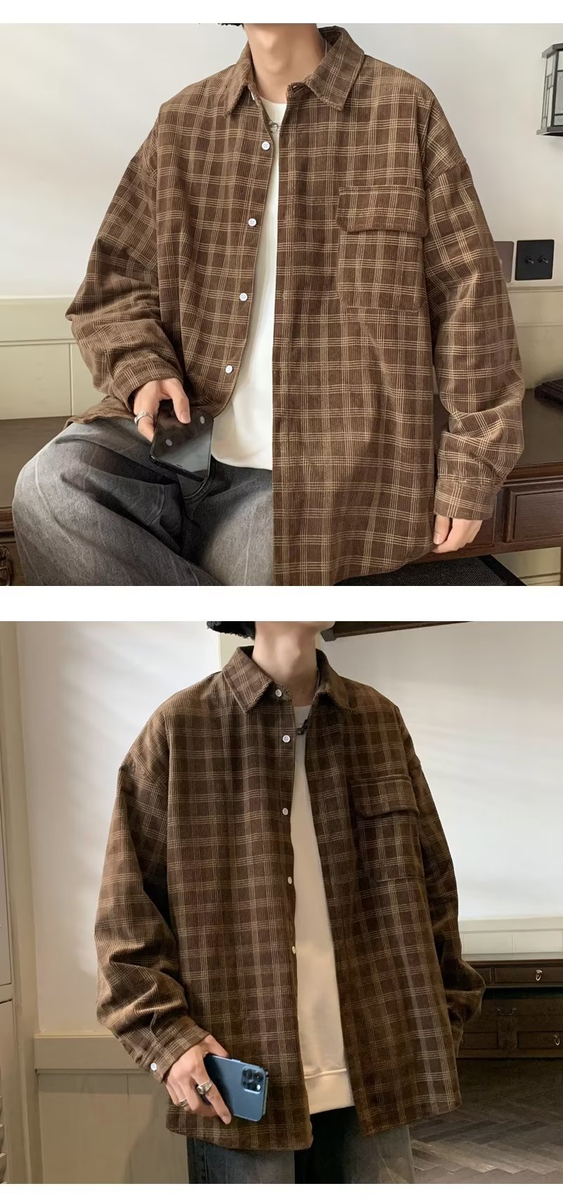 격자 무늬 긴팔 셔츠 남자의 봄과 가을 일본 캐주얼 셔츠 고급 감각 Ruffian 잘 생긴 유행 남자의 코듀로이 재킷스토어 가기